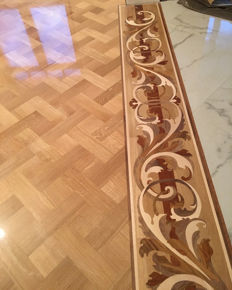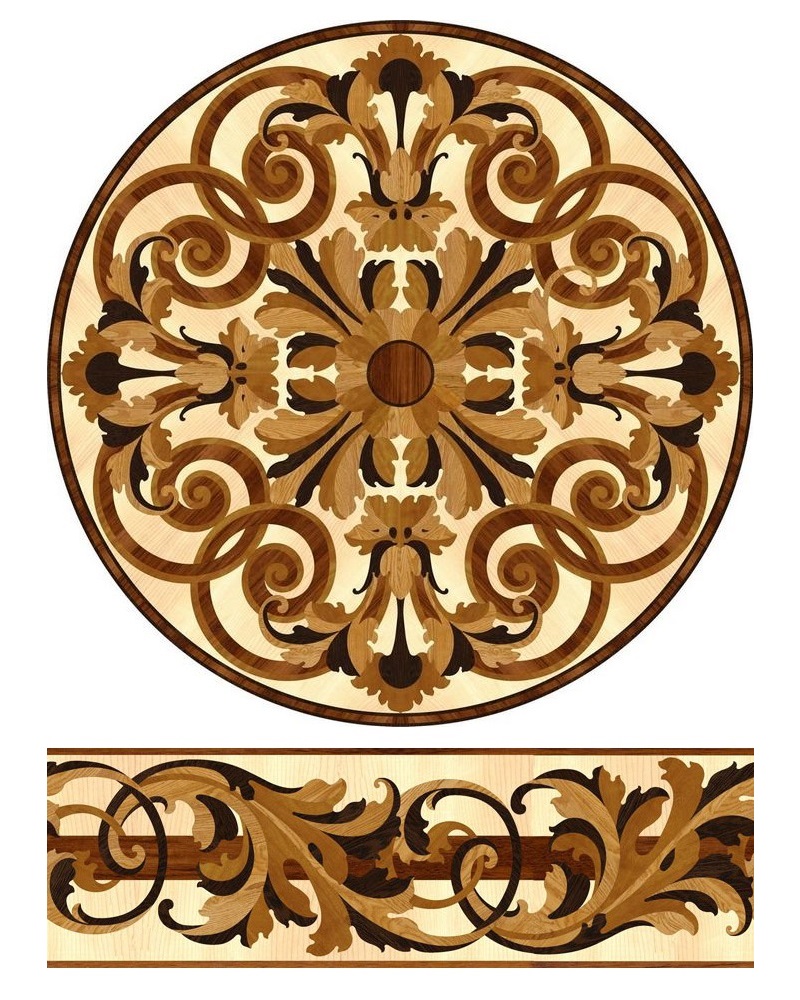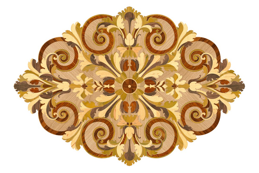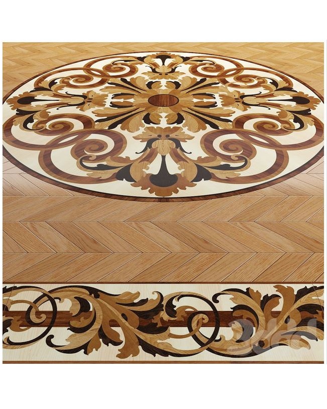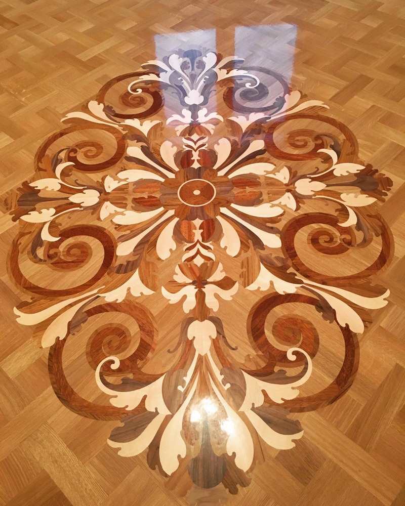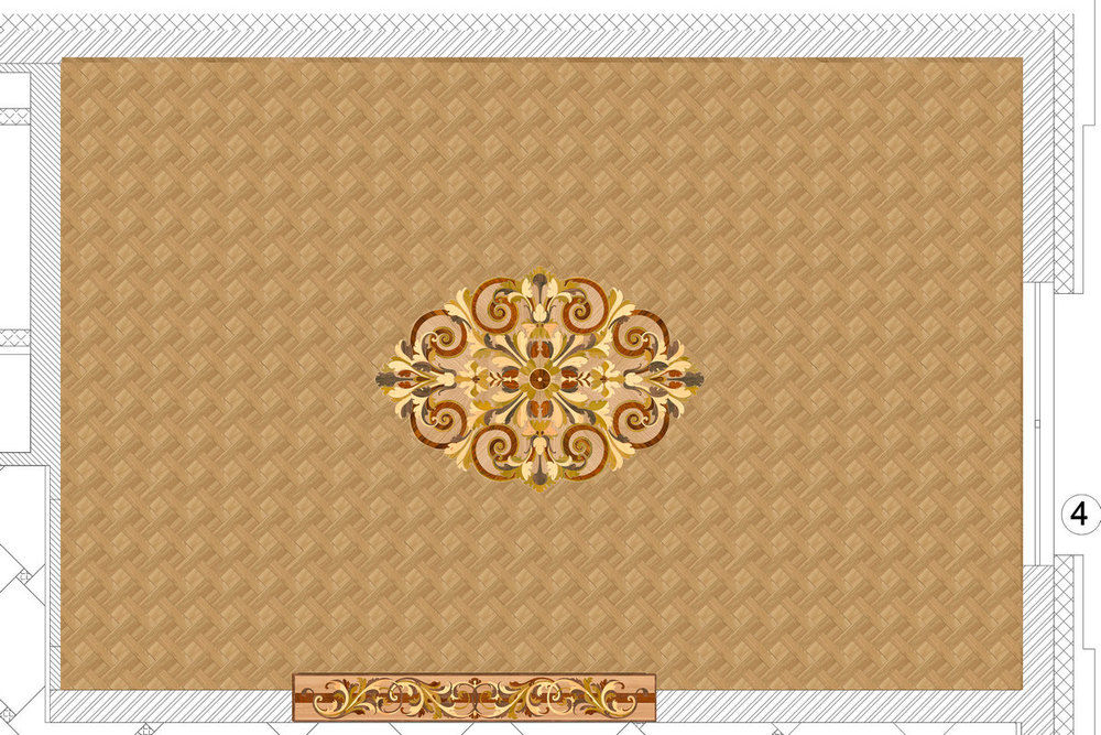 Компания «Вернисаж» выполнила частный заказ по проектированию и укладке художественных элементов паркета, врезанных в геометрический рисунок «павловская плетенка». Проектирование производилось по предоставленному снимку круглой розетки и части цветочного фриза. По проекту требовалось изменить форму розетки на более вытянутую, используя рисунок.