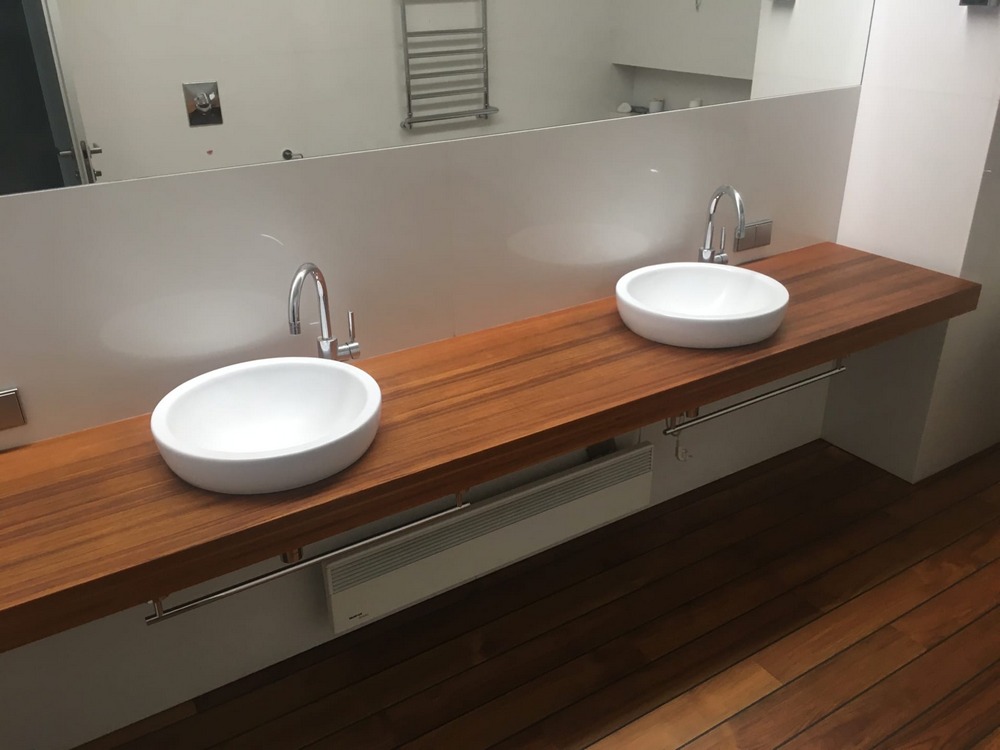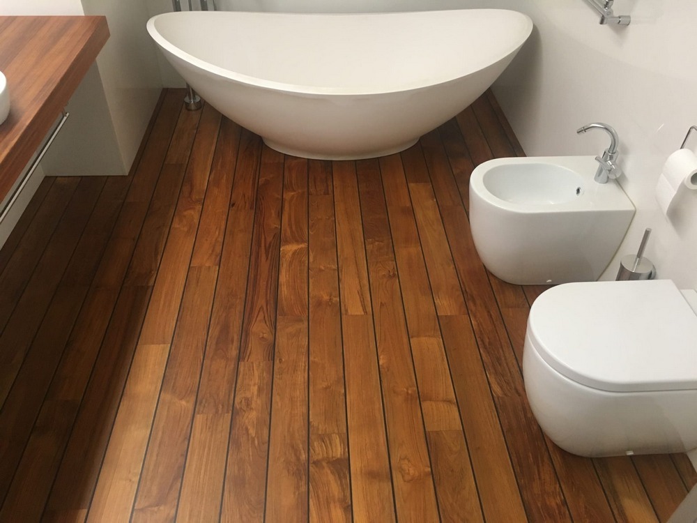 Компания «Вернисаж» выполнила частный заказ по укладке тиковой доски в ванной комнате. Тик, уложенный палубным способом (то есть через равные промежутки, заполненные эластичным составом), позволяет выдерживать сплошное затопление до семи дней без серьезных изменений геометрии. Эти изменения восстанавливаются при дальнейшей сушке.