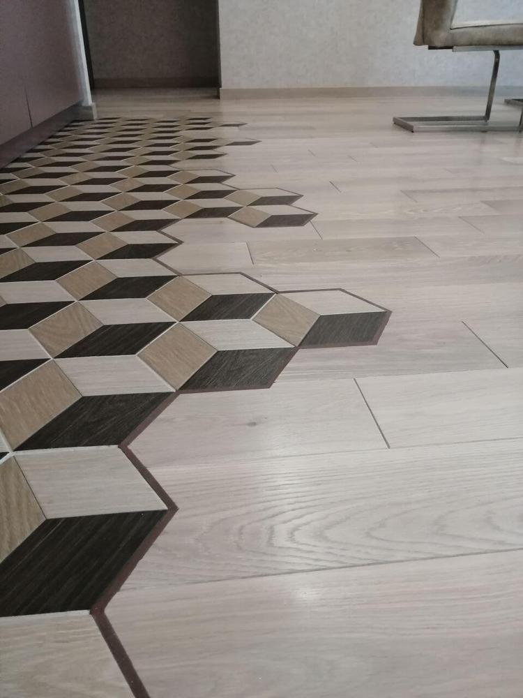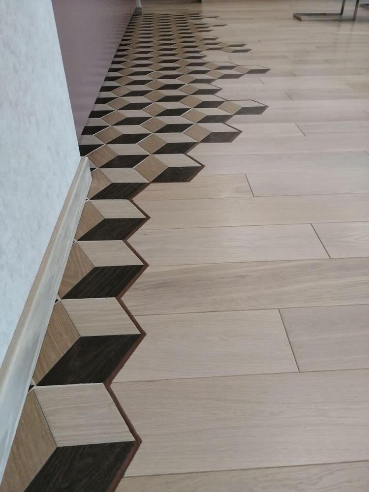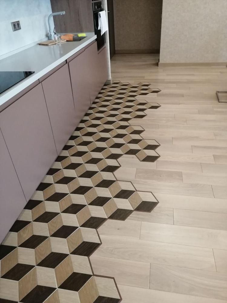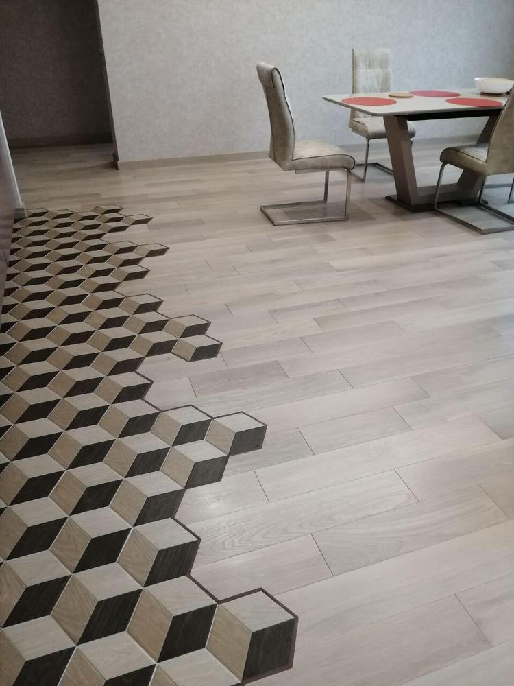 - Стыковка инженерной доски с плиткой (гексагоны) с применением полиуретанового цветного упруго-эластичного герметика