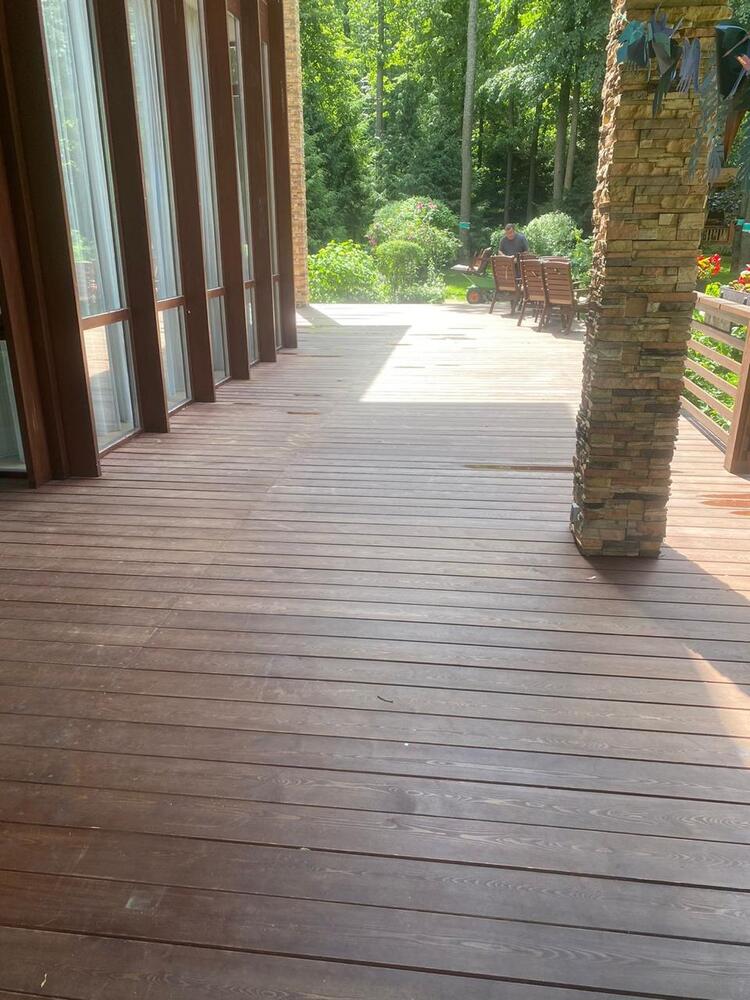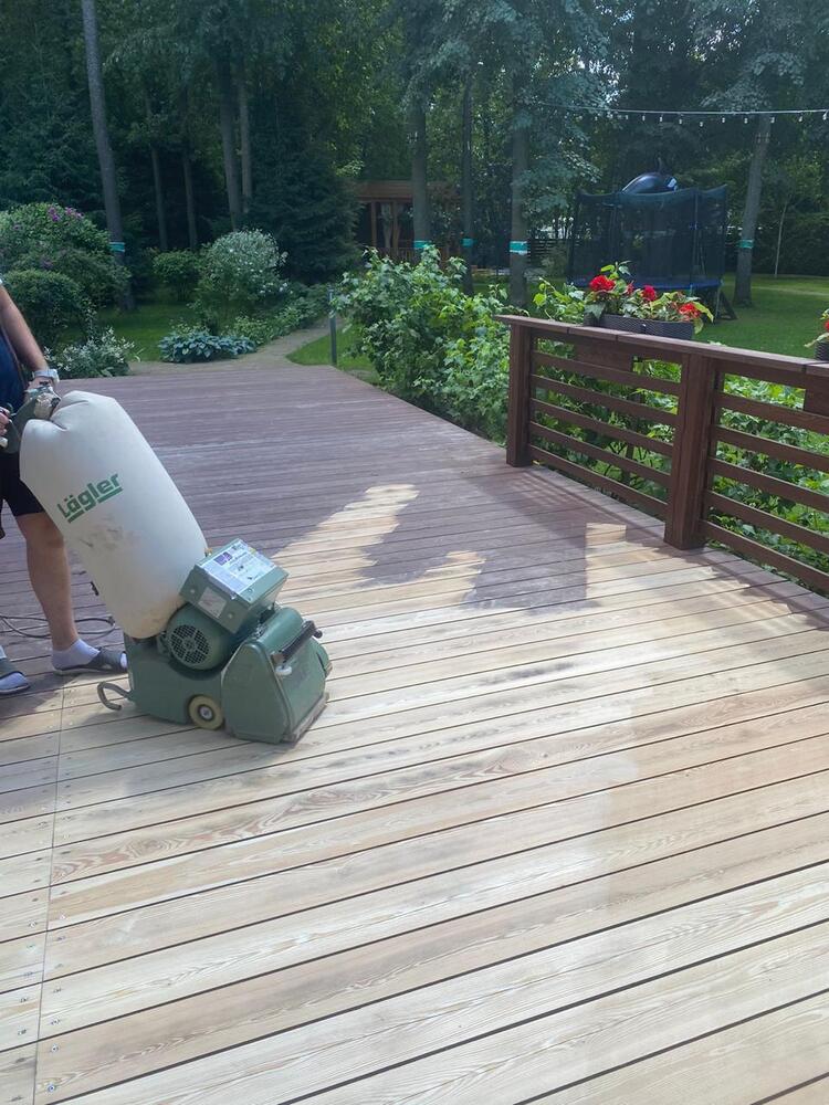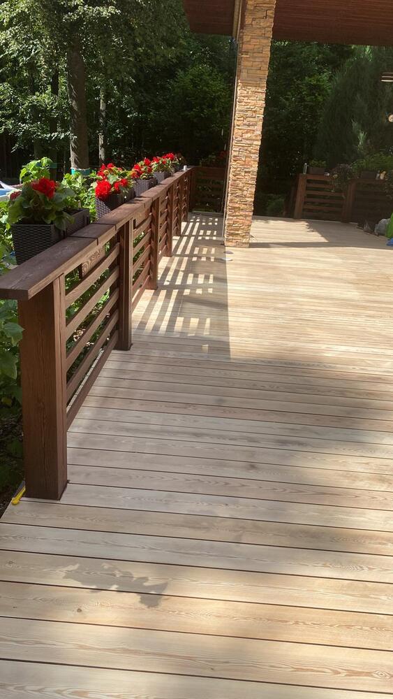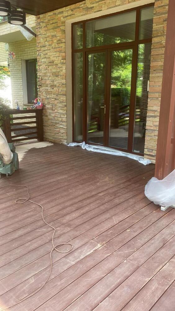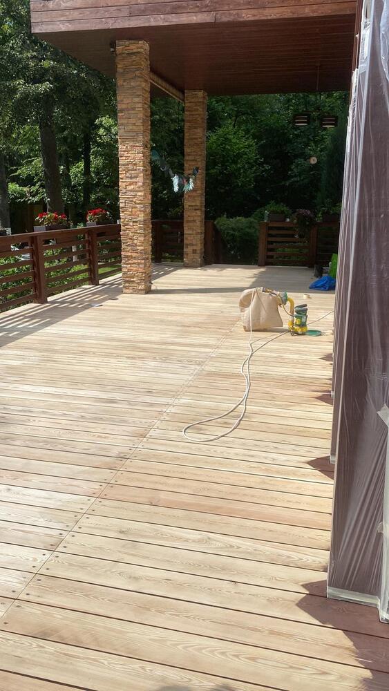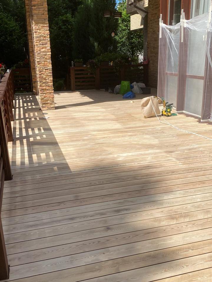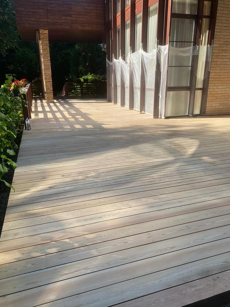 Мастера компании «Вернисаж» выполнили обновление и шлифовку террасы из лиственницы в коттеджном поселке «Променад» в Москве.