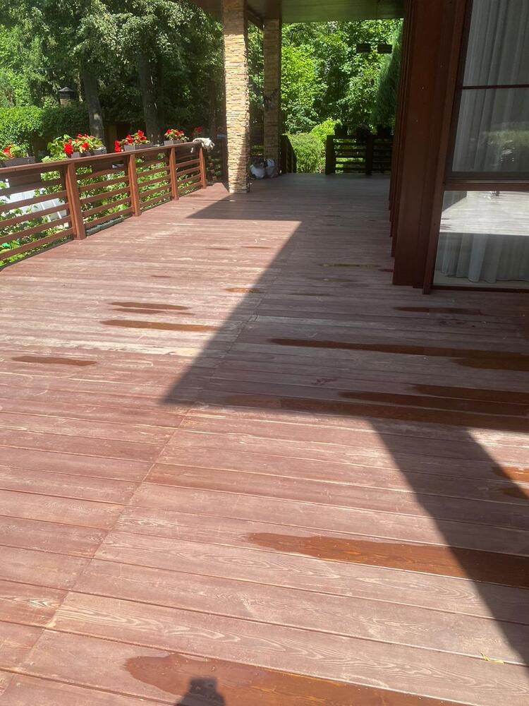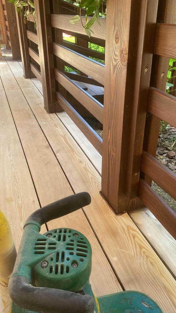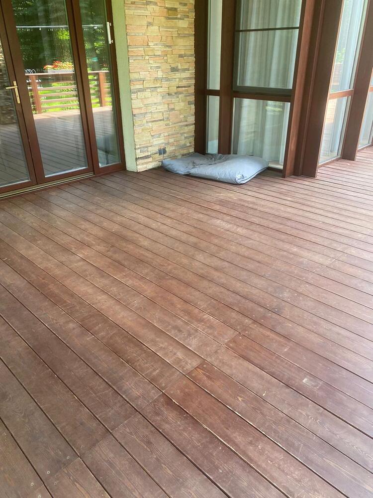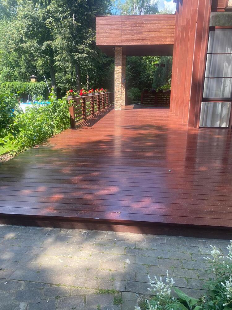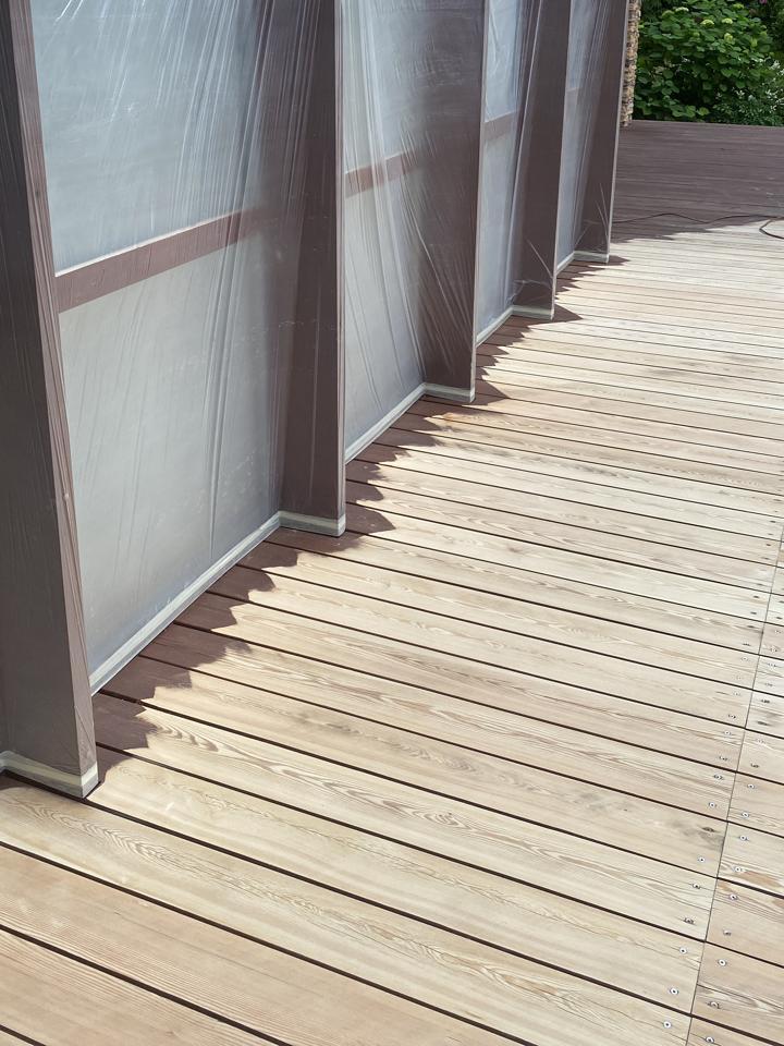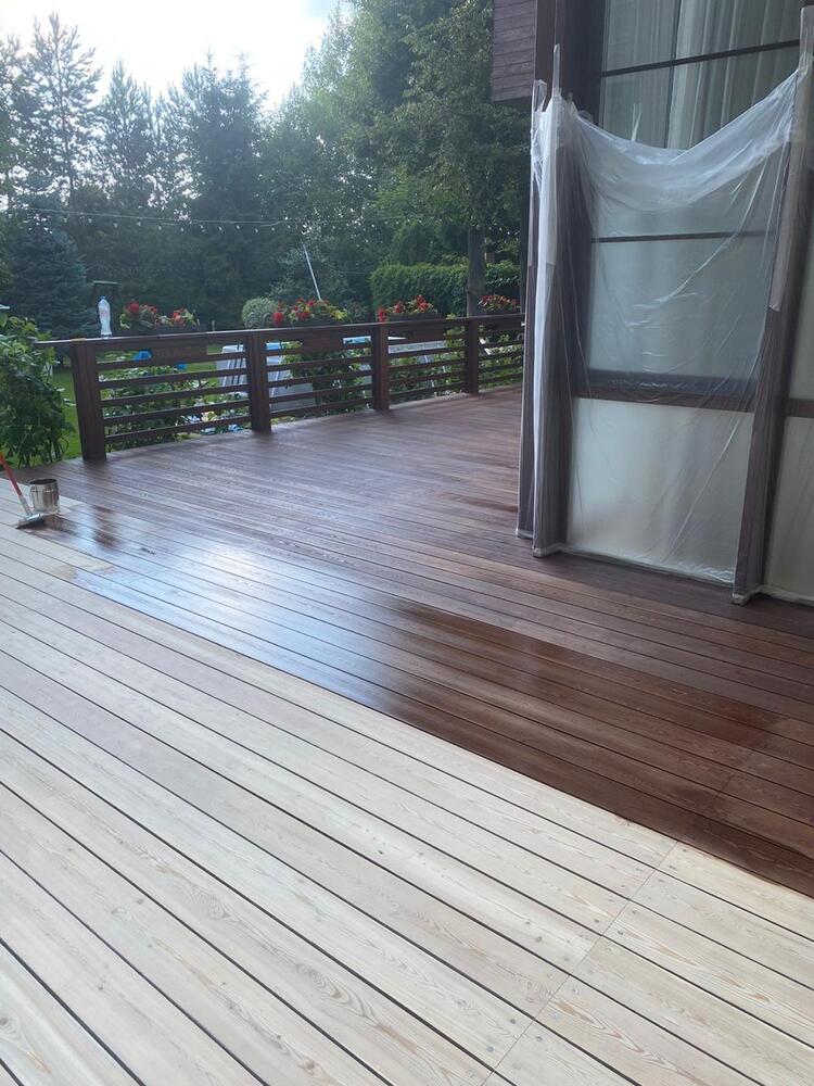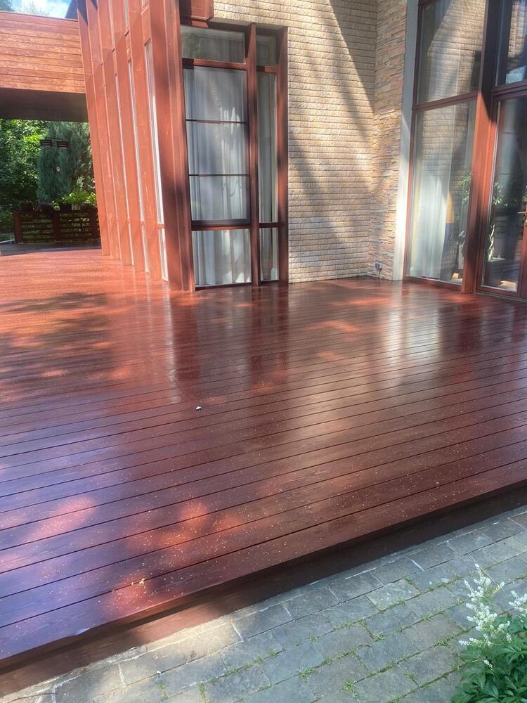 Мастера компании «Вернисаж» выполнили обновление и шлифовку террасы из лиственницы в коттеджном поселке «Променад» в Москве.