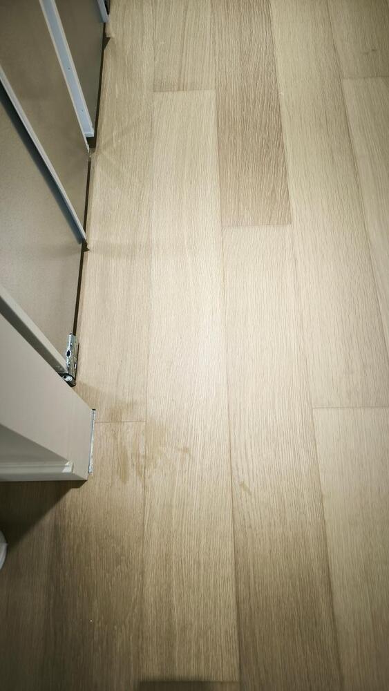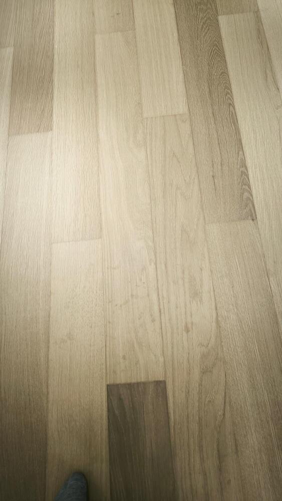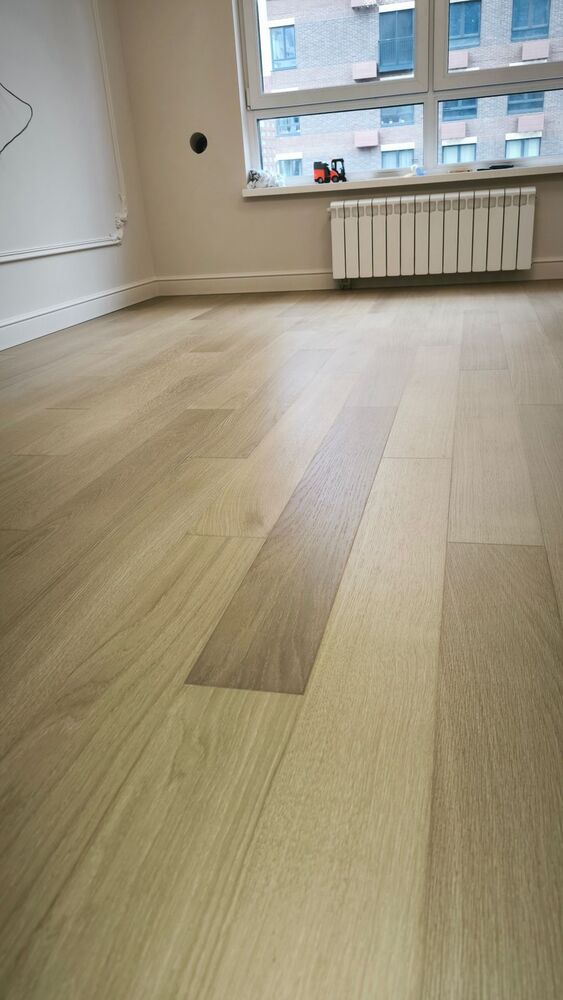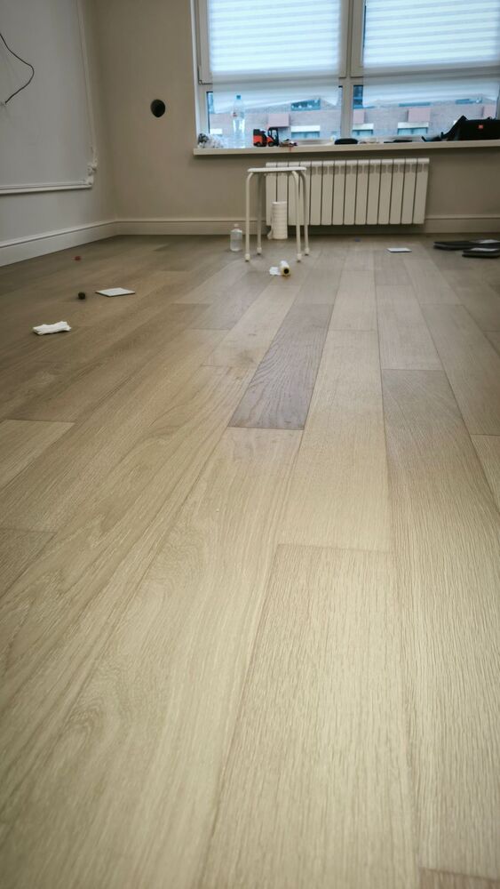 Многочисленные следы двухкомпонентного клея остались на кварцевом паркете после укладки. Реставраторы успешно справились с задачей.