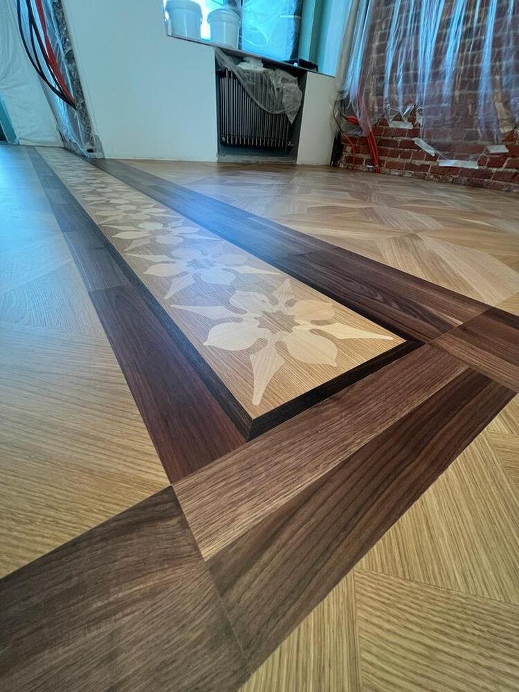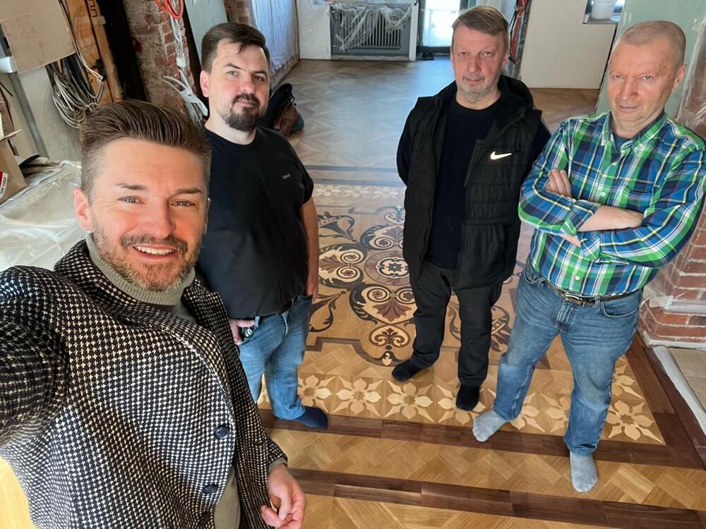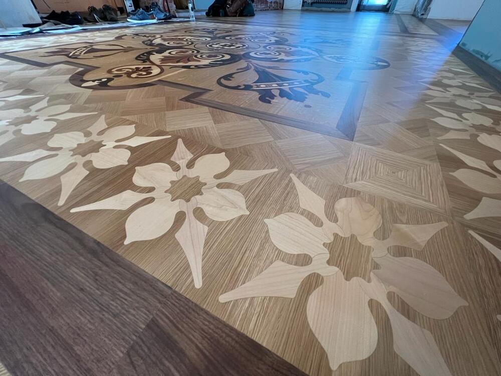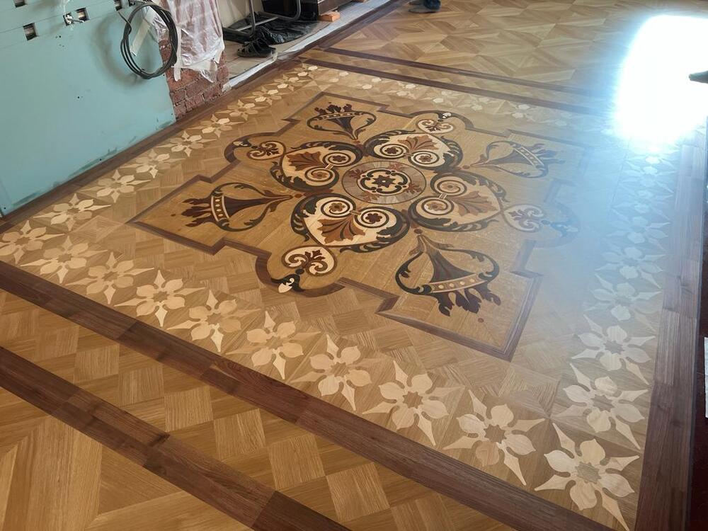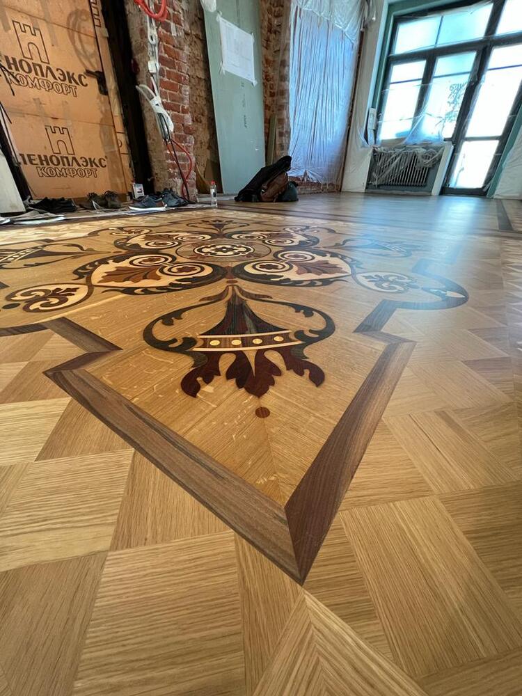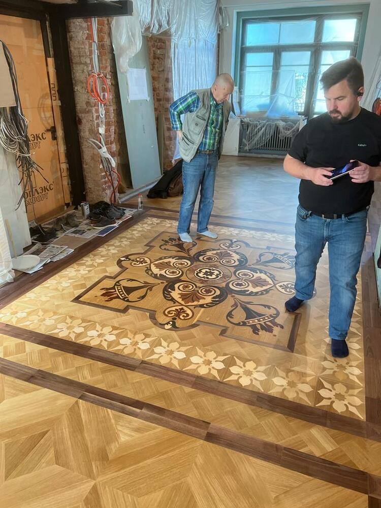 Закончен объект по ремонту исторического паркета в самом центре Москвы, недалеко от храма Христа Спасителя, где специалисты компании «Вернисаж» делали очень нестандартную работу. Сам по себе объект очень небольшой, порядка 51 кв.м по паркету. Но работа была непростая, потому что у клиента стояла задача сохранить художественную розетку конца 19 века и фрагмент художественного бордюра, а все остальное мы сделали заново.