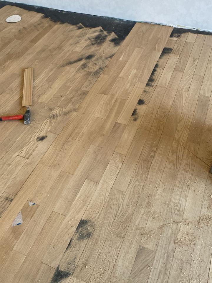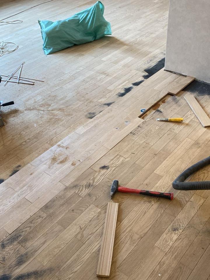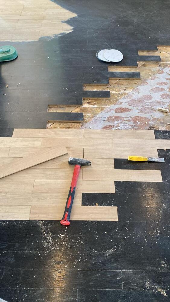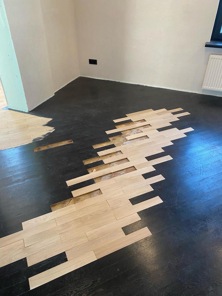 Мастера компании «Вернисаж» выполнили ремонт старого паркета на объекте в д. Подушкино Одинцовского района Московской области.