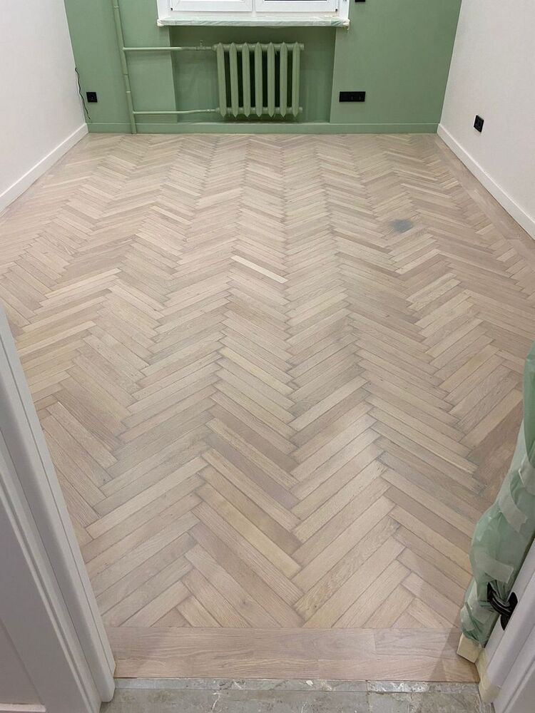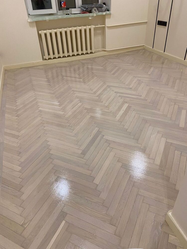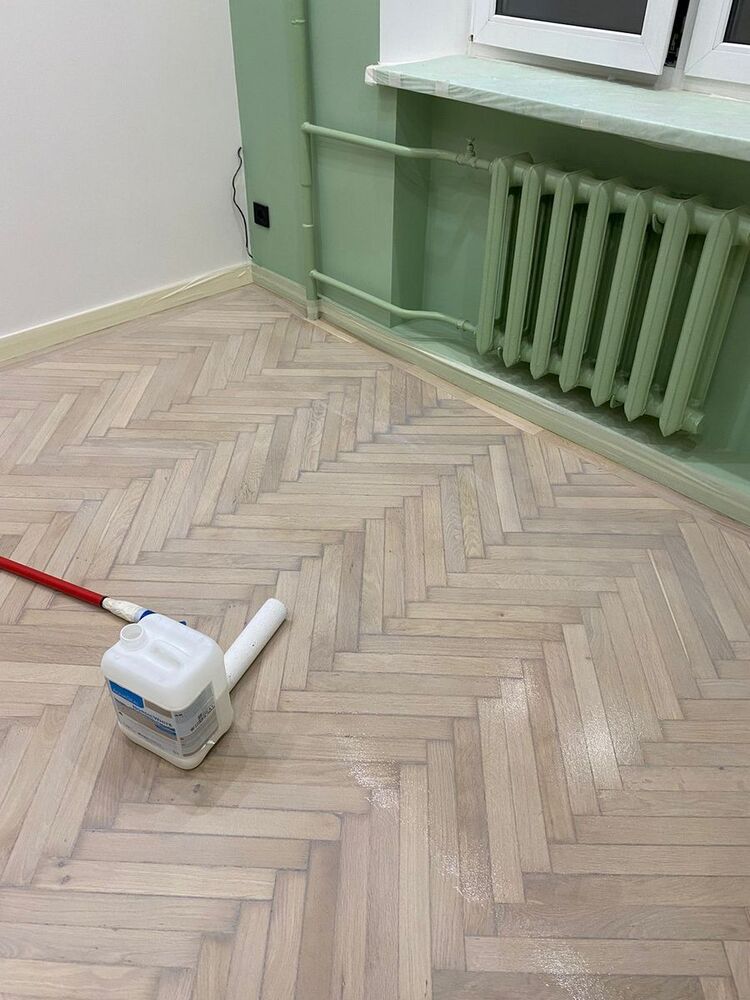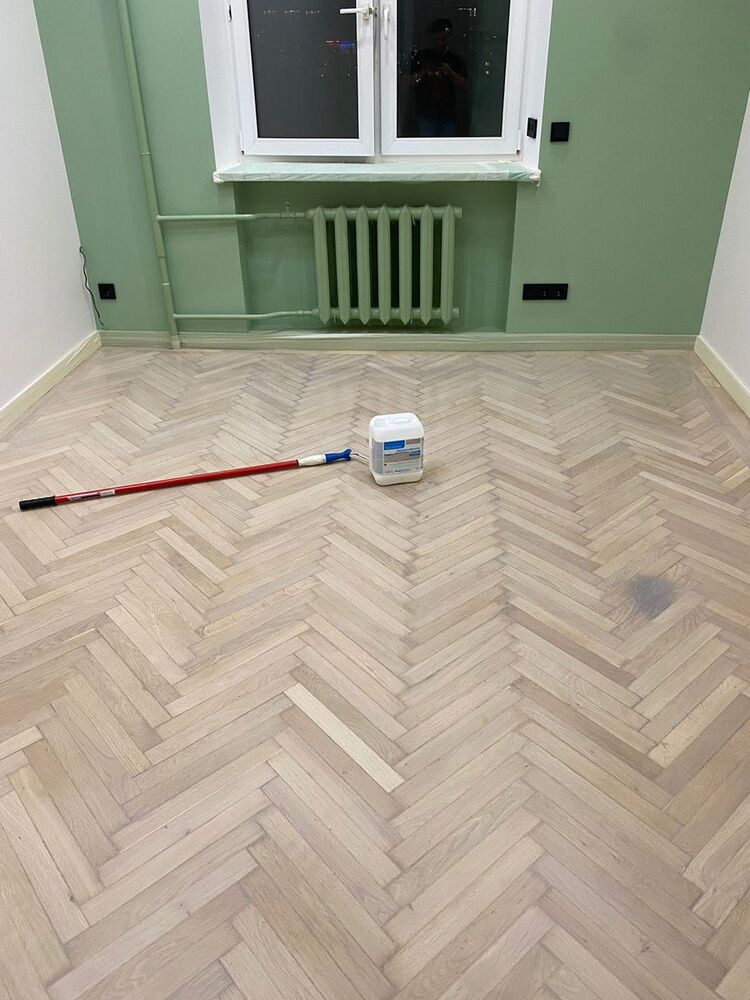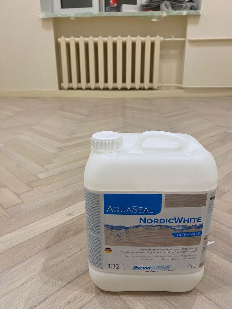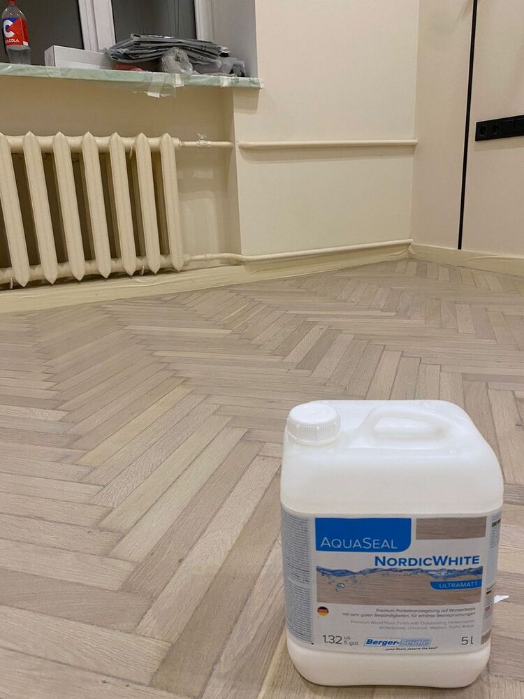 - покрытие паркета ультраматовым лаком Berger Nordic White в 7 слоев