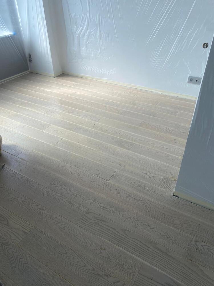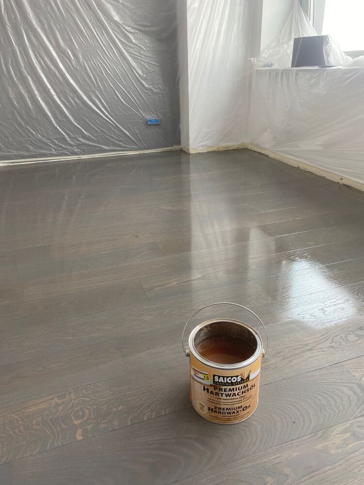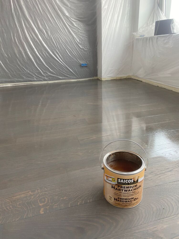 - тонировка паркета грунтовкой Saicos Ol-Grundierung арт. 3477 (Графит) + масло с твердым воском Saicos Premium Hartwachsöl арт. 3305 (Матовое)