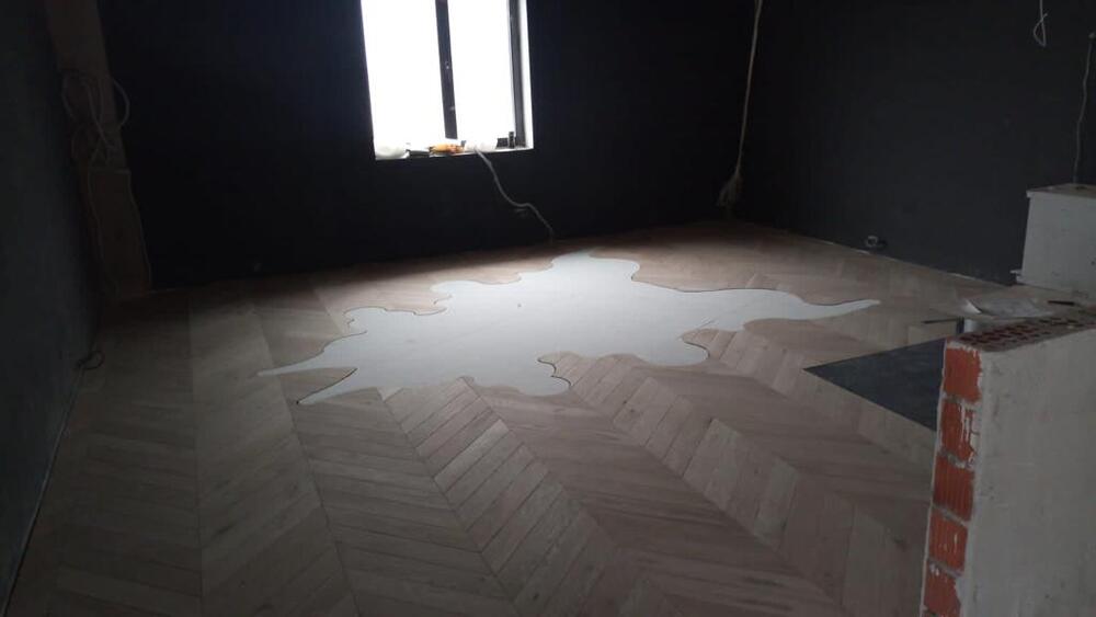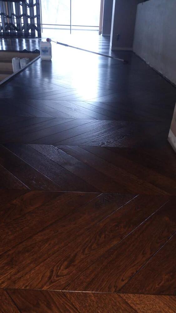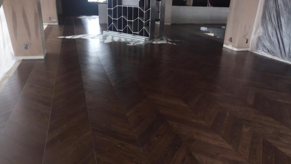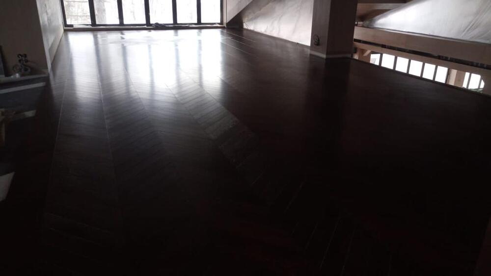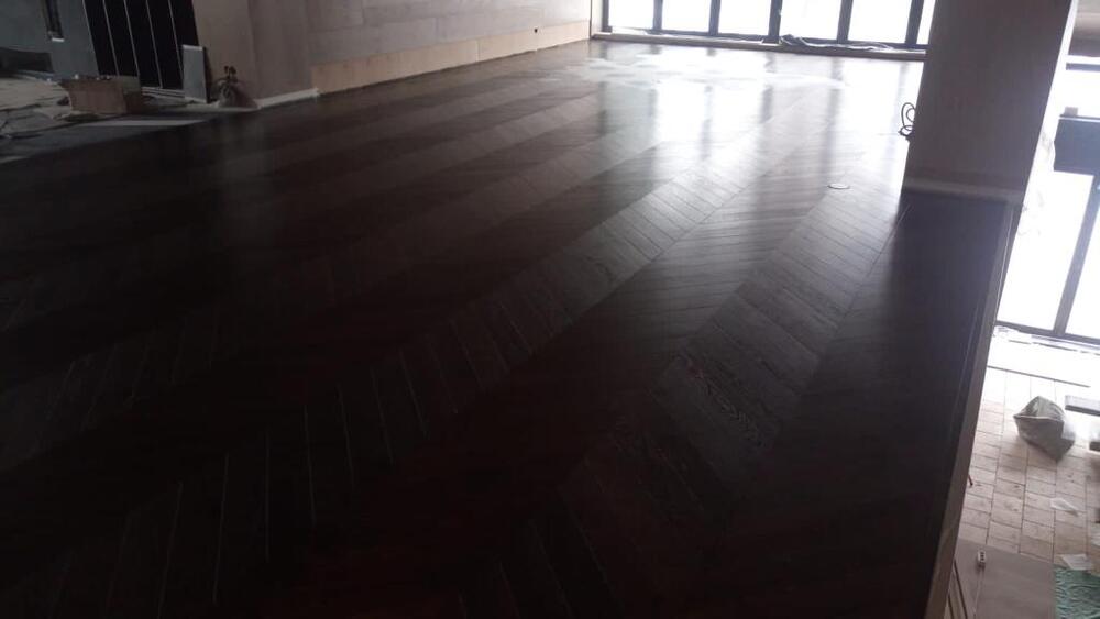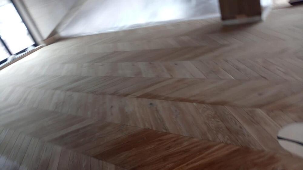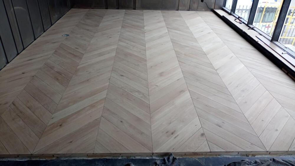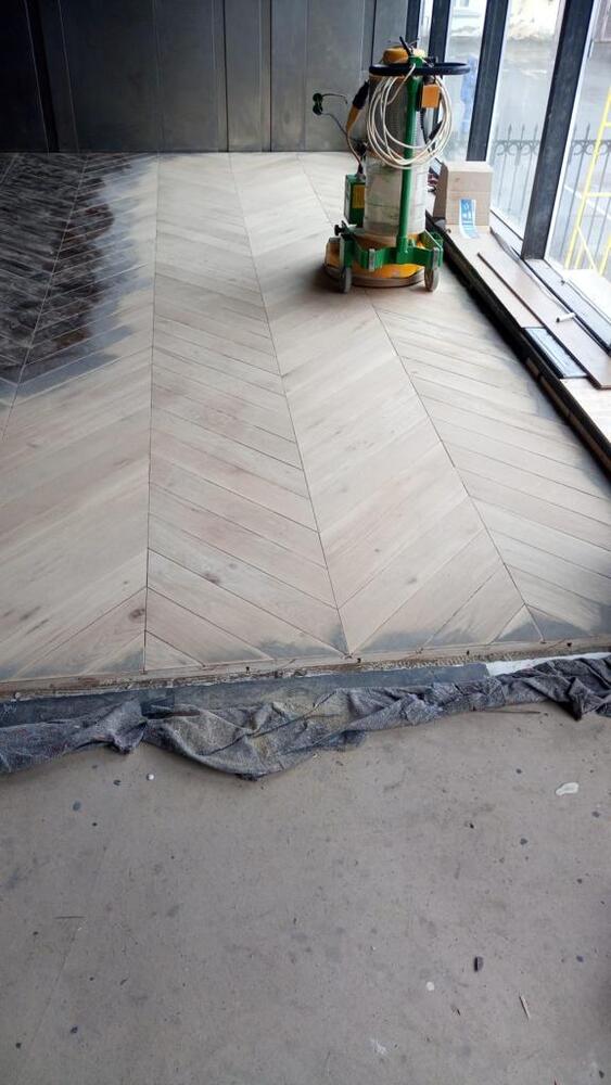 - Сделали перешлифовку инженерной доски, уложенной рисунком «французская елка»,