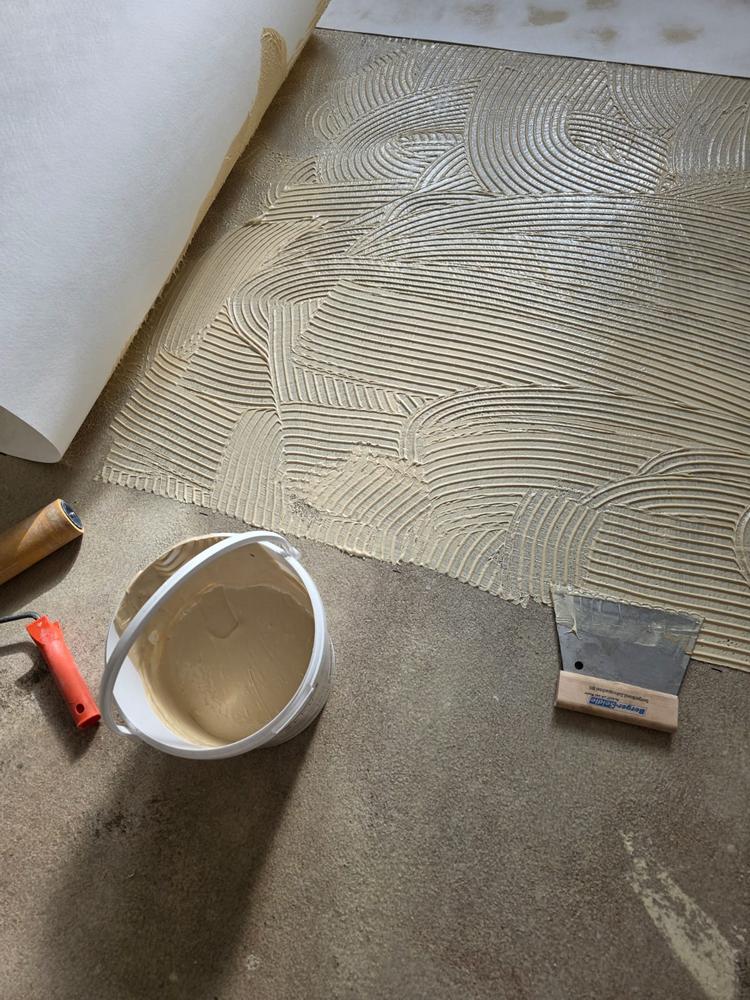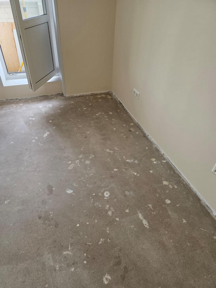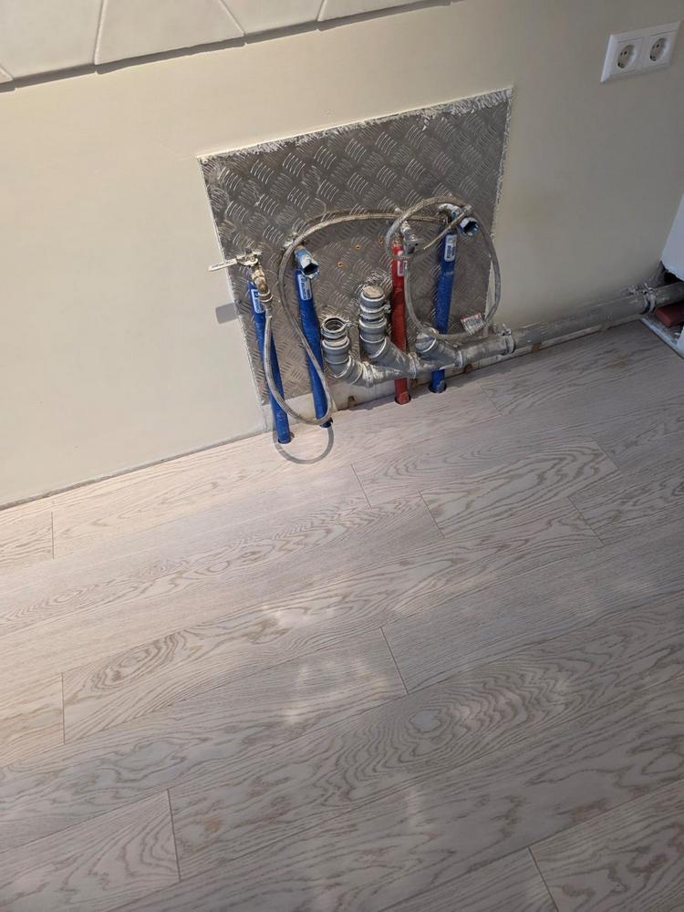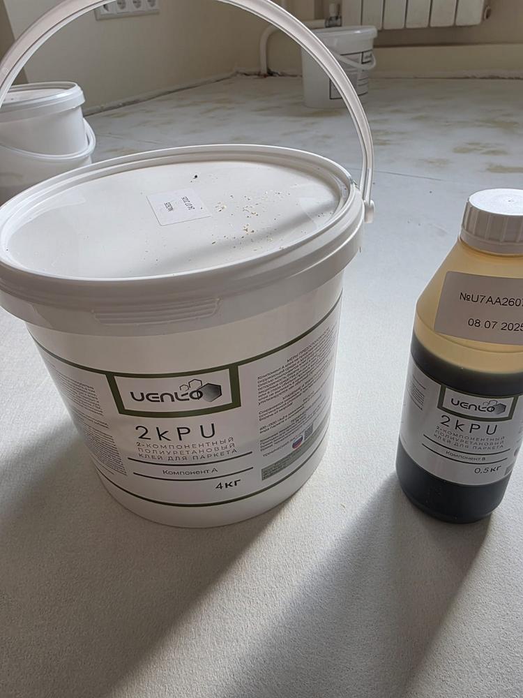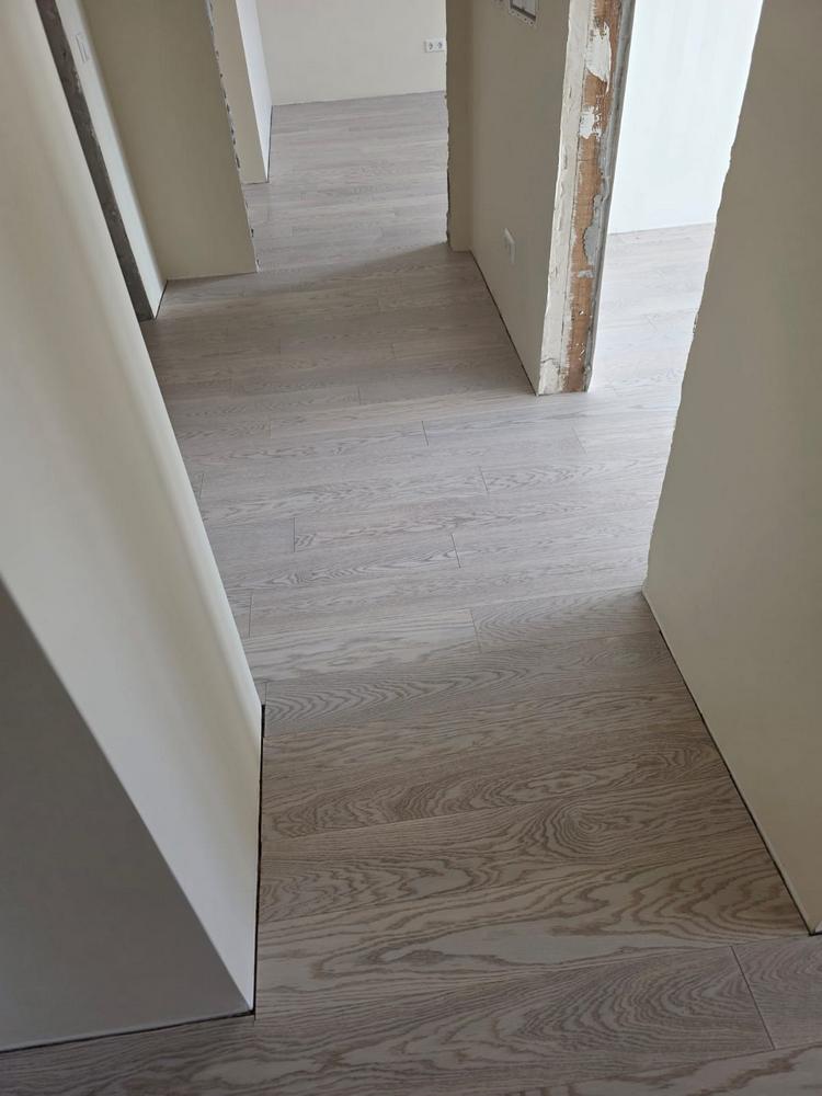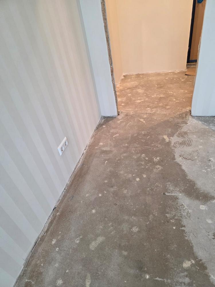 После демонтажа паркета выполнили оценку качества основания на прочность, ровность, влажность и т.д. Вероятно, паркет укладывали на еще не высохшее основание в пределах 3,8%: спустя год оно оставалось ещё влажным, так как доска лежала на подложке типа Tuplex, которая работает и как гидроизоляция. Было принято решение загрунтовать основание и приклеить подложку мультомоль на клей Venko 2 KPU (для компенсации высоты с примыканиями к плитке).