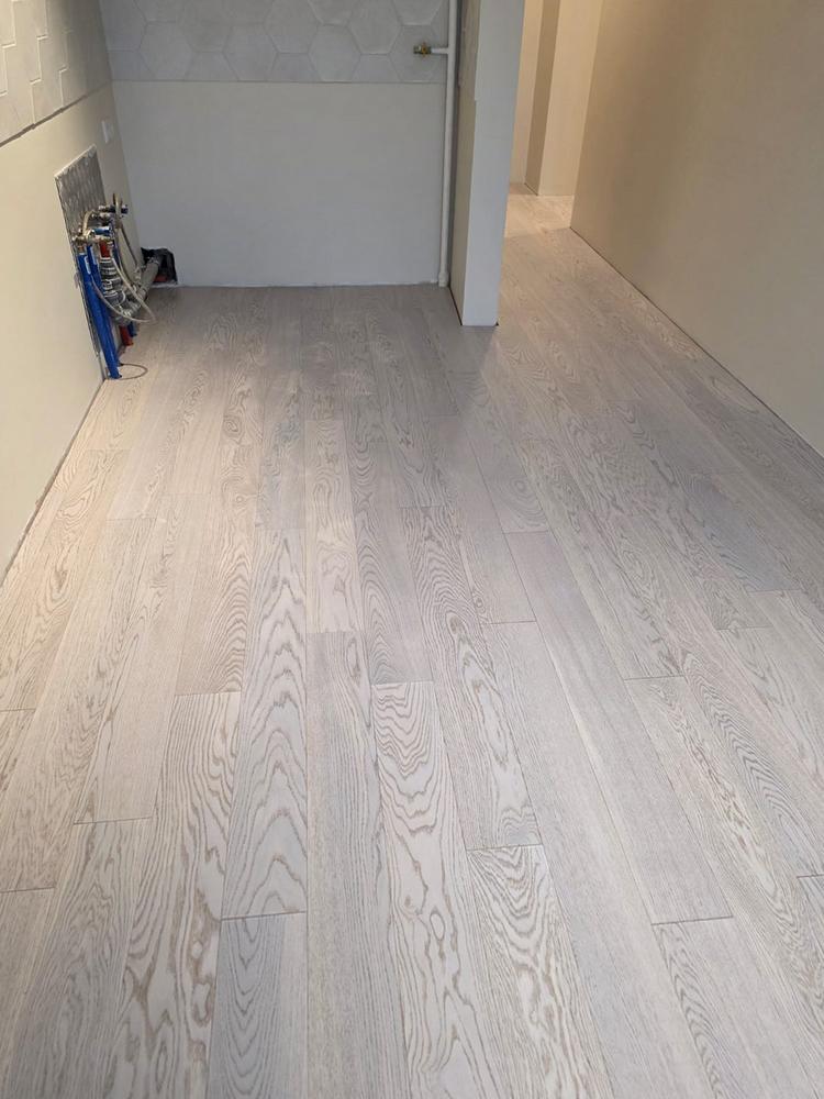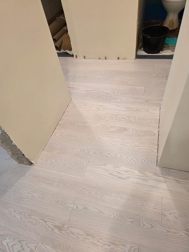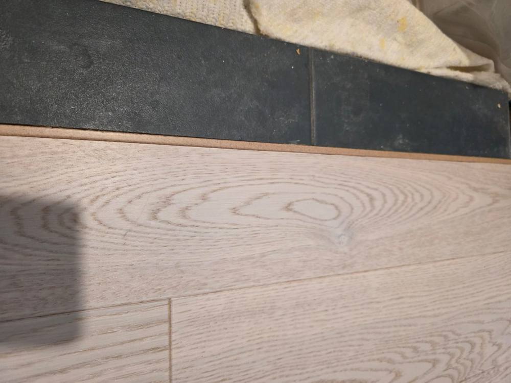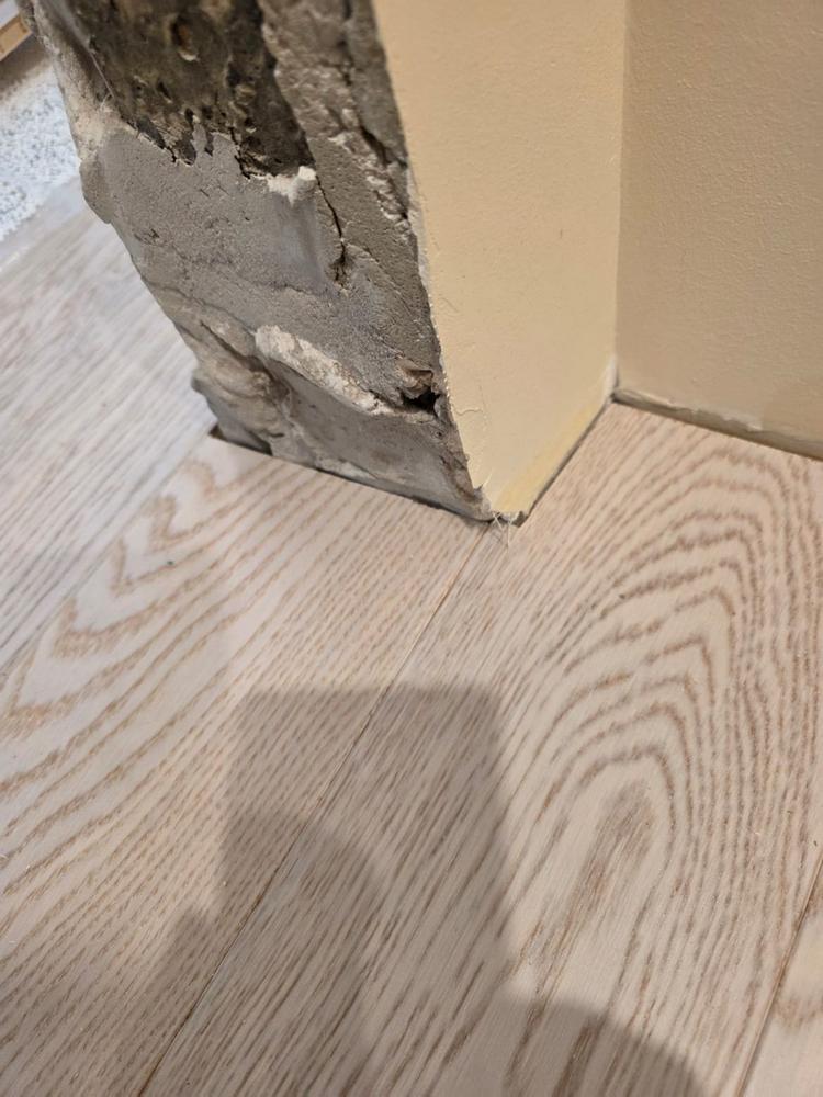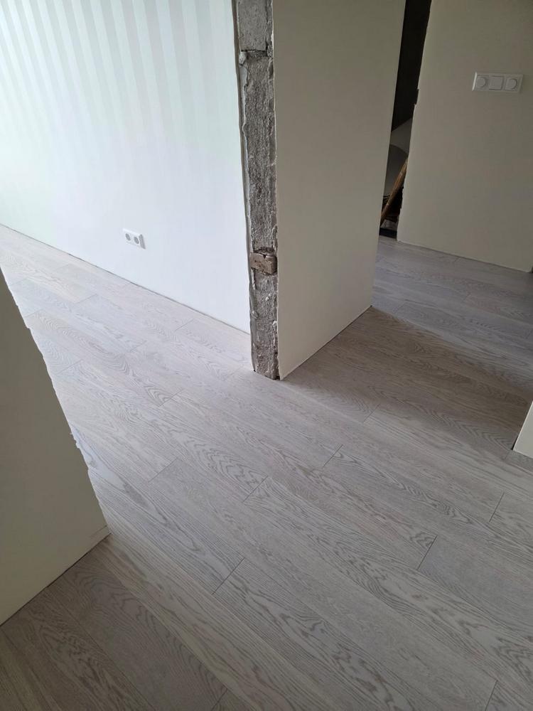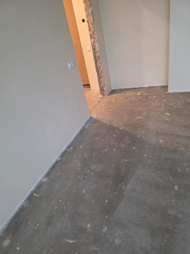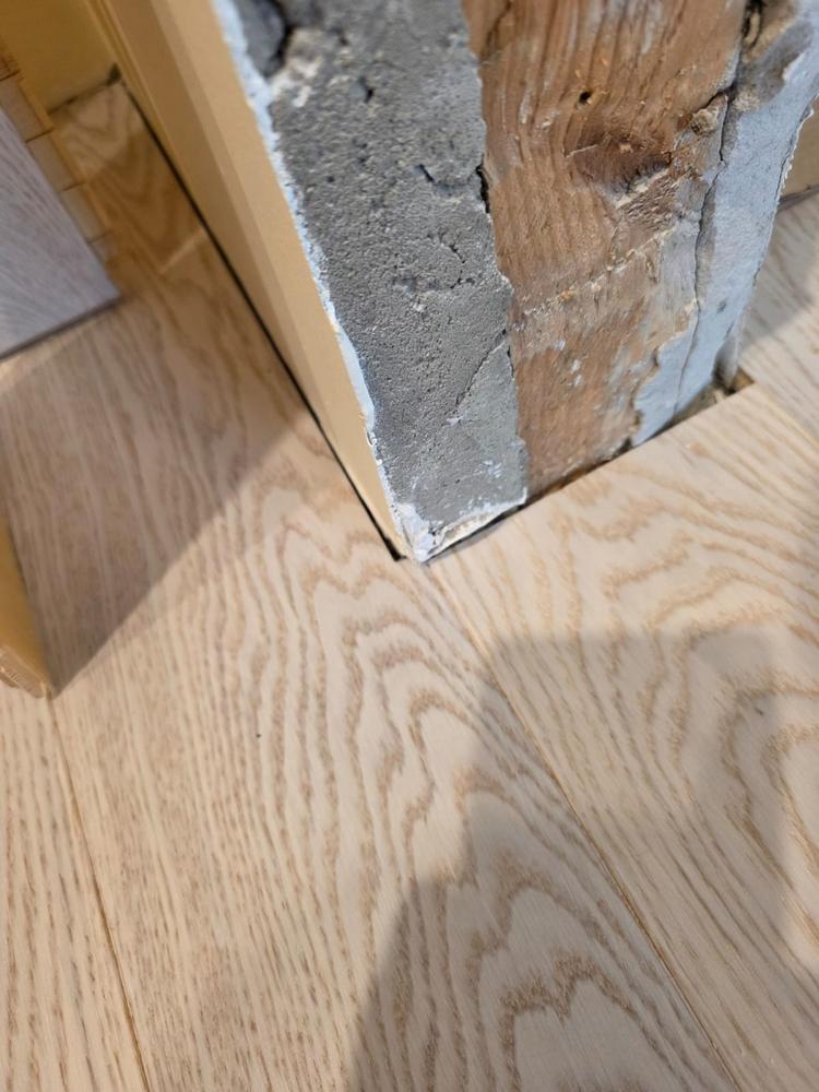 После демонтажа паркета выполнили оценку качества основания на прочность, ровность, влажность и т.д. Вероятно, паркет укладывали на еще не высохшее основание в пределах 3,8%: спустя год оно оставалось ещё влажным, так как доска лежала на подложке типа Tuplex, которая работает и как гидроизоляция. Было принято решение загрунтовать основание и приклеить подложку мультомоль на клей Venko 2 KPU (для компенсации высоты с примыканиями к плитке).