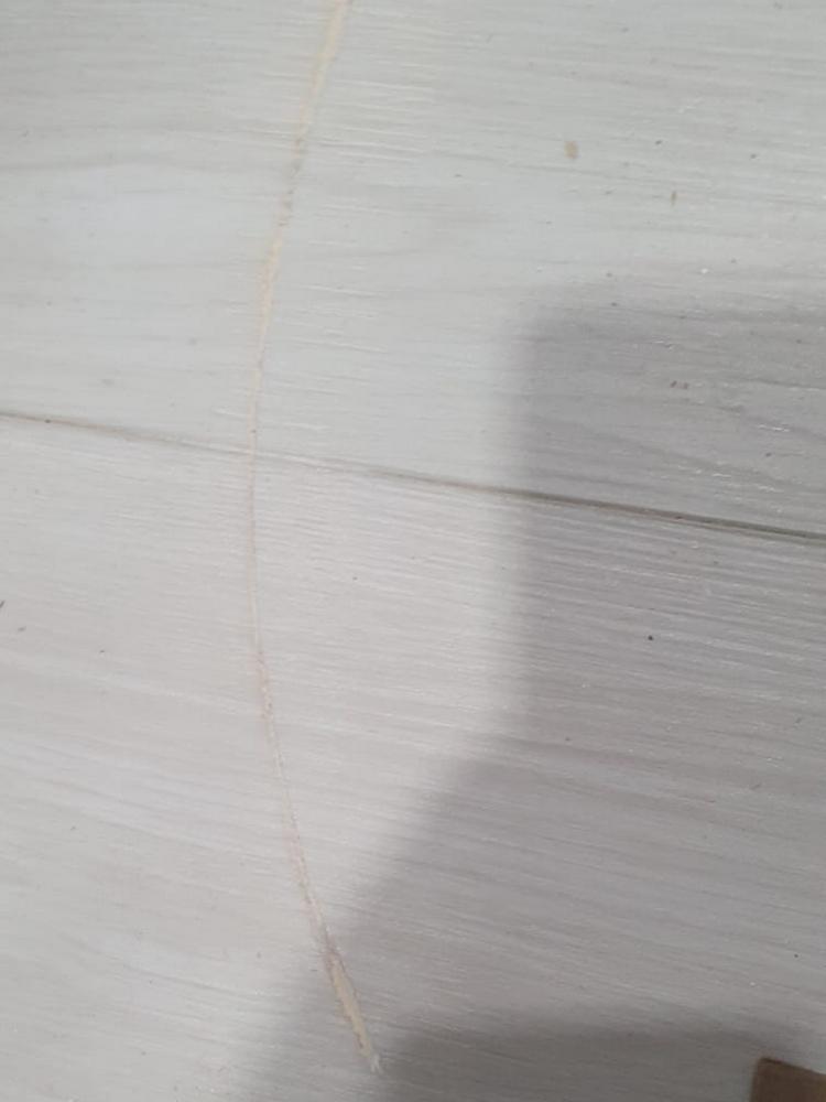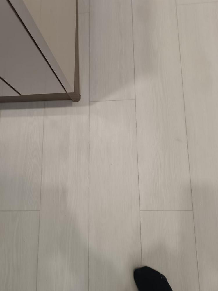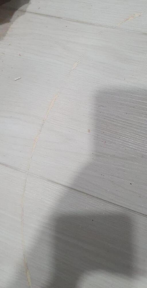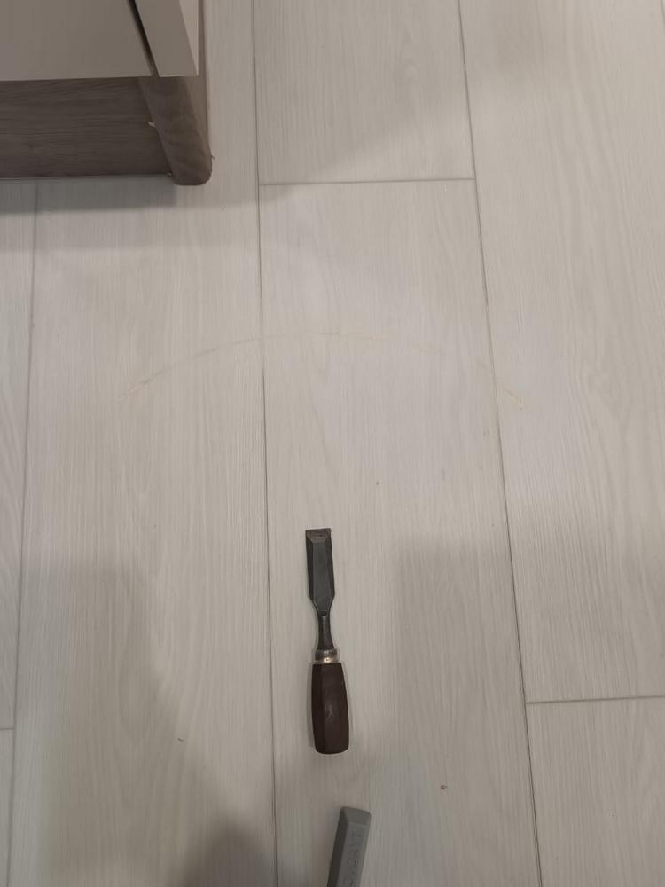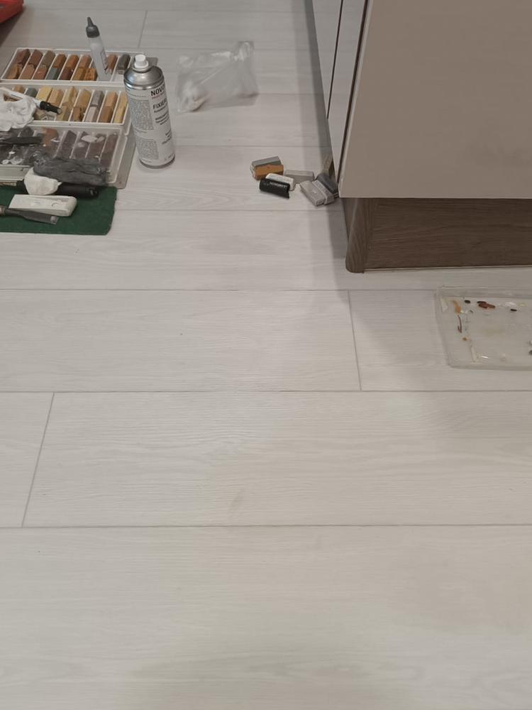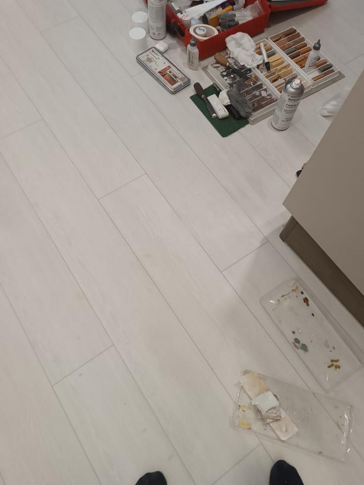 Мастер Антон из отдела реставрации компании «Вернисаж» выполнил локальную реставрацию повреждений кварцвинила на объекте в Москве. На кварцвиниле остался пропил от болгарки. Для реставрации повреждения использовались шпатлевка-расплав, ретуширующие краски и безореольный лак.