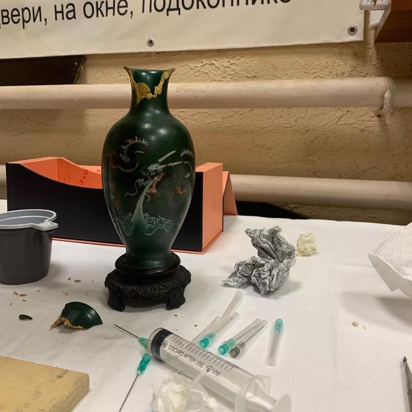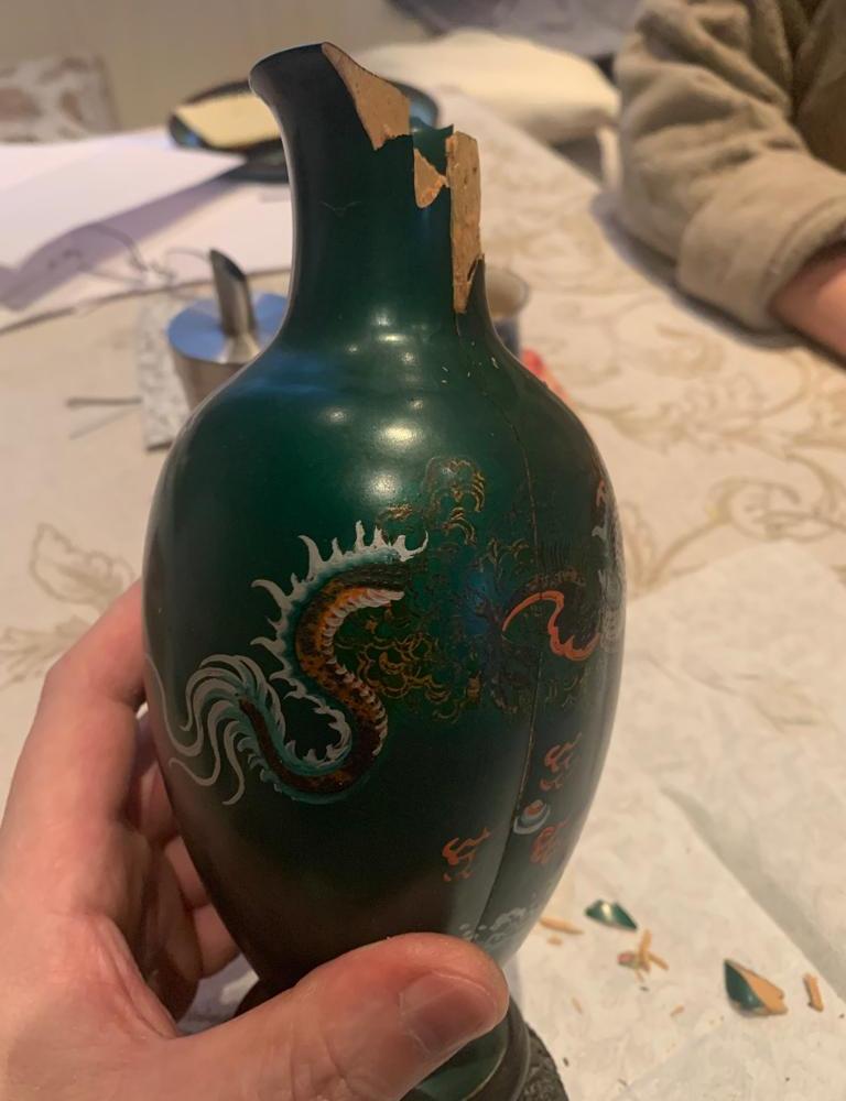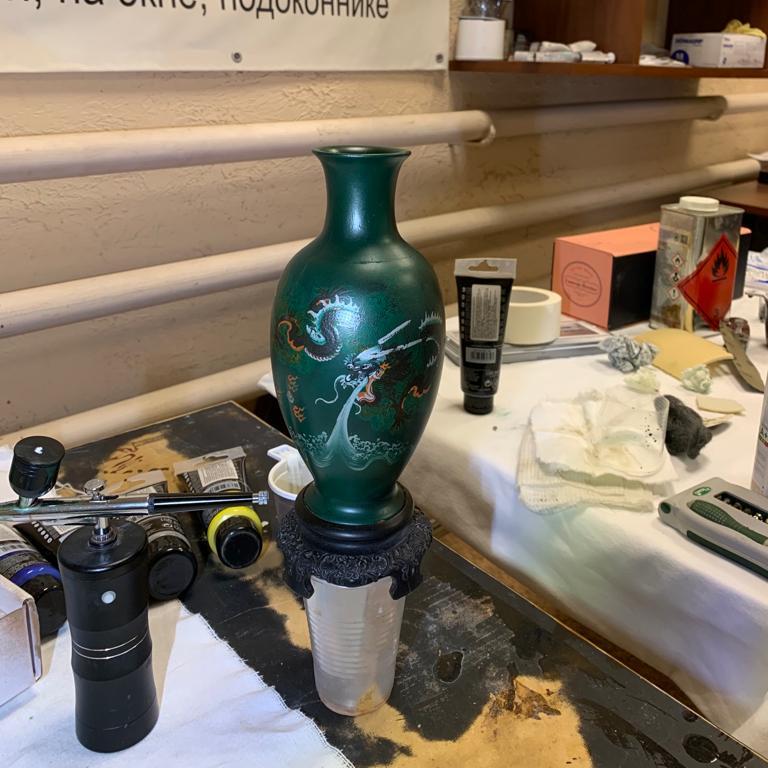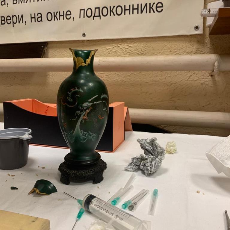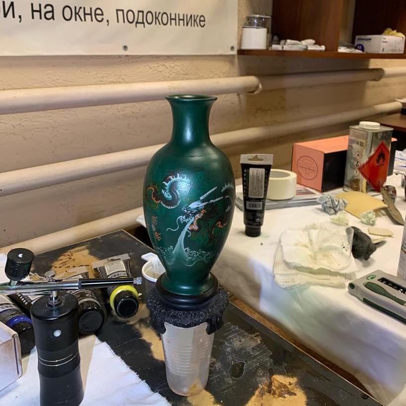 Мастера постарались срастить несколько обломков и восполнить утраты при помощи двухкомпонентных полиэфирных композиций. После этого акриловыми красками был собран цвет. Методика покраски определялась путем расчистки существующего покрытия (там был использован и белый грунт, и черный грунт, что достаточно хорошо отражалось на конечном результате). После покраски ваза была покрыта полуматовым лаком Novoryt (Швейцария).