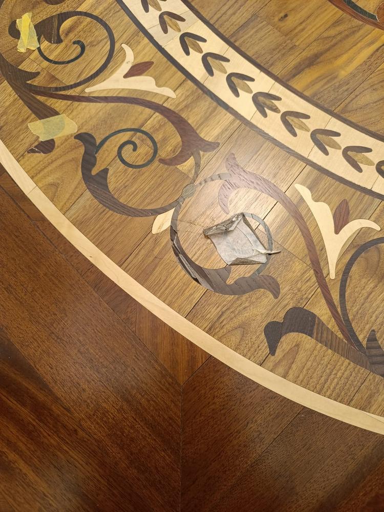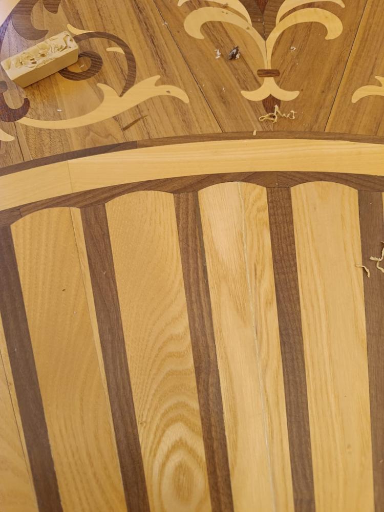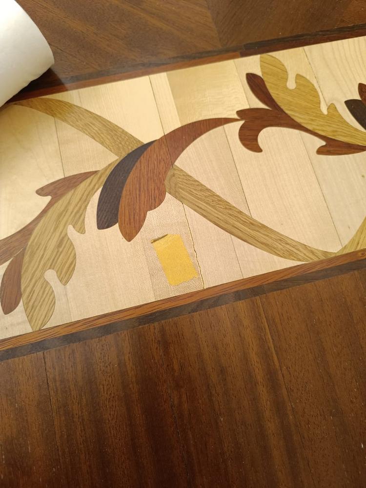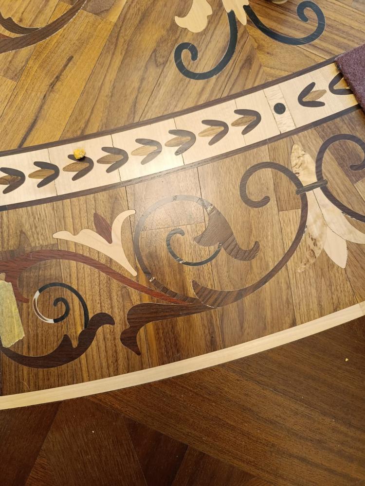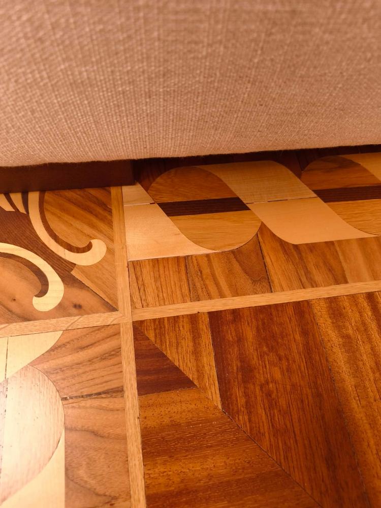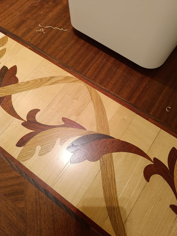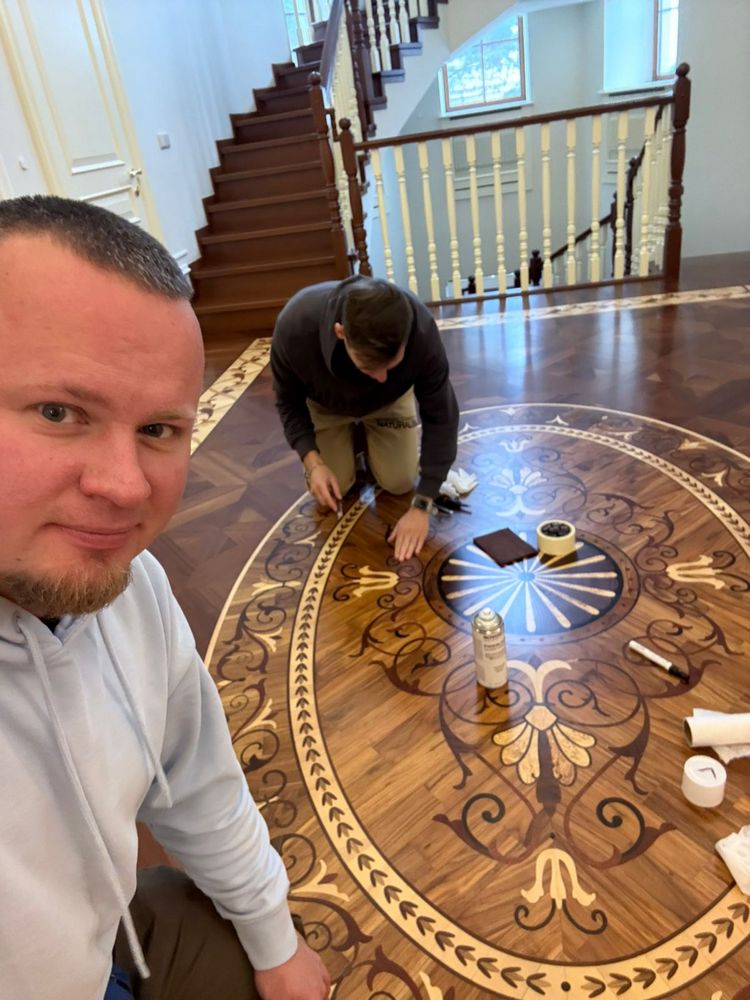 Заказчик купил дом с паркетом в художественном исполнении. Паркет производства компании «Ковчег» сохранился достойно, но в доме много лет никто не жил, и появились дефекты разного характера, в основном щели, проломы, коробление краев элементов из-за грубого климата в доме. После оценки нашими специалистами было принято решение уйти от перешлифовки с дальнейшим покрытием в пользу локальной реставрации разного вида повреждений. Повреждения паркета исправляли с применением инъекционного клея Venko и реставрационных материалов Novoryt.