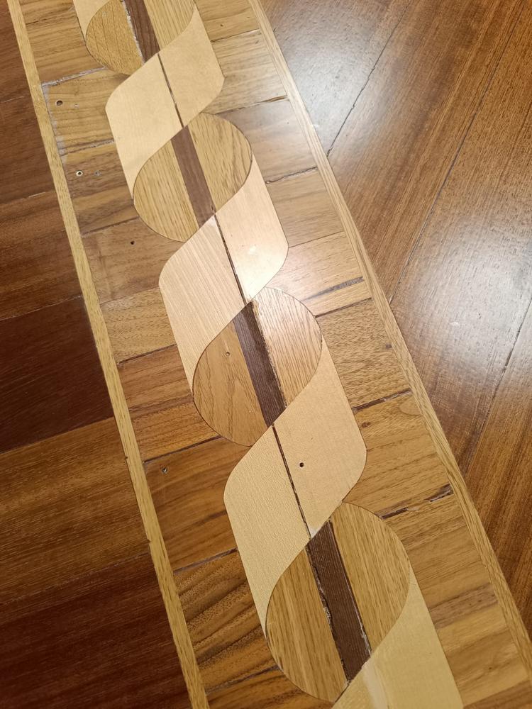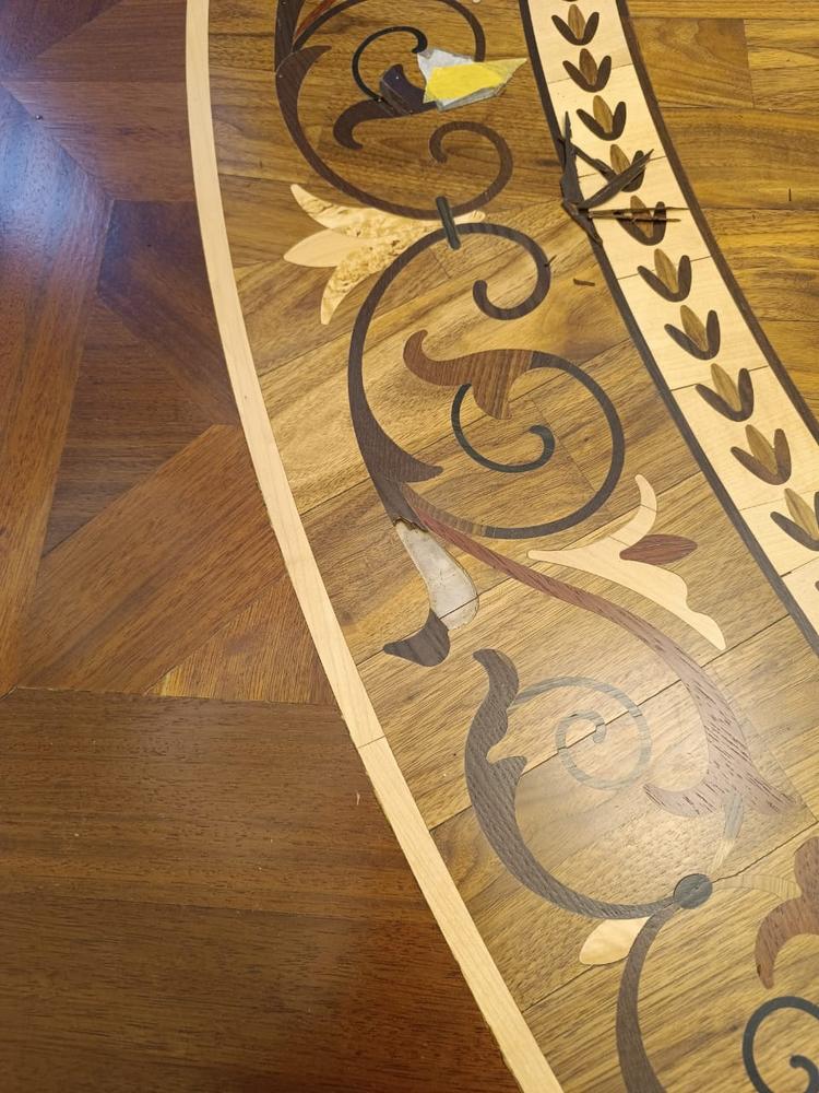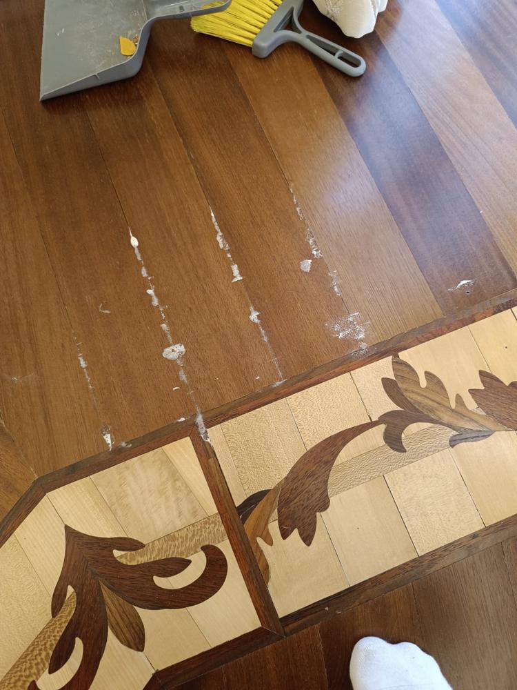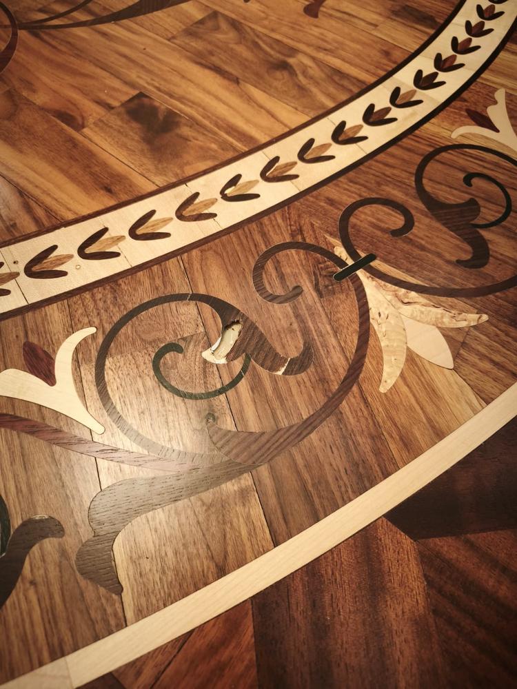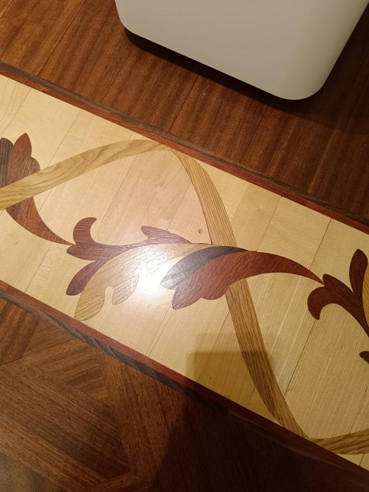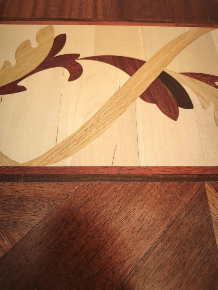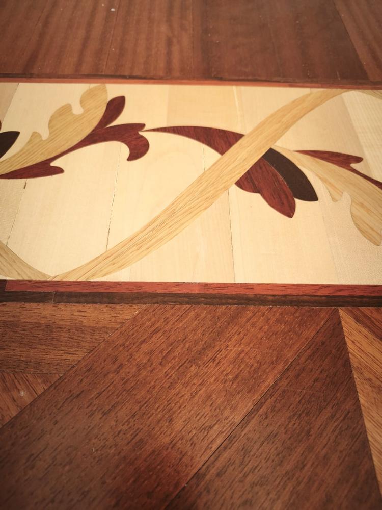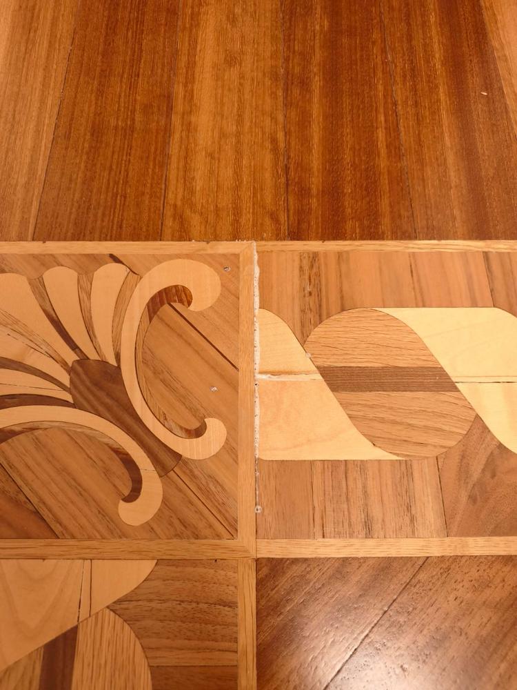 Заказчик купил дом с паркетом в художественном исполнении. Паркет производства компании «Ковчег» сохранился достойно, но в доме много лет никто не жил, и появились дефекты разного характера, в основном щели, проломы, коробление краев элементов из-за грубого климата в доме. После оценки нашими специалистами было принято решение уйти от перешлифовки с дальнейшим покрытием в пользу локальной реставрации разного вида повреждений. Повреждения паркета исправляли с применением инъекционного клея Venko и реставрационных материалов Novoryt.
