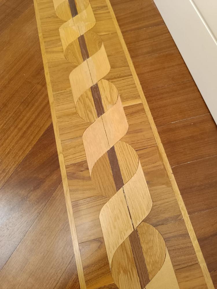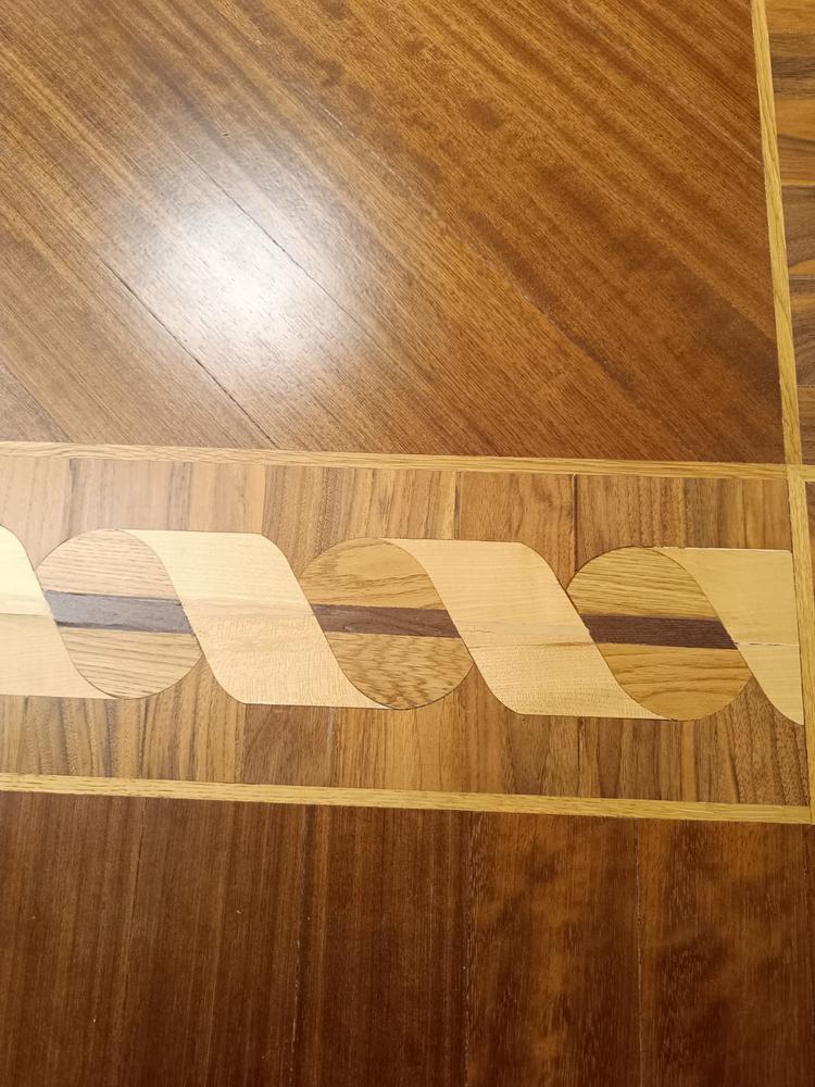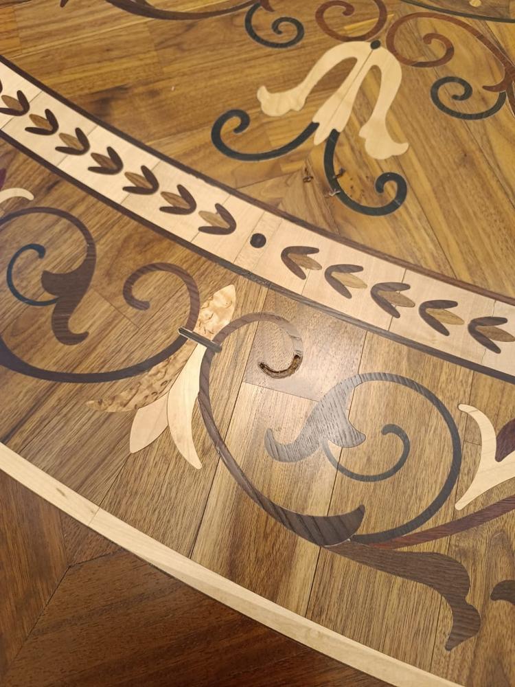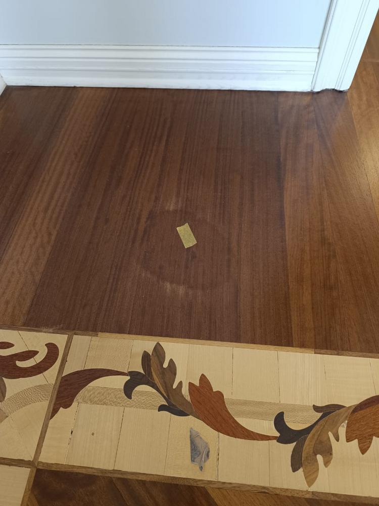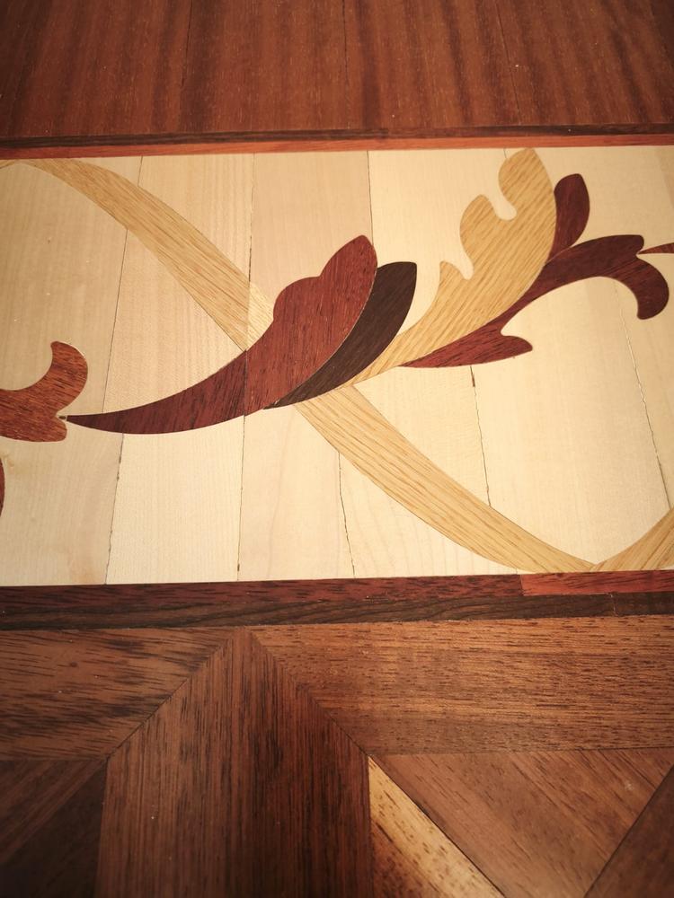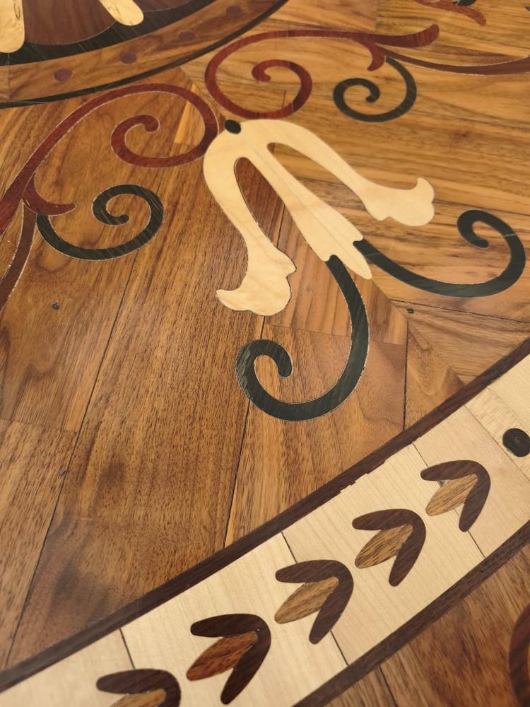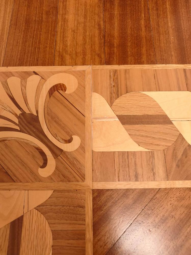 Заказчик купил дом с паркетом в художественном исполнении. Паркет производства компании «Ковчег» сохранился достойно, но в доме много лет никто не жил, и появились дефекты разного характера, в основном щели, проломы, коробление краев элементов из-за грубого климата в доме. После оценки нашими специалистами было принято решение уйти от перешлифовки с дальнейшим покрытием в пользу локальной реставрации разного вида повреждений. Повреждения паркета исправляли с применением инъекционного клея Venko и реставрационных материалов Novoryt.