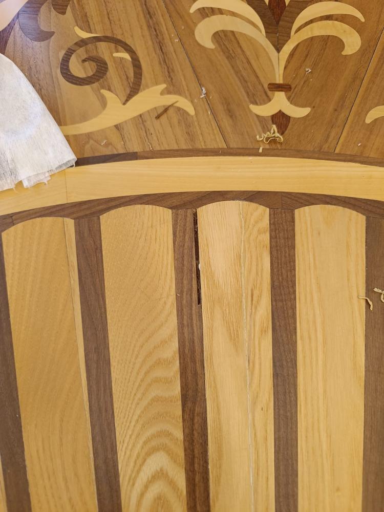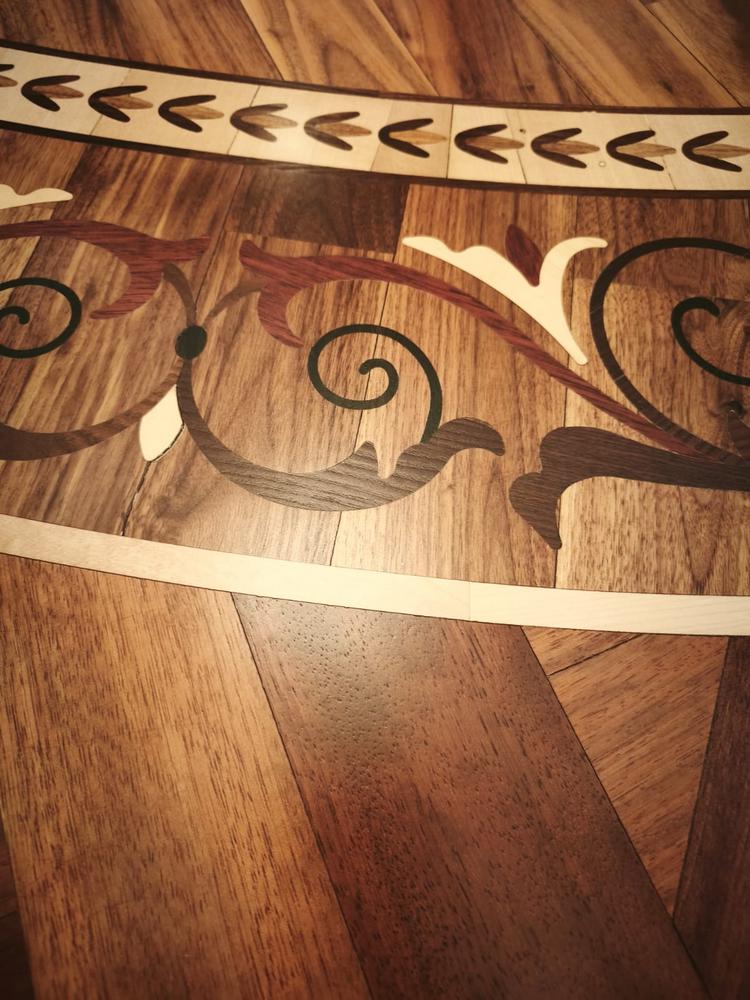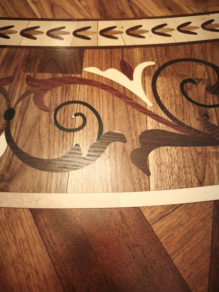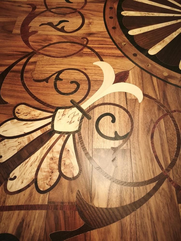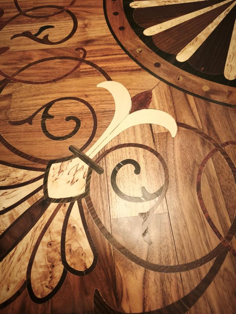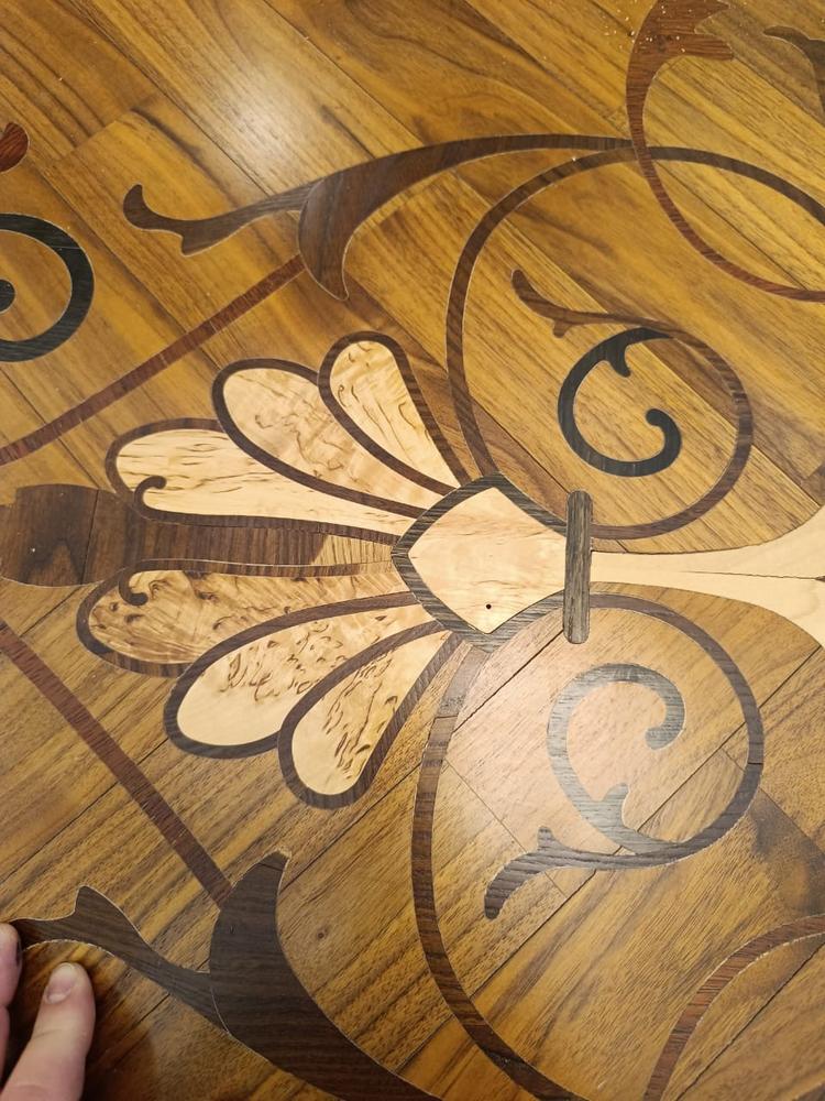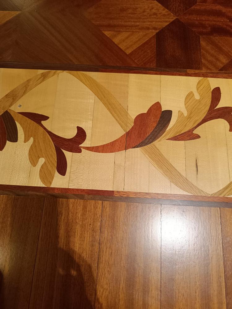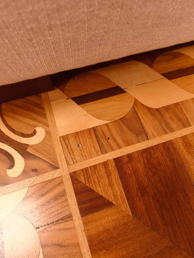 Заказчик купил дом с паркетом в художественном исполнении. Паркет производства компании «Ковчег» сохранился достойно, но в доме много лет никто не жил, и появились дефекты разного характера, в основном щели, проломы, коробление краев элементов из-за грубого климата в доме. После оценки нашими специалистами было принято решение уйти от перешлифовки с дальнейшим покрытием в пользу локальной реставрации разного вида повреждений. Повреждения паркета исправляли с применением инъекционного клея Venko и реставрационных материалов Novoryt.