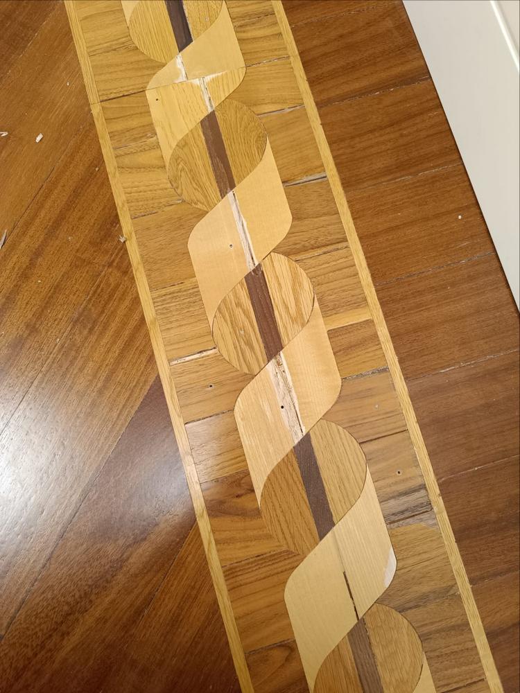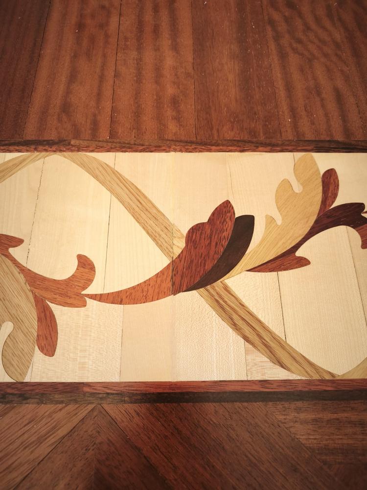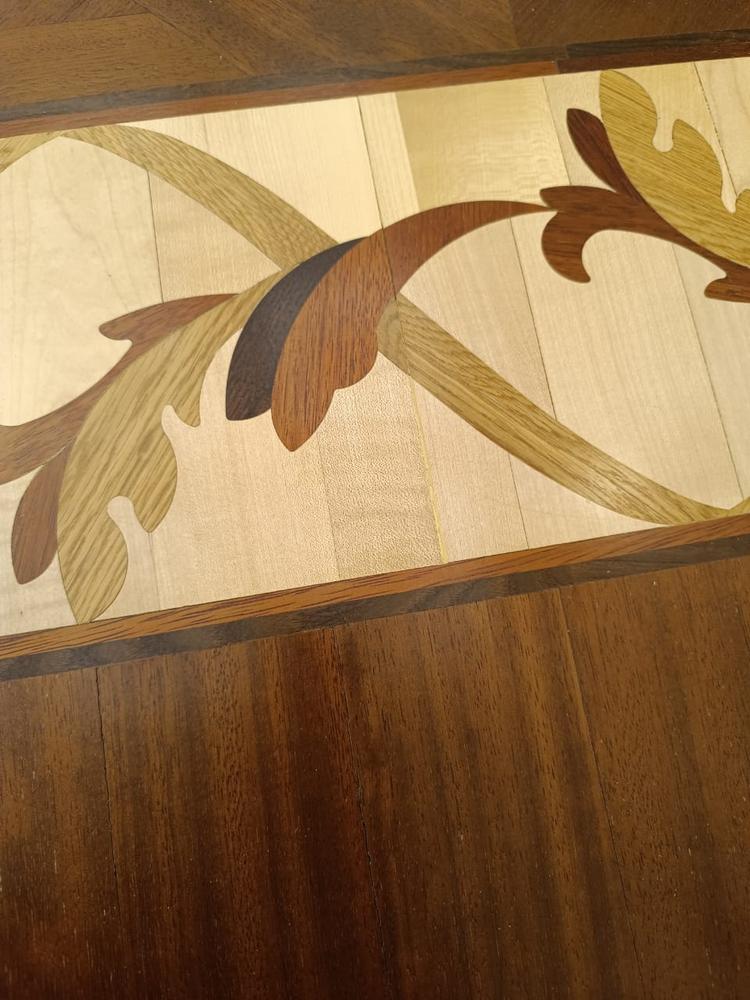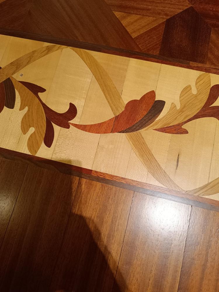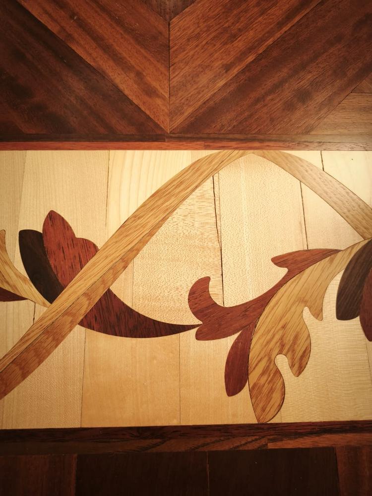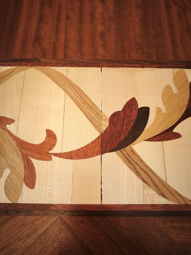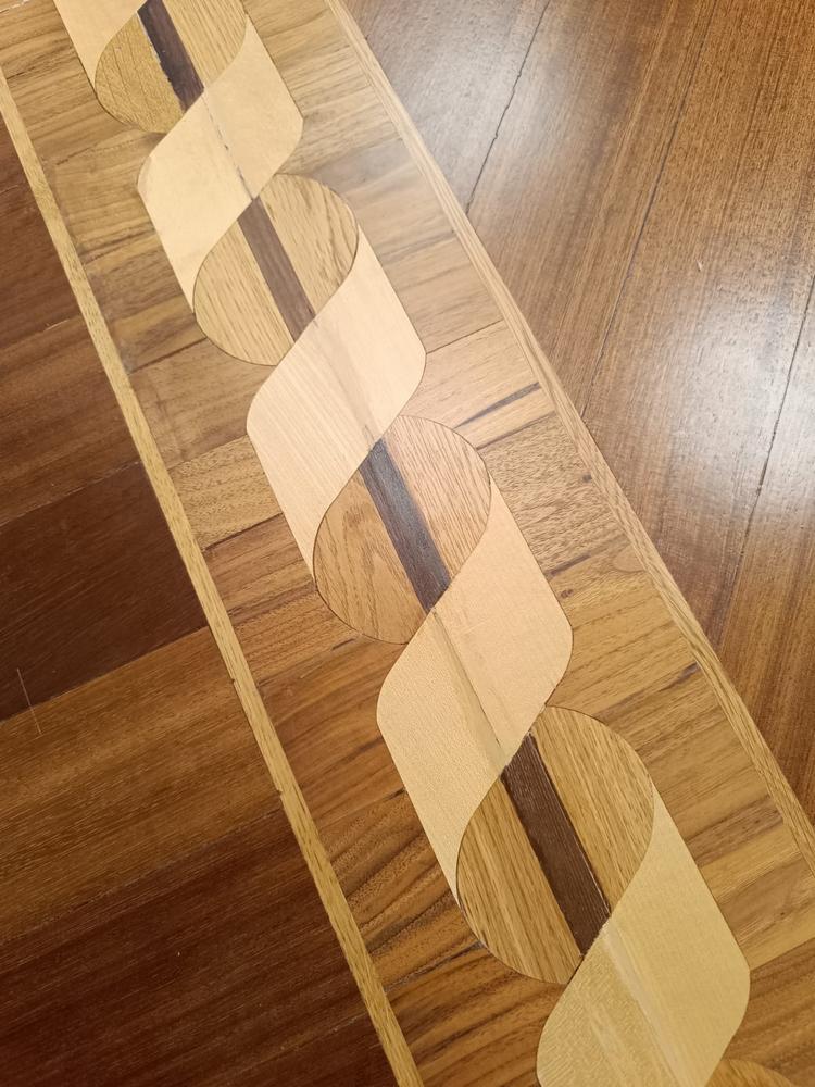 Заказчик купил дом с паркетом в художественном исполнении. Паркет производства компании «Ковчег» сохранился достойно, но в доме много лет никто не жил, и появились дефекты разного характера, в основном щели, проломы, коробление краев элементов из-за грубого климата в доме. После оценки нашими специалистами было принято решение уйти от перешлифовки с дальнейшим покрытием в пользу локальной реставрации разного вида повреждений. Повреждения паркета исправляли с применением инъекционного клея Venko и реставрационных материалов Novoryt.