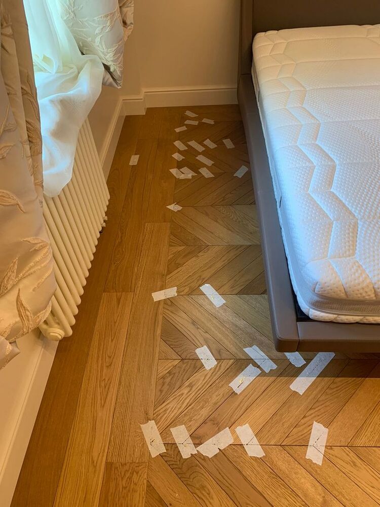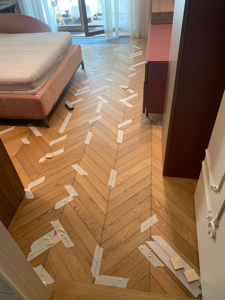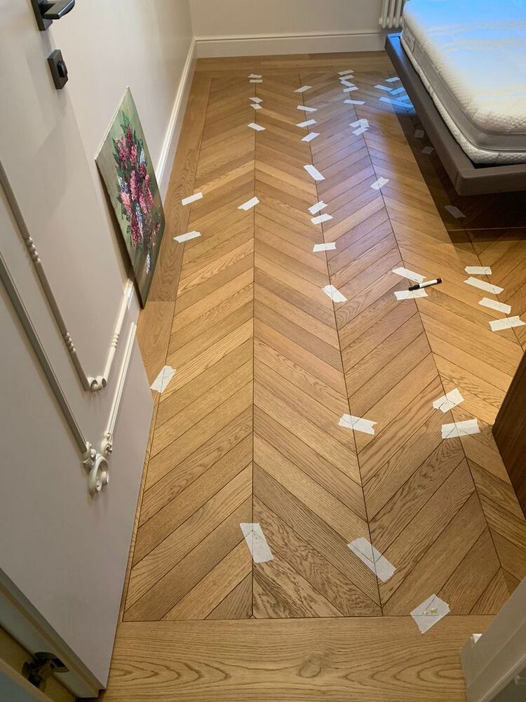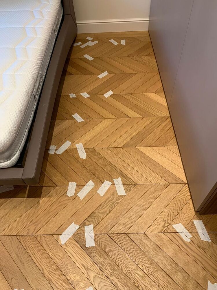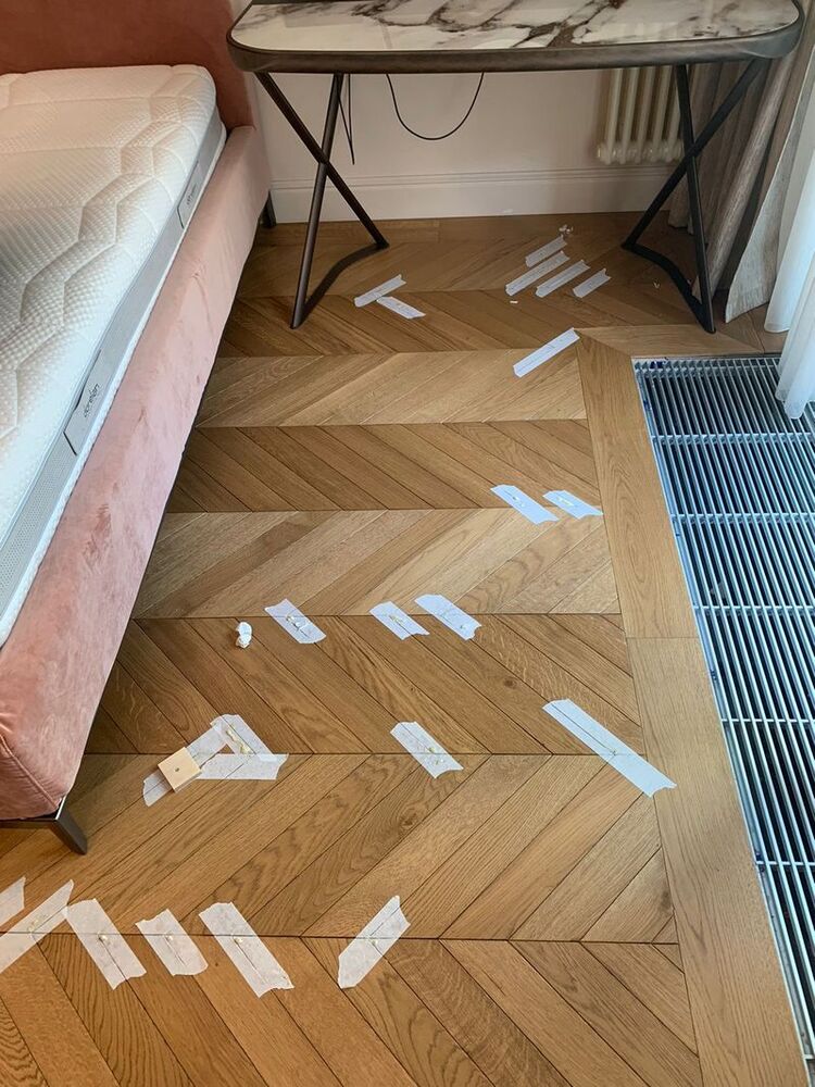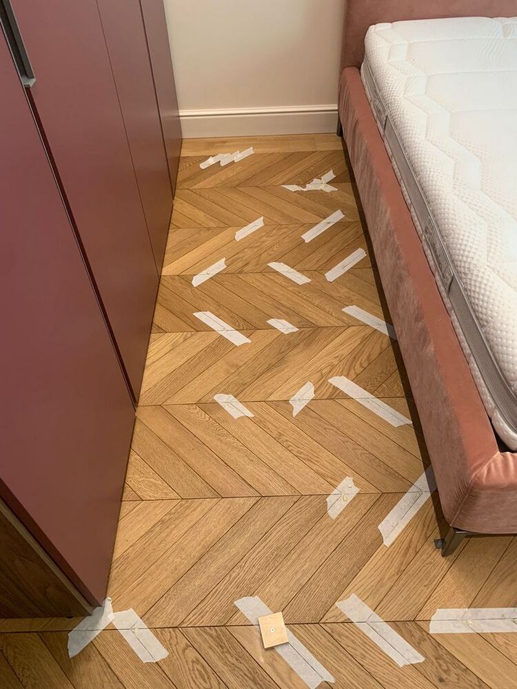 Мастера компании «Вернисаж» выполнили работы по локальной реставрации паркета на объекте в Санкт-Петербурге. Ситуация получилась интересная: в квартире была уложена инженерная доска итальянского производства. Через 2 недели после окончания ремонтных работ и снятия защитного укрытия, с паркета исчез шелковисто-матовый блеск, а еще через месяц началось сильное коробление доски – приподнялись края, началось бухтение, одна клепка совсем лопнула и развалилась, пришлось ее удалить. Мастера «Вернисажа» оценили фронт работ и предложили клиенту 2 варианта исправления ситуации с разным бюджетом – максимальный и облегченный. Клиент выбрал второй вариант, и паркетчики сделали инъекции на указанные места в спальнях и в гостиной, где был уложен инженерный геометрический паркет, а далее покрыли паркет 2 слоями масла с твердым воском.