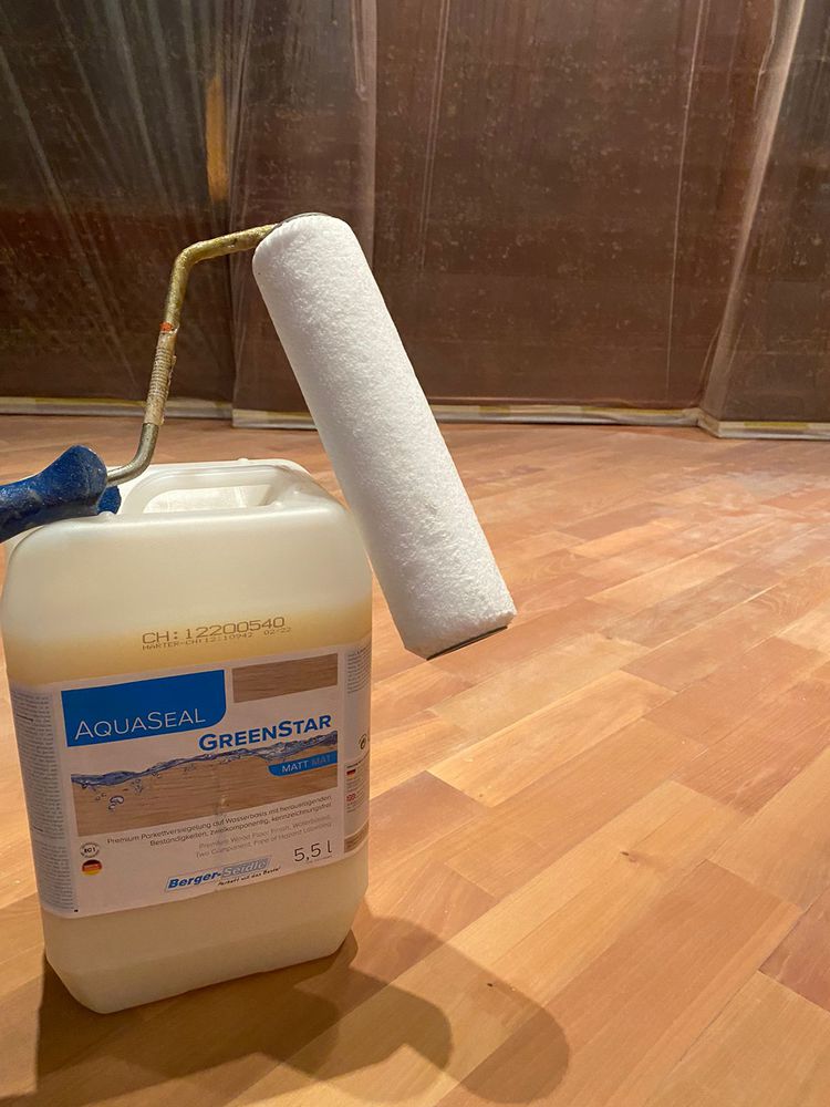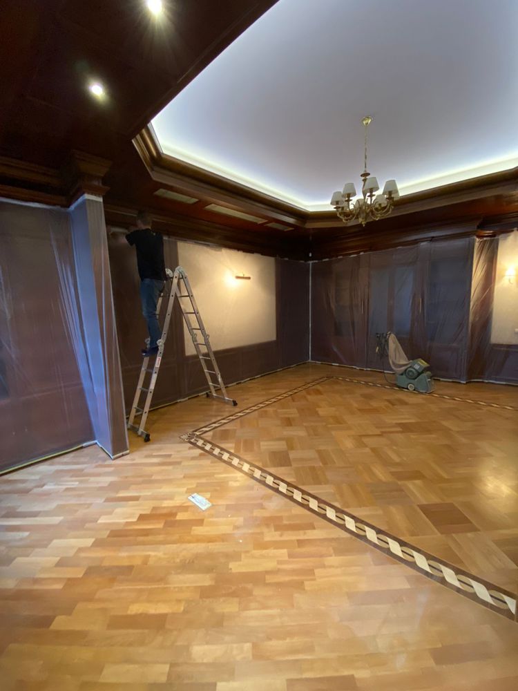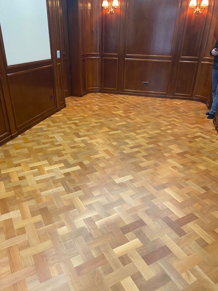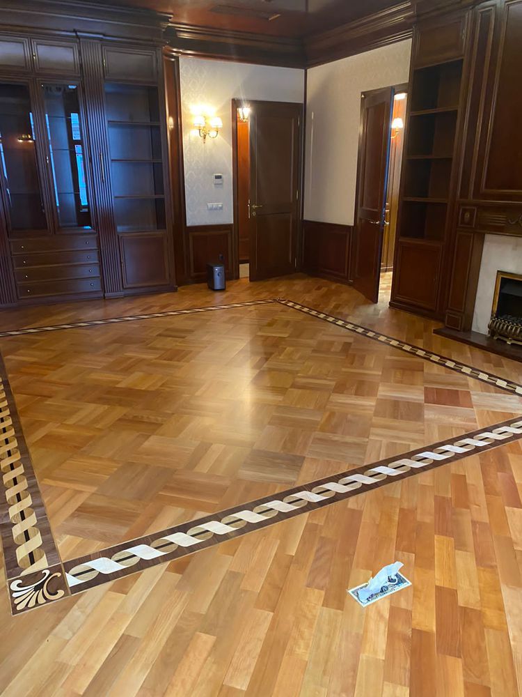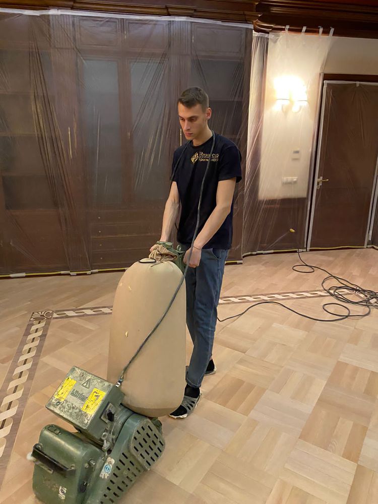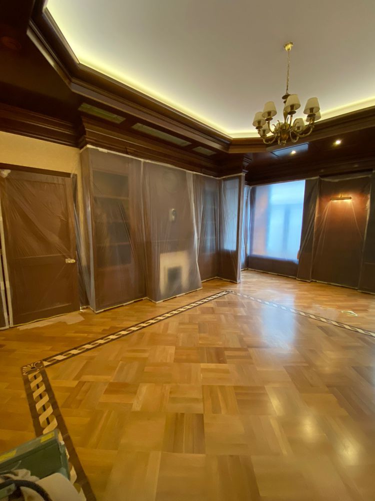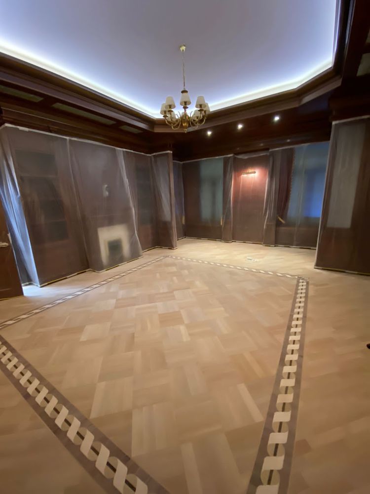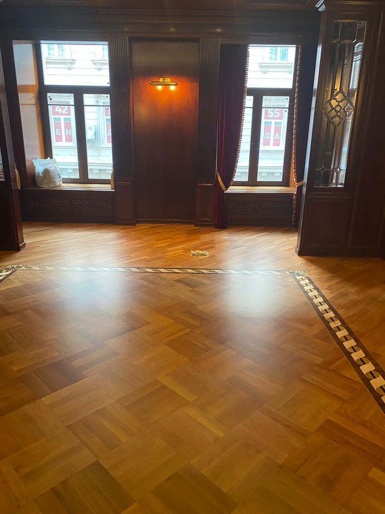 Мастера компании «Вернисаж» выполнили работы по ремонту паркета в административном кабинете в Москве. Это был небольшой по площади объект, но очень интересный. Паркет был уложен много лет назад, на проходных зонах лаковое покрытие было изношено до голой древесины. Особое внимание здесь стоит обратить на породу дерева – это паркет из груши. Это одновременно очень красивая и капризная порода, особенно в отделке. При ее обработке надо учитывать, что она сама по себе достаточно мягкая и очень требовательная к защитному покрытию. Выполнение таких работ требует высокой квалификации мастеров. Мы традиционно с этими работами успешно справились, выбрав следующую схему покрытия – сначала поджигающая грунтовка Berger L81, которая как раз позволит на этой породе дерева избежать нахлестов, полос, тычков, т.е. всех дефектов, связанных с лакировкой, и после этого применяли самый удобный и один из самых износостойких наших лаков Berger Green Star. Мастера-паркетчики остались довольны работой и успешно сдали этот объект.