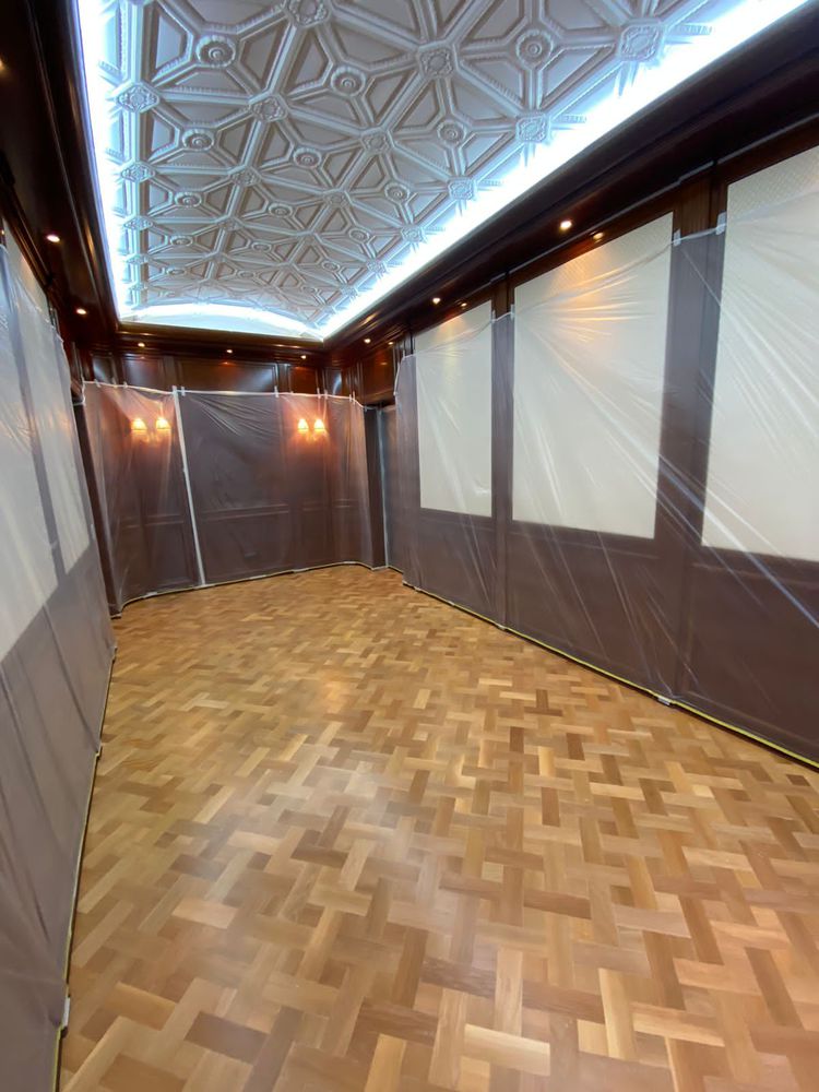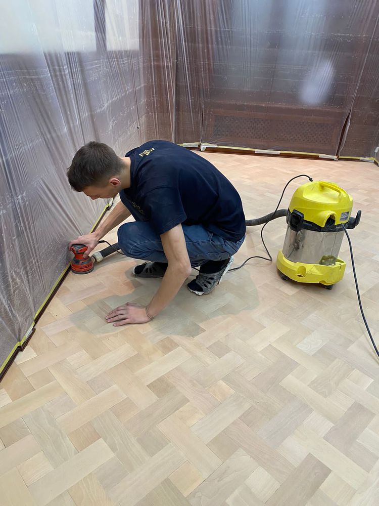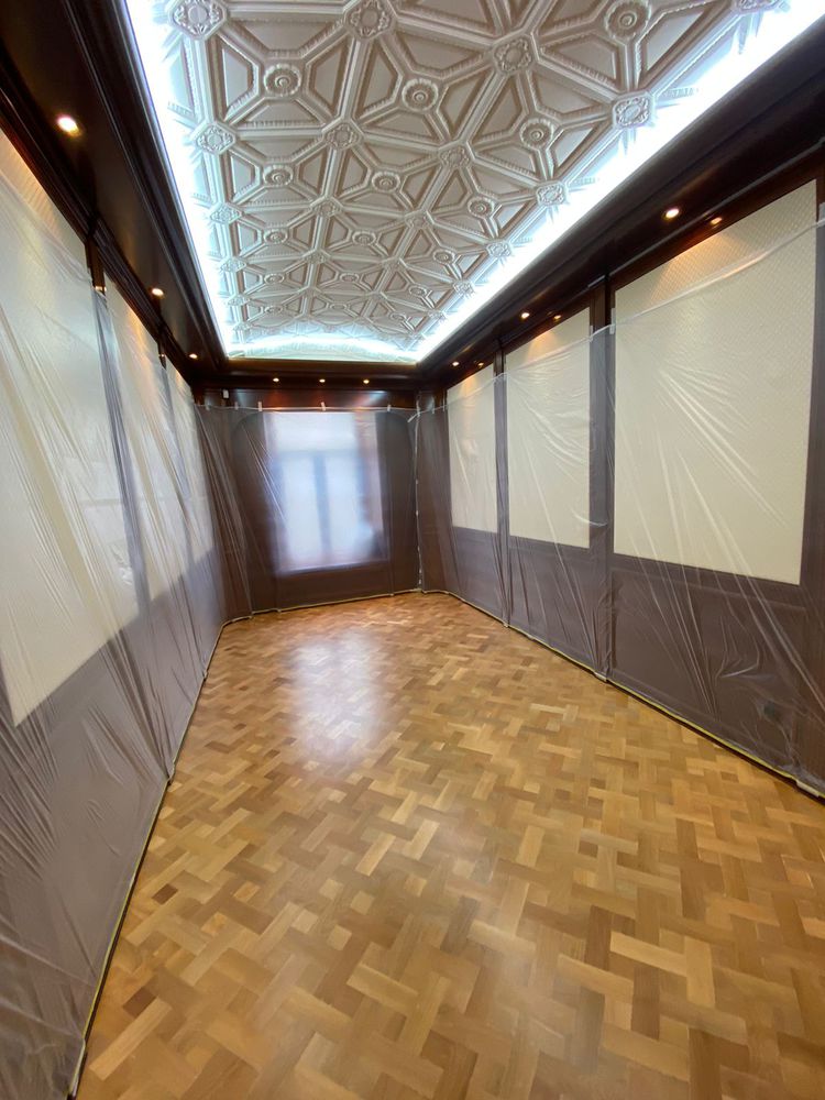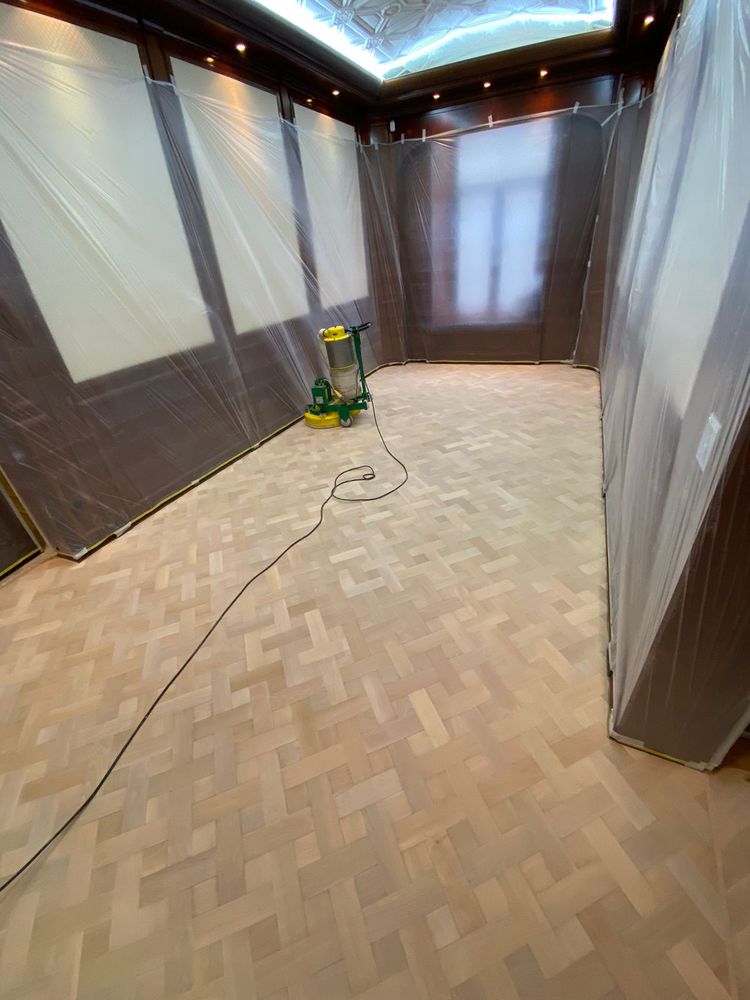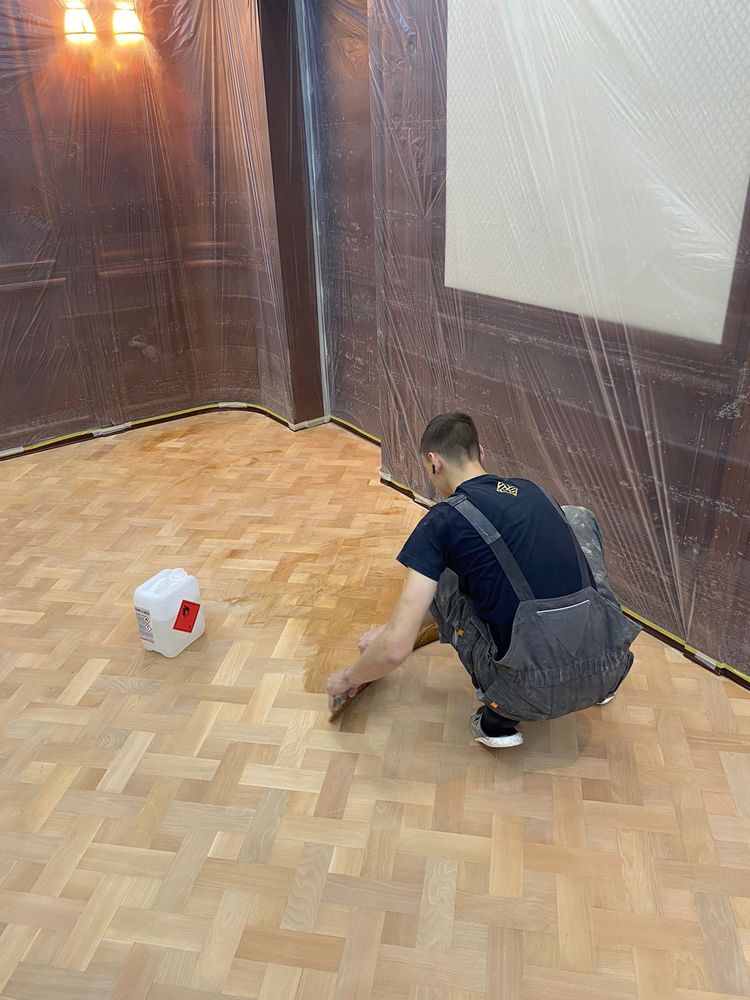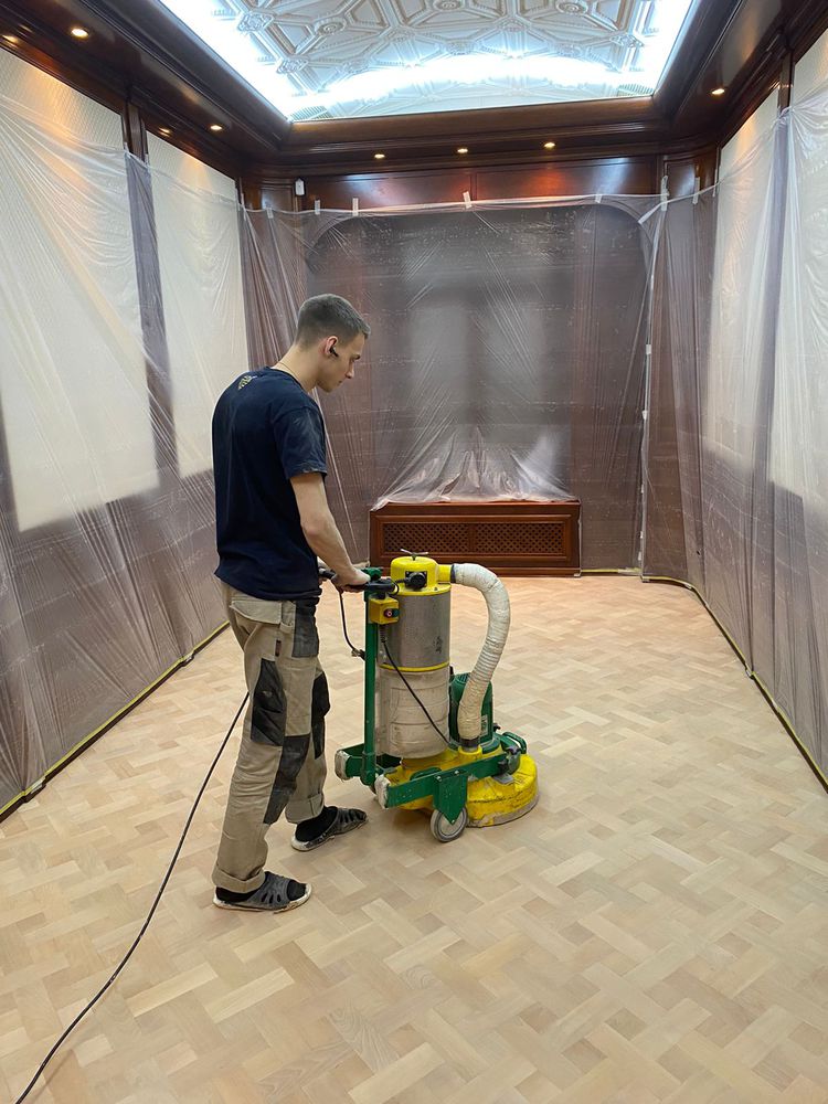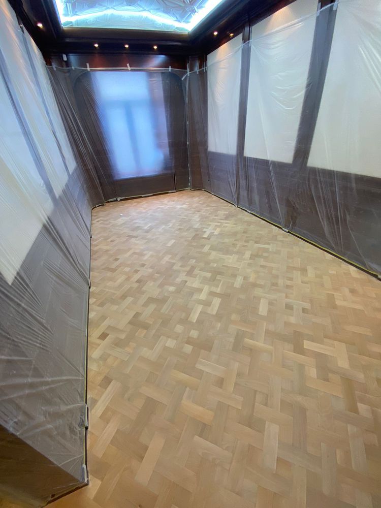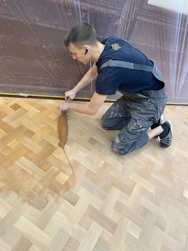 Мастера компании «Вернисаж» выполнили работы по ремонту паркета в административном кабинете в Москве. Это был небольшой по площади объект, но очень интересный. Паркет был уложен много лет назад, на проходных зонах лаковое покрытие было изношено до голой древесины. Особое внимание здесь стоит обратить на породу дерева – это паркет из груши. Это одновременно очень красивая и капризная порода, особенно в отделке. При ее обработке надо учитывать, что она сама по себе достаточно мягкая и очень требовательная к защитному покрытию. Выполнение таких работ требует высокой квалификации мастеров. Мы традиционно с этими работами успешно справились, выбрав следующую схему покрытия – сначала поджигающая грунтовка Berger L81, которая как раз позволит на этой породе дерева избежать нахлестов, полос, тычков, т.е. всех дефектов, связанных с лакировкой, и после этого применяли самый удобный и один из самых износостойких наших лаков Berger Green Star. Мастера-паркетчики остались довольны работой и успешно сдали этот объект.