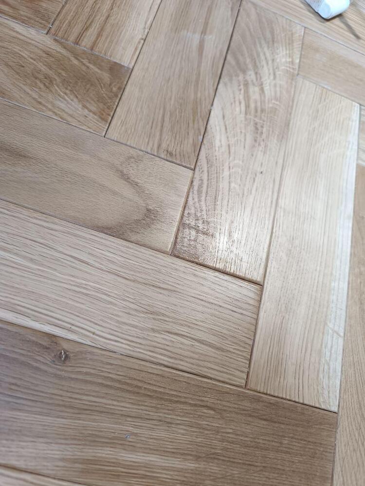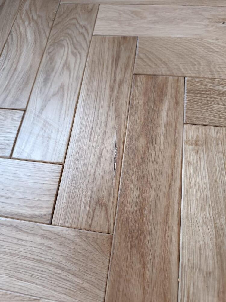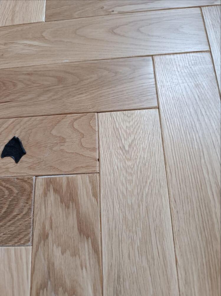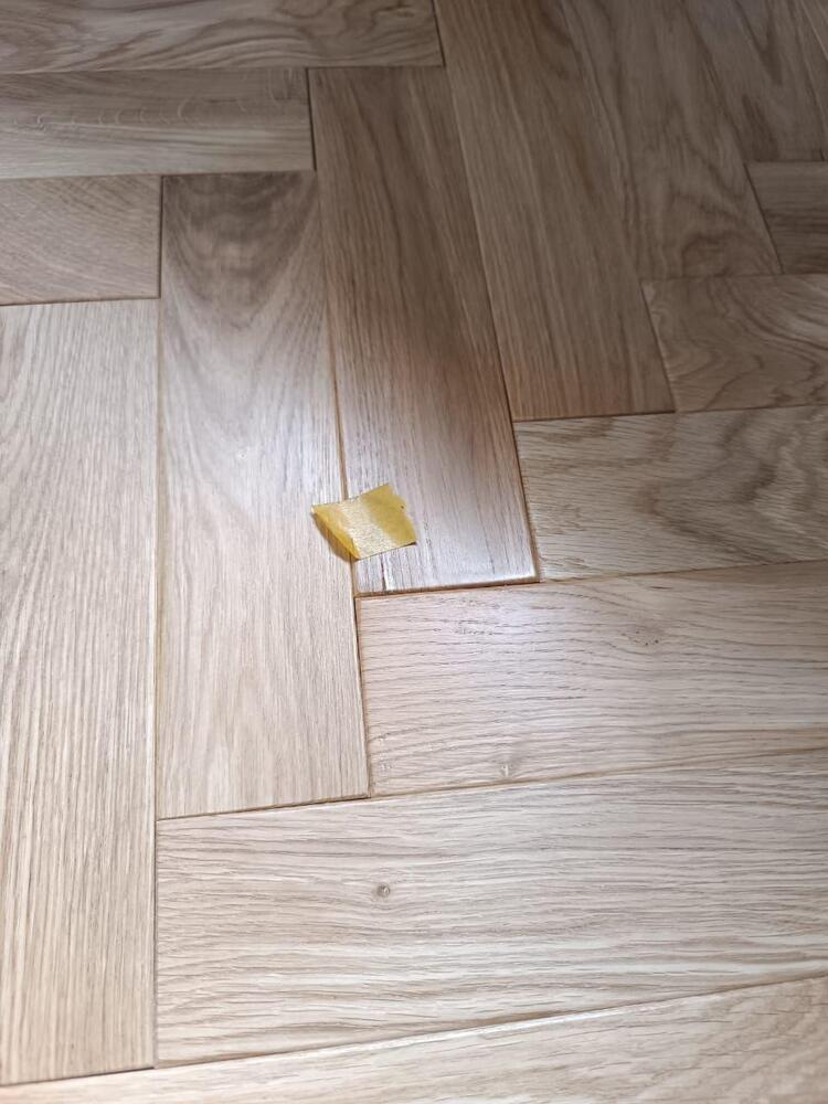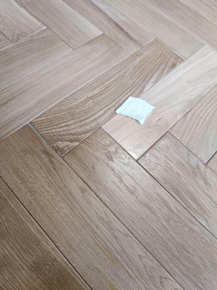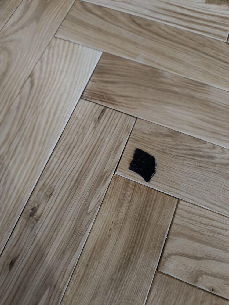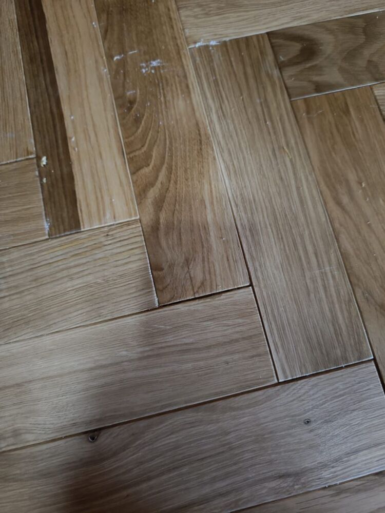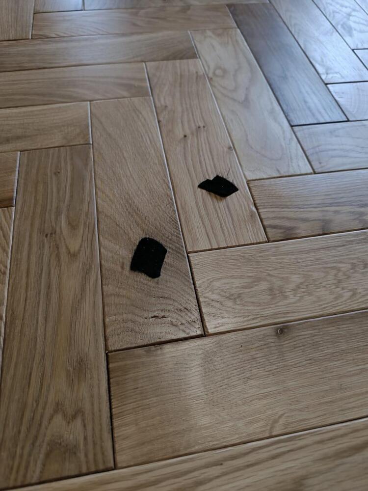 Клиентка обратилась после укладки паркета сторонними мастерами с нарушением технологии, после укладки на паркете осталось много пятен от клея, сколов и других повреждений.