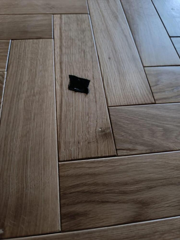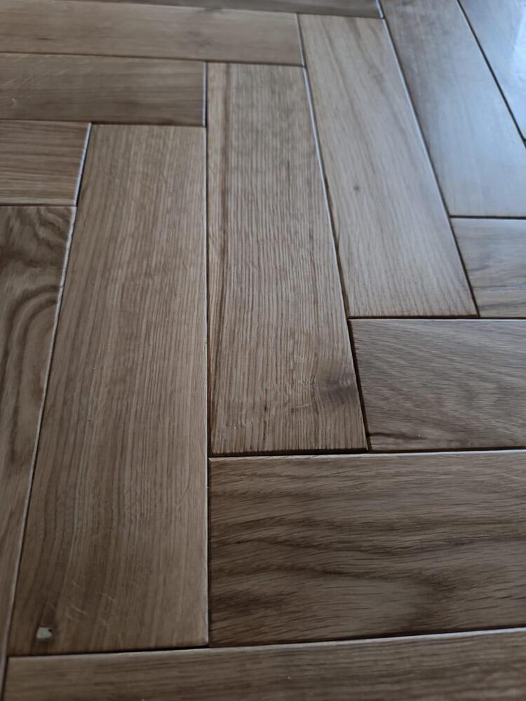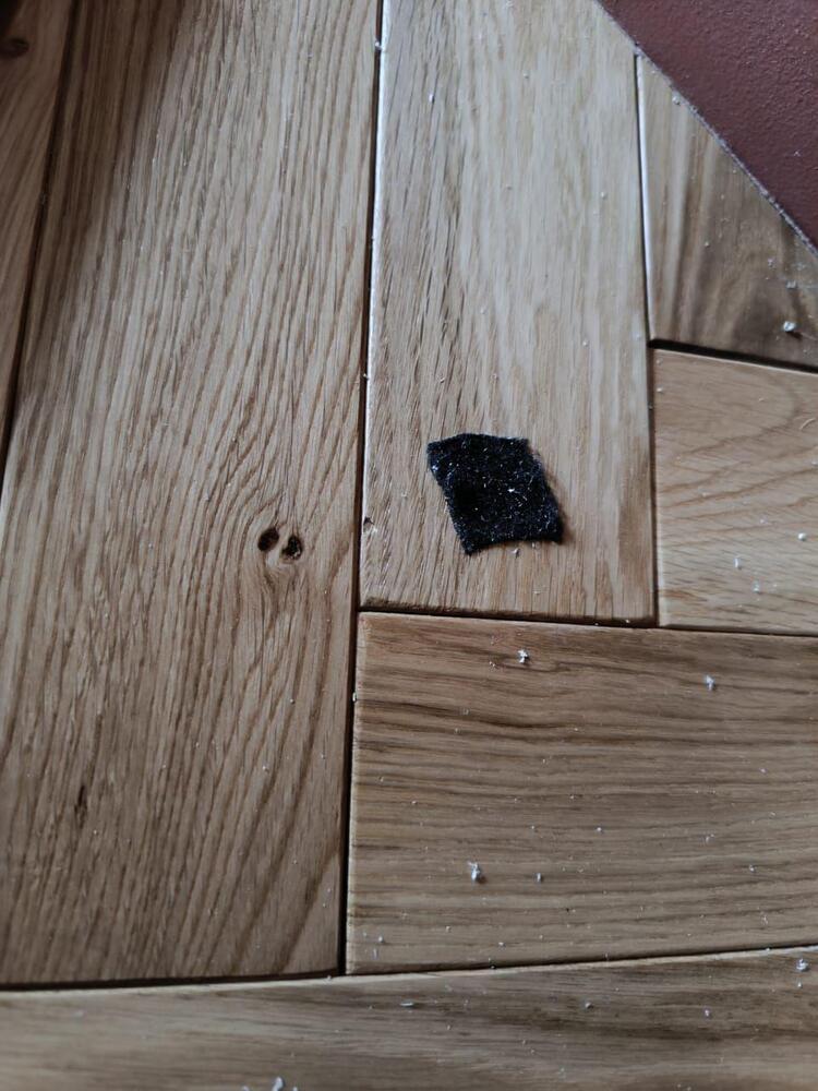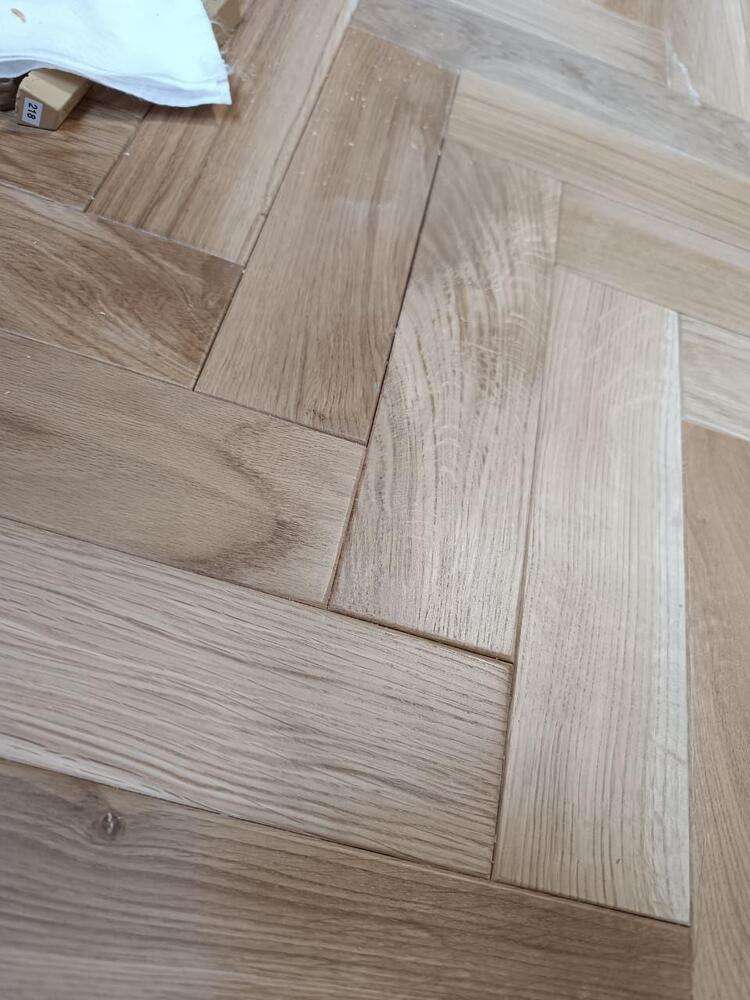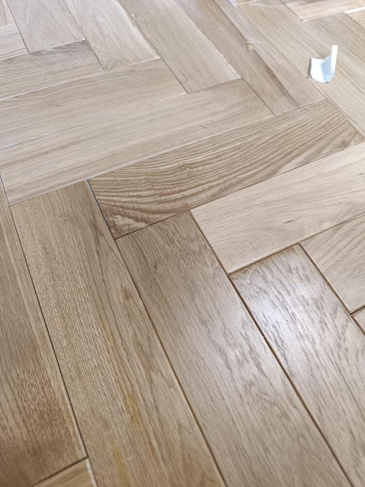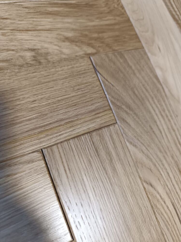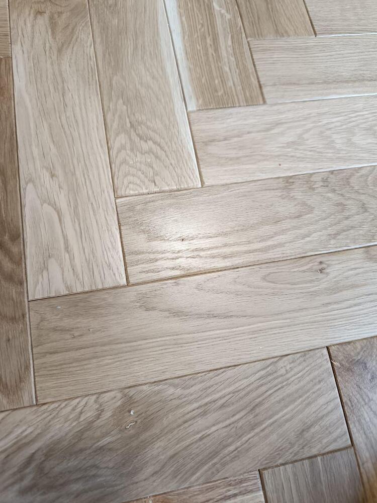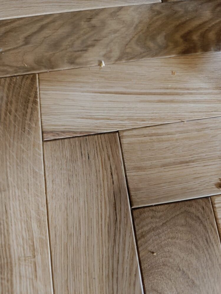 Клиентка обратилась после укладки паркета сторонними мастерами с нарушением технологии, после укладки на паркете осталось много пятен от клея, сколов и других повреждений.