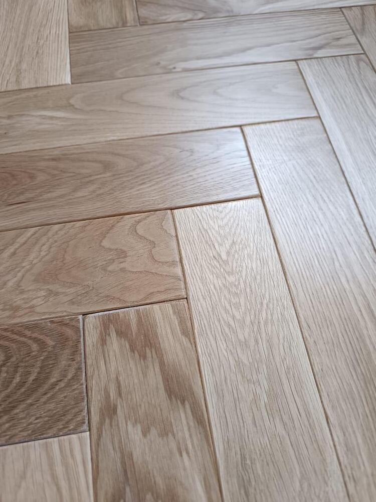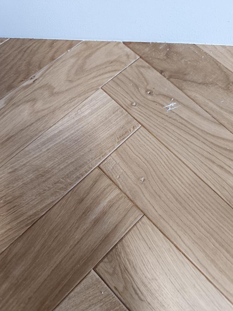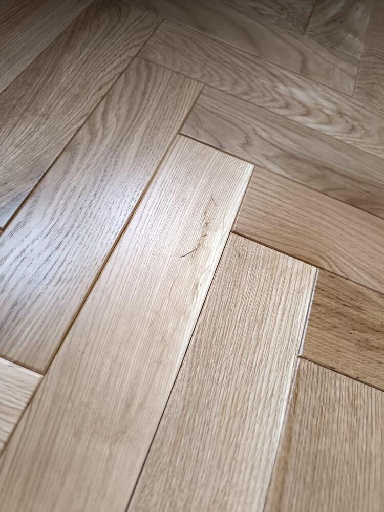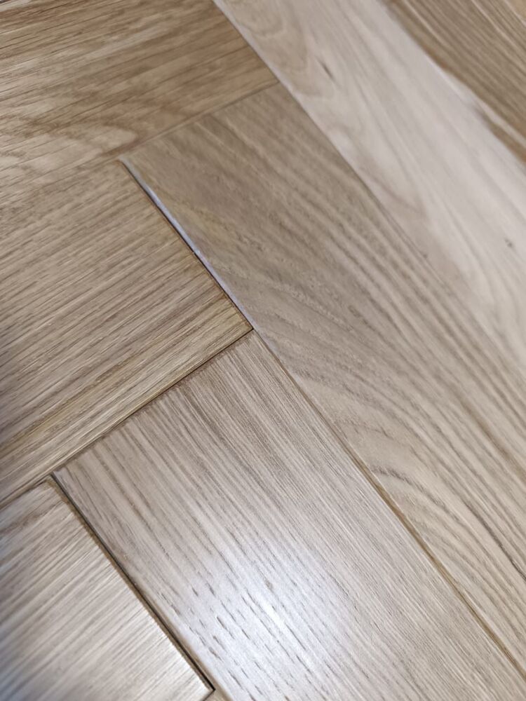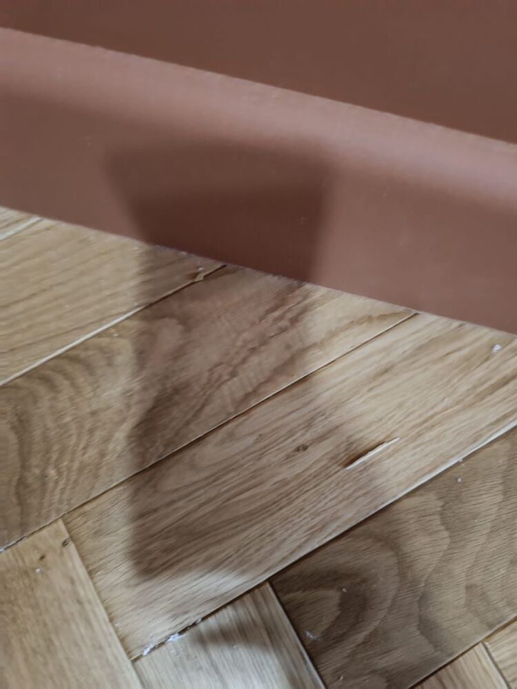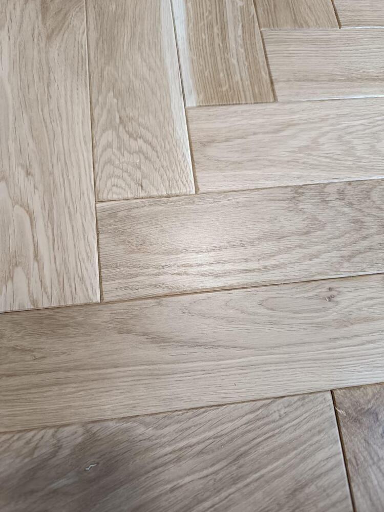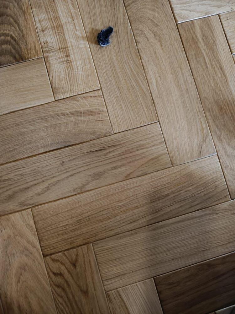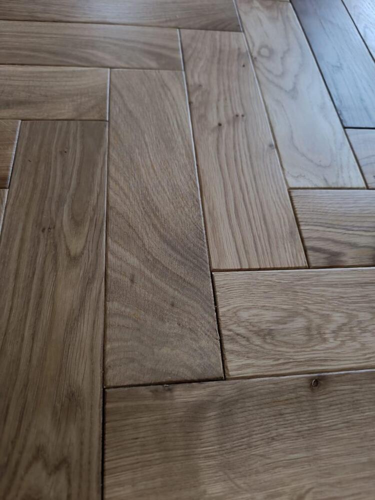 Клиентка обратилась после укладки паркета сторонними мастерами с нарушением технологии, после укладки на паркете осталось много пятен от клея, сколов и других повреждений.