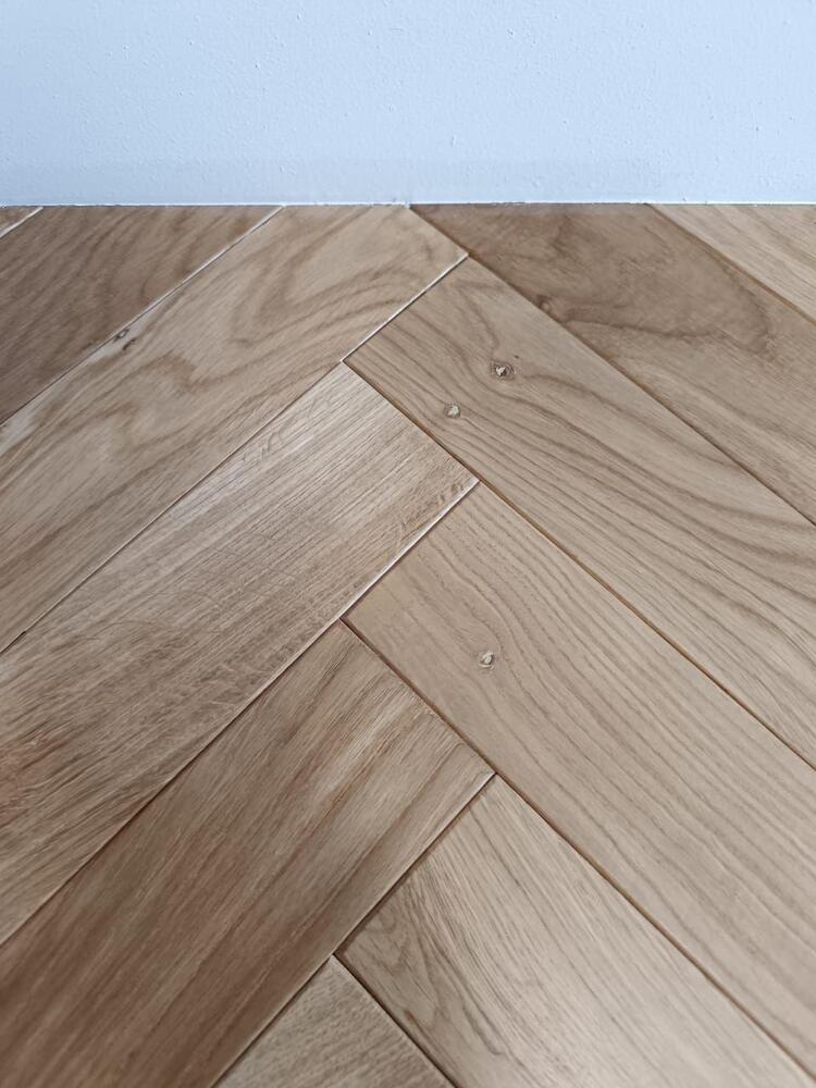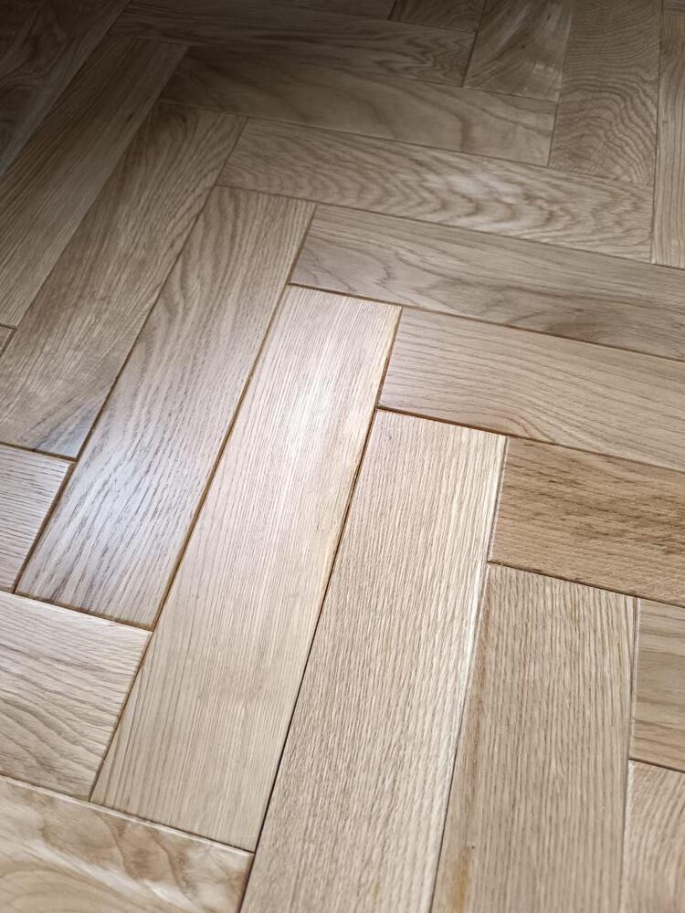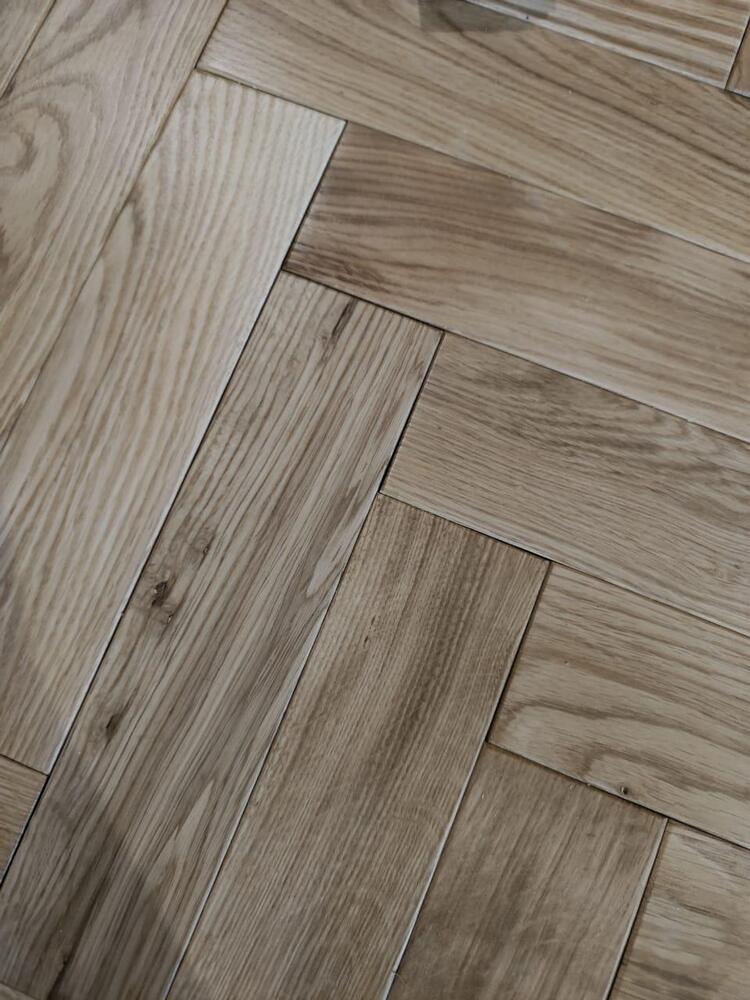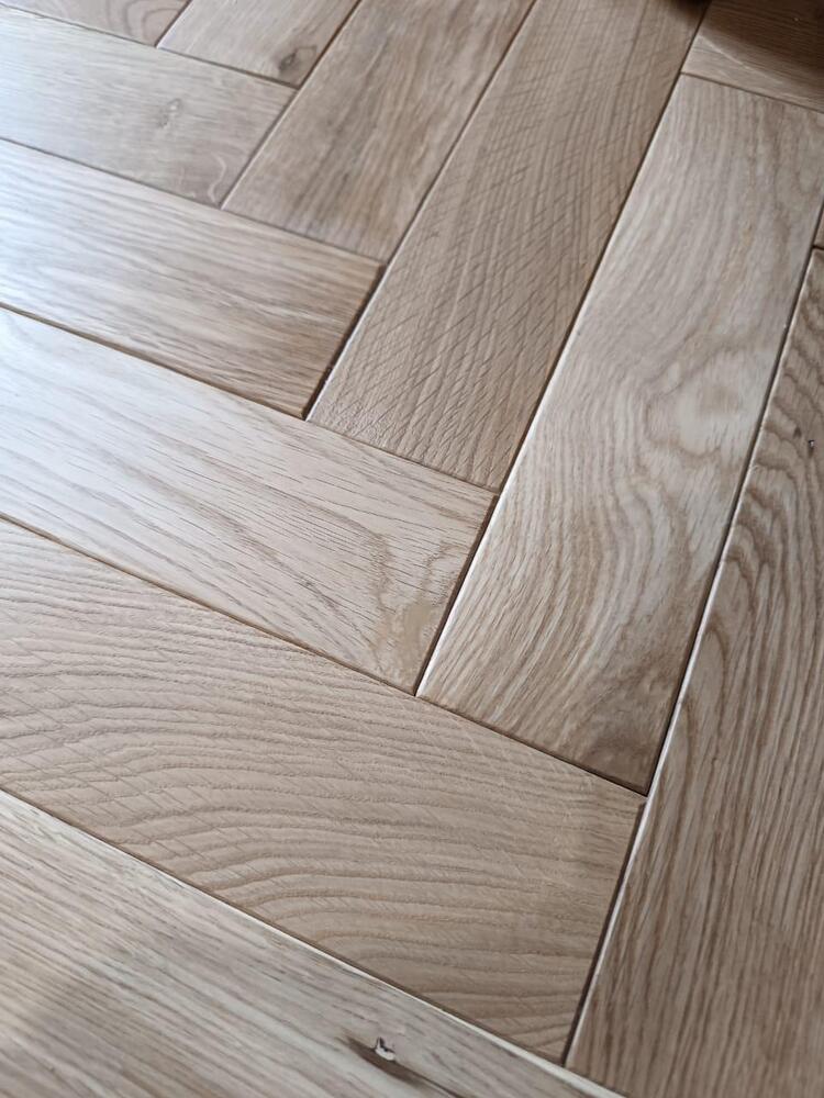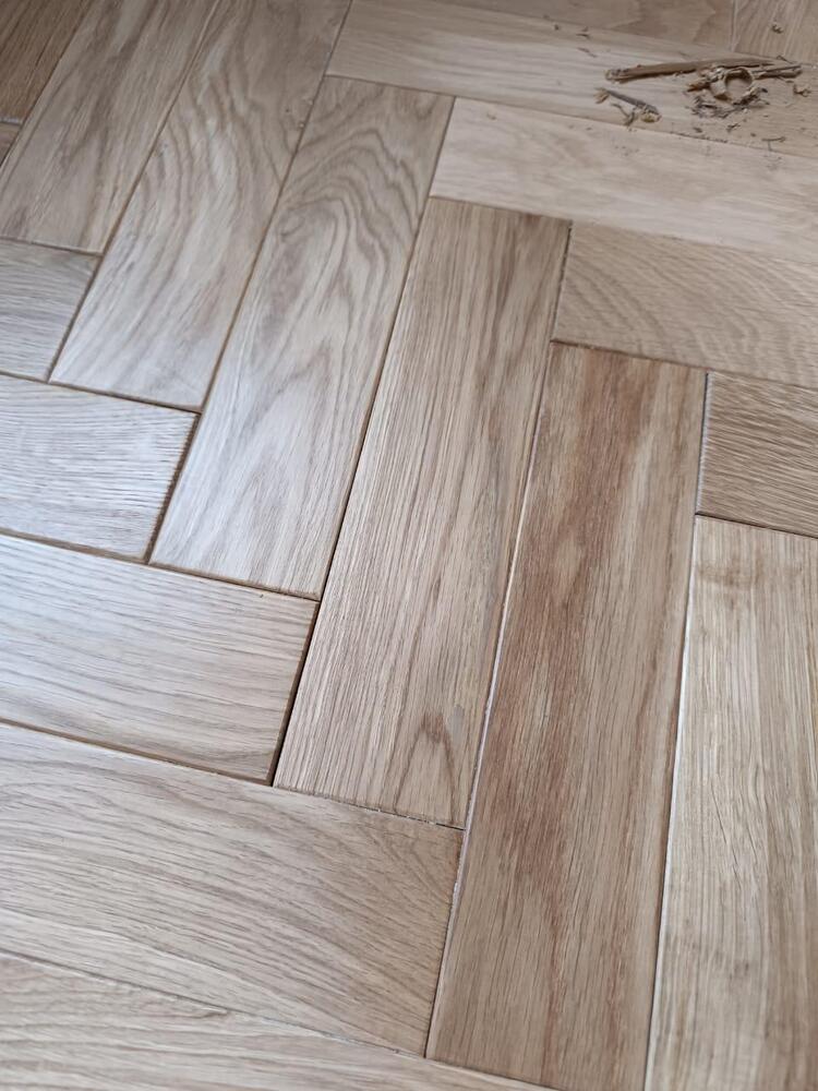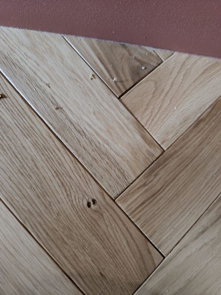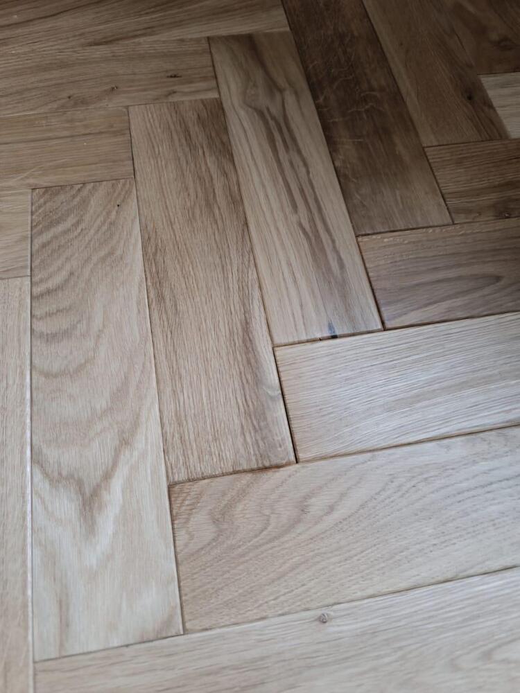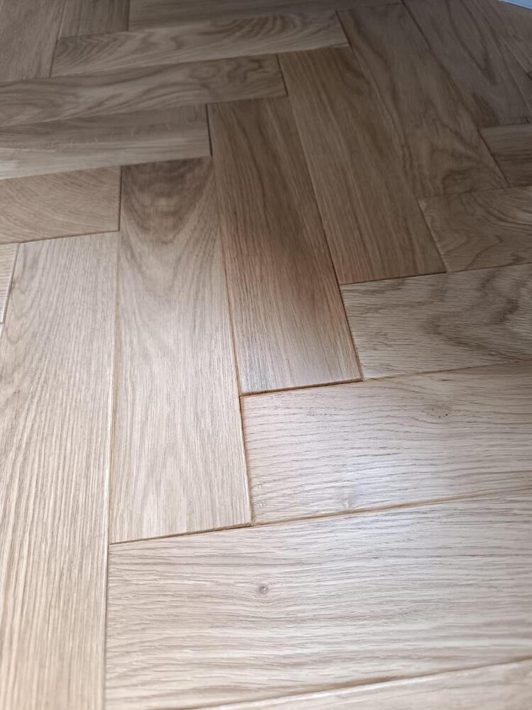 Клиентка обратилась после укладки паркета сторонними мастерами с нарушением технологии, после укладки на паркете осталось много пятен от клея, сколов и других повреждений.