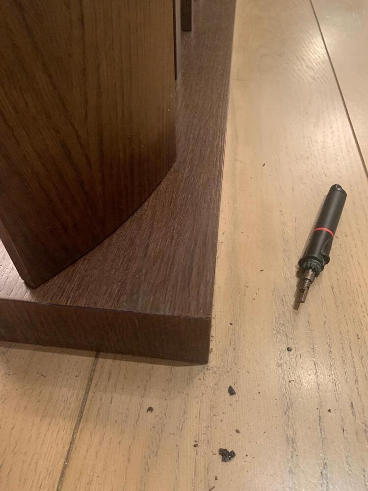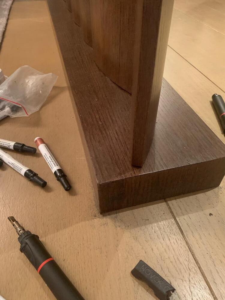 Мастера отдела реставрации компании «Вернисаж» под руководством Романа Бирюлина выполнили реставрацию детали интерьера, которая пострадала из-за действий домашнего животного (собака погрызла угол). Деталь сделана из МДФ, шпонирована дубом, дуб тонирован. Реставрация производилась при помощи реставрационных материалов Novoryt (Швейцария) – шпатлевки-расплавы, ретуширующие краски и безореольные лаки.
