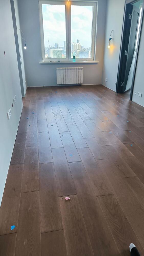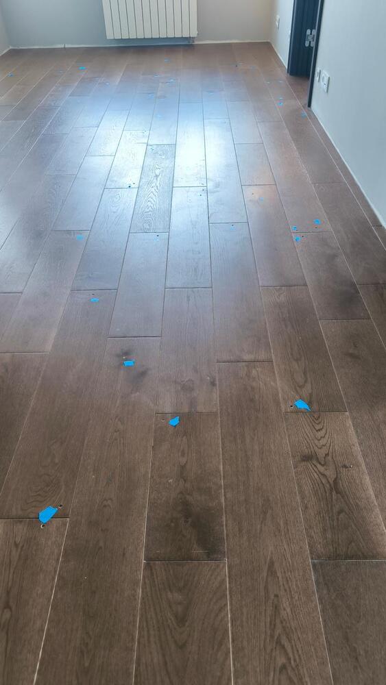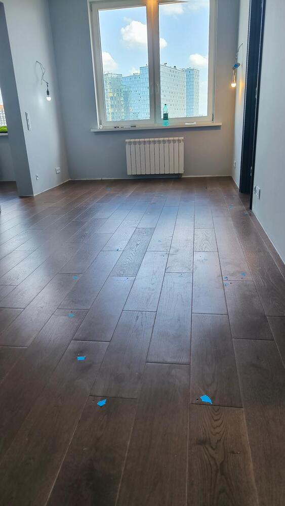 - Кроме этого, на паркете после других исполнителей остались различные царапины, сколы и даже повреждения покрытия из-за скотча (при отрыве скотча от паркета произошло отслоение покрытия). Все это тоже пришлось устранять.