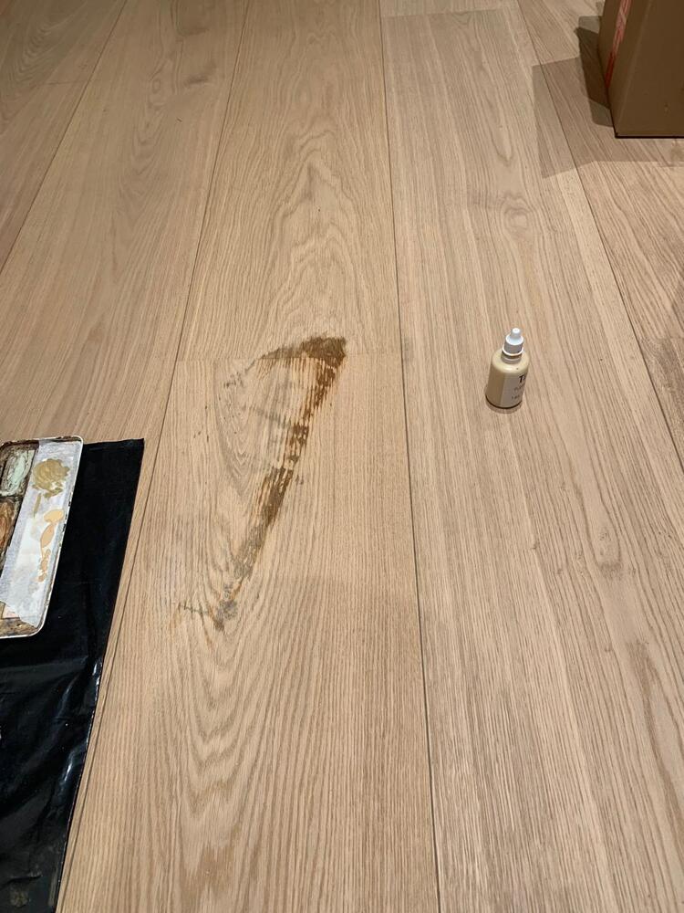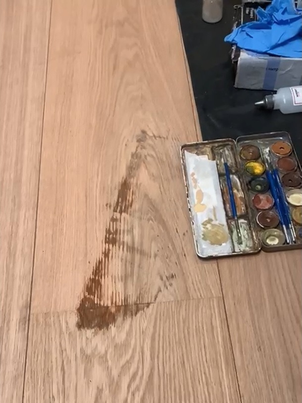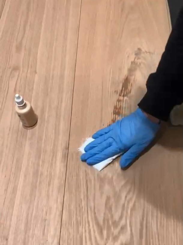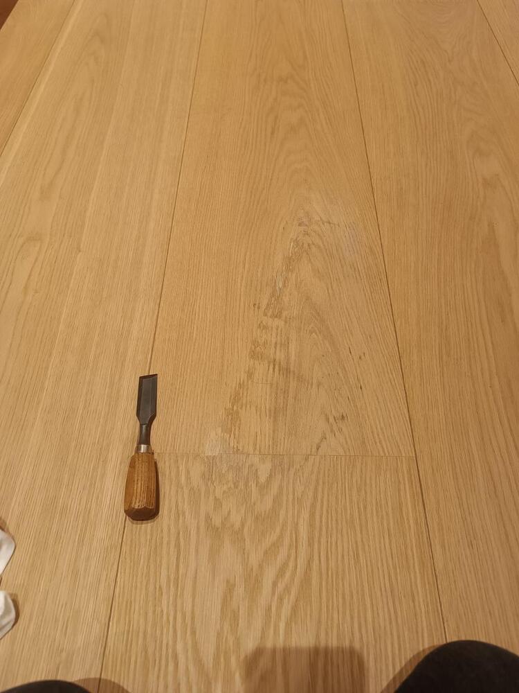 Мастер Антон компании «Вернисаж» выполнил удаление пятна с паркета на объекте в г Пушкин, в Санкт-Петербурге. На паркете осталось пятно от сумки, испачканной в химии (точно выяснить не удалось). Паркетная доска с тонированным дубом на МДФ, толщина шпона дуба 1 мм, в запасе у клиента была только 1 доска. Для удаления пятна использовали материалы: