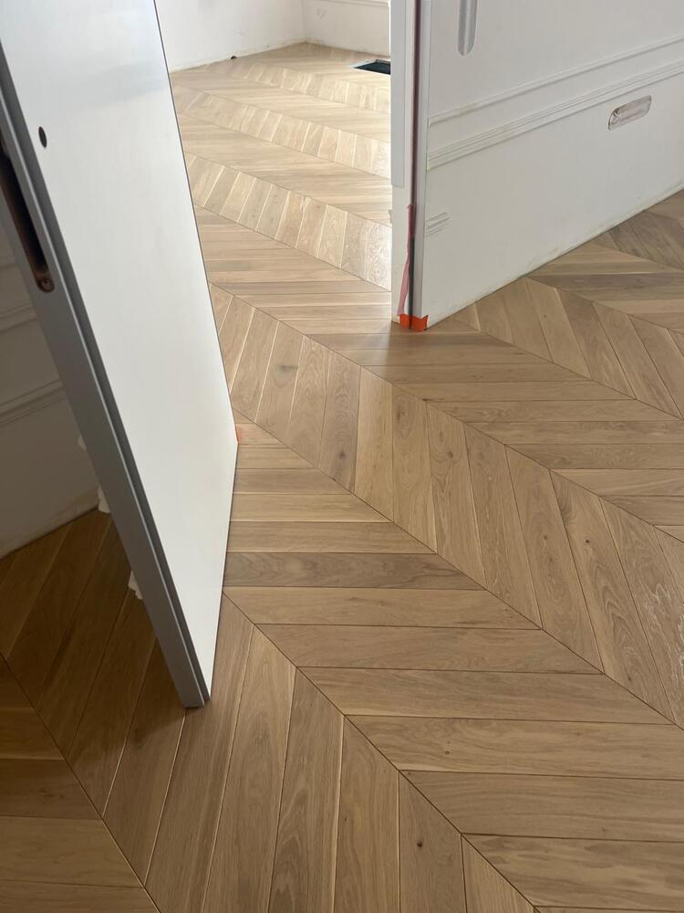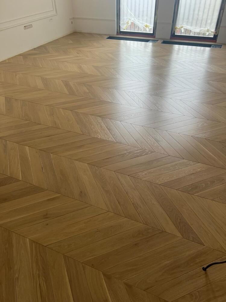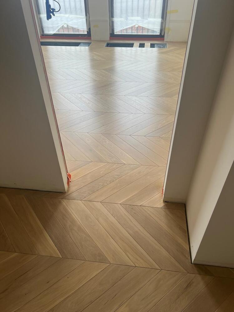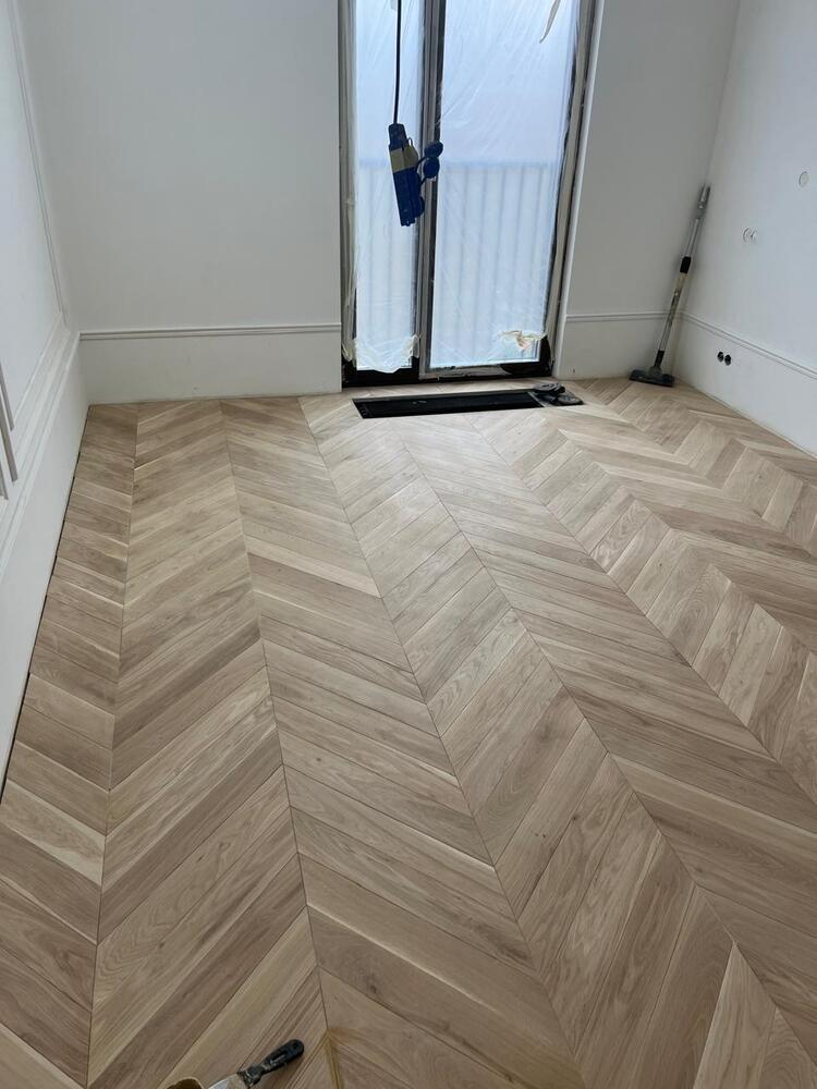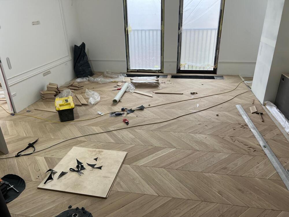 Мастера компании «Вернисаж» выполнили укладку инженерной доски рисунком французская елка на объекте на Васильевском острове в Санкт-Петербурге.