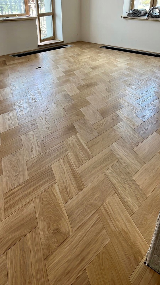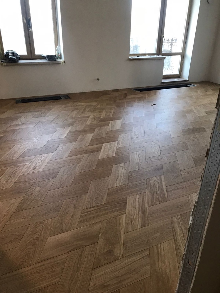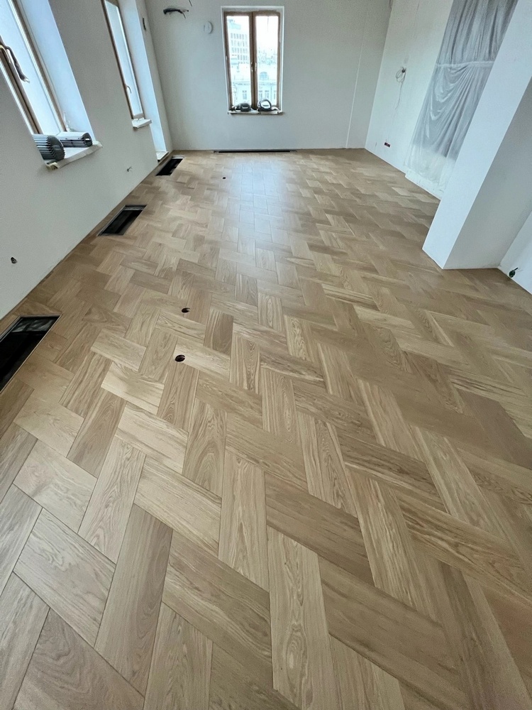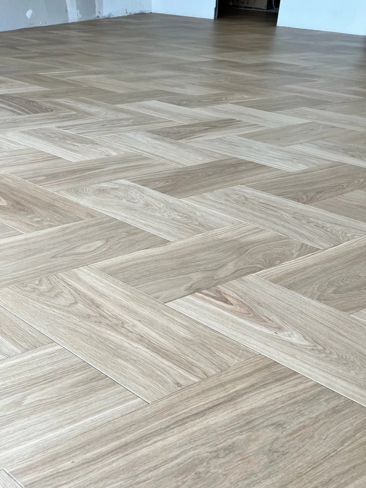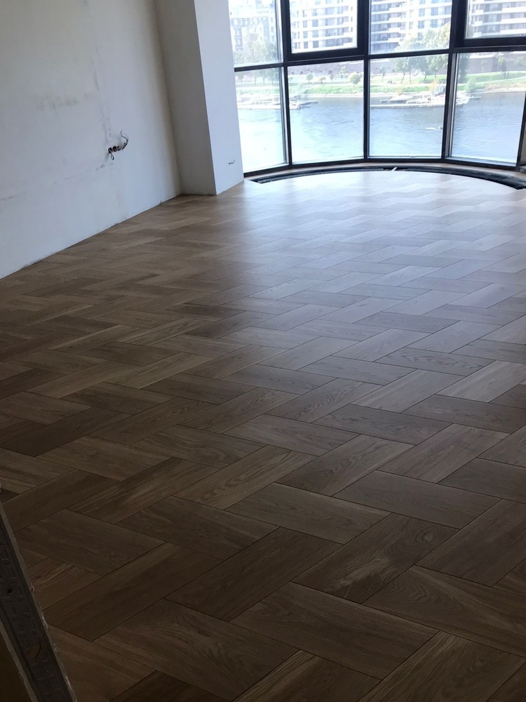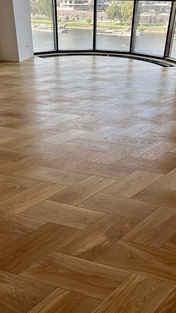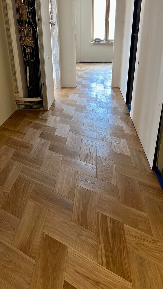 Мастера компании «Вернисаж» выполнили укладку инженерной доски рисунком «итальянская елочка» в квартире в Санкт-Петербурге. Детали размером 205х473х16 мм изготовлены из инженерной доски с фаской по периметру!