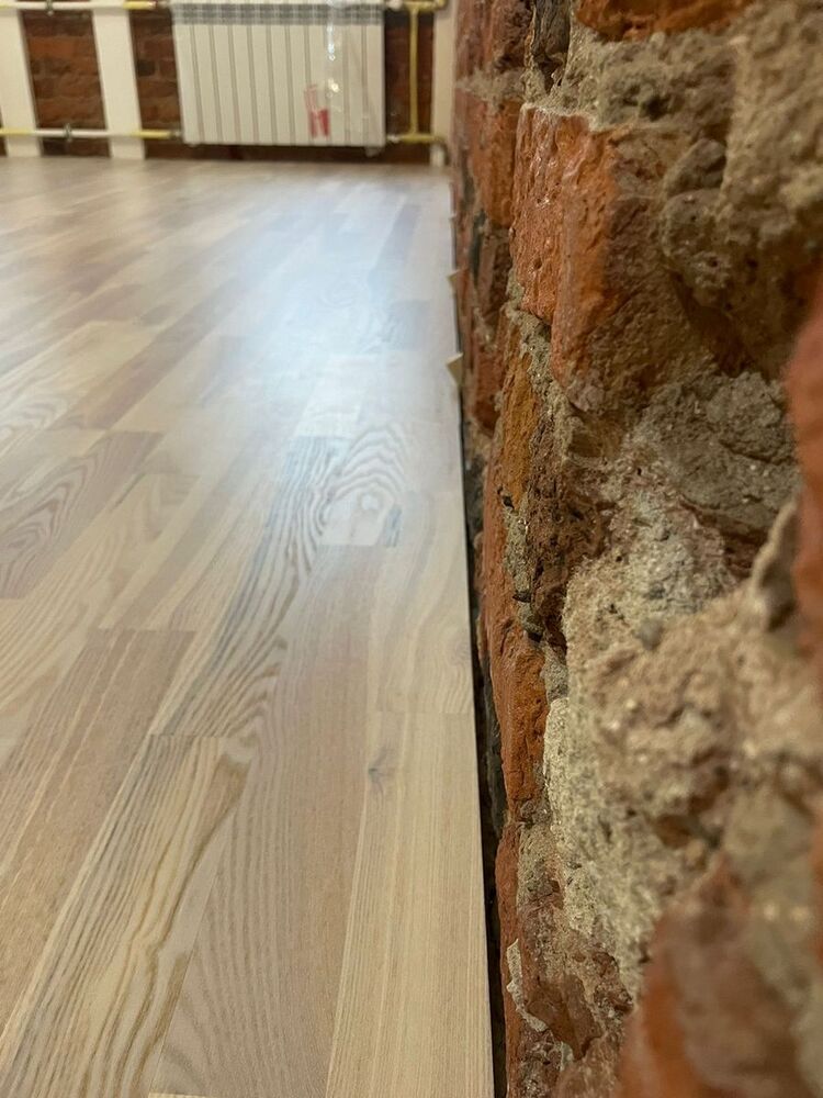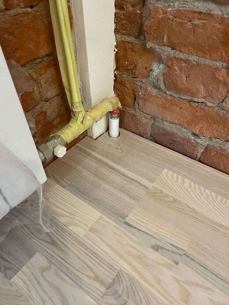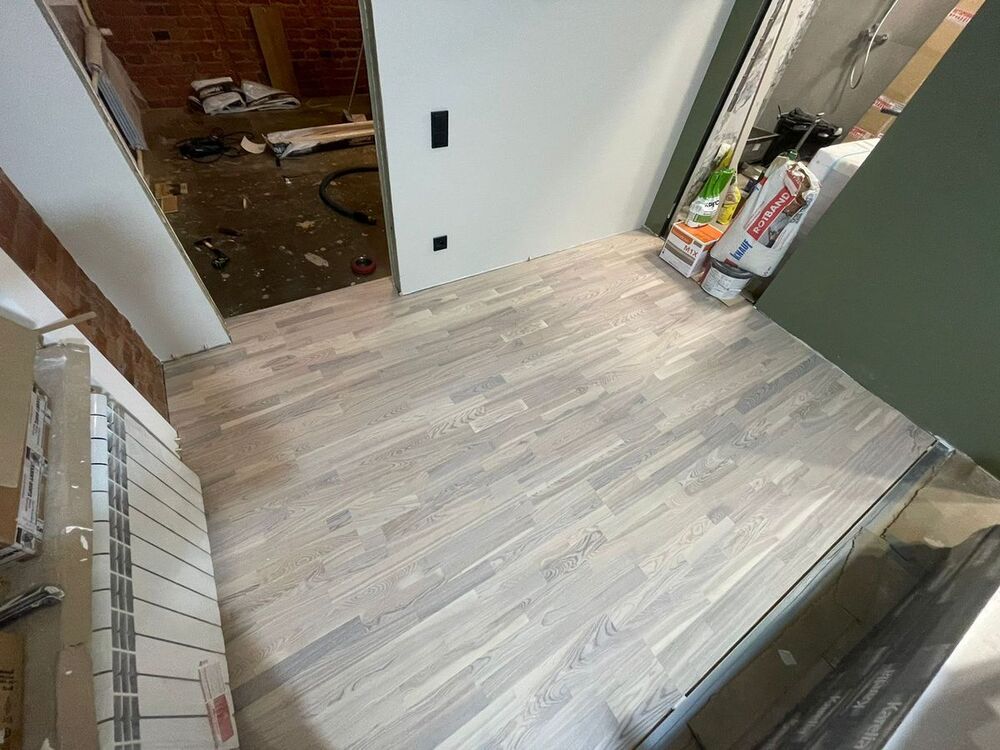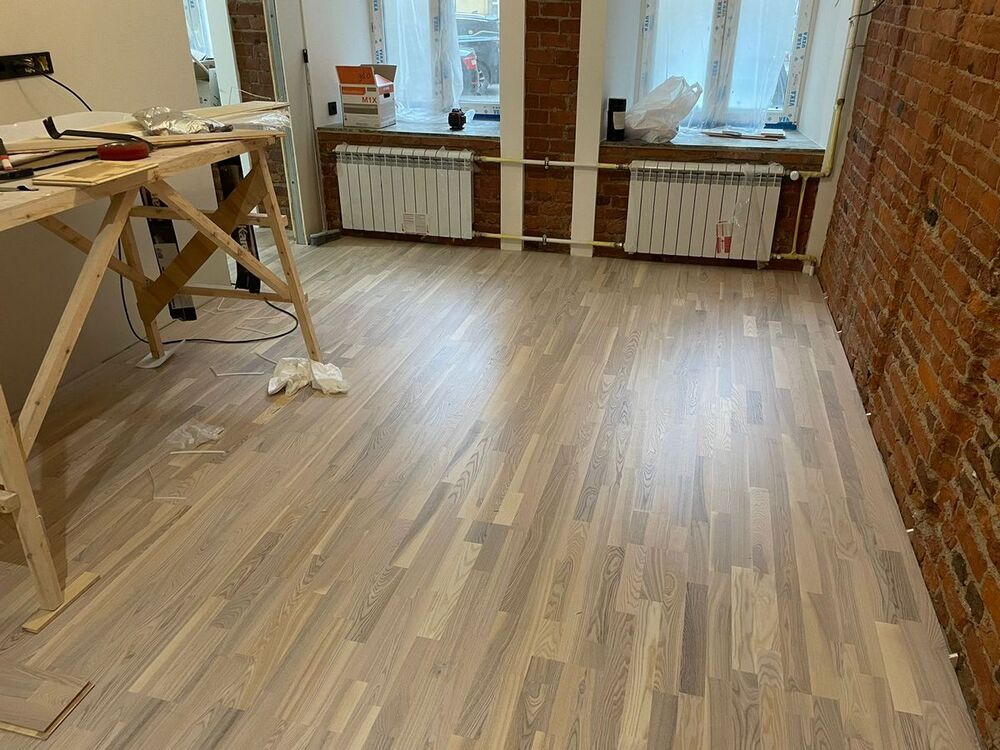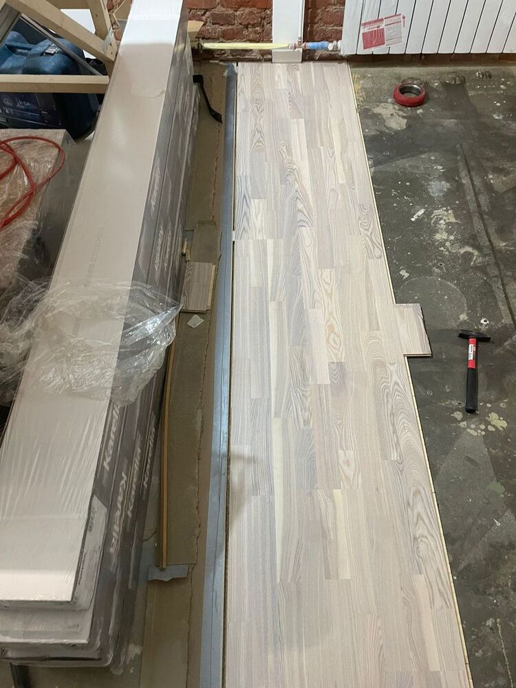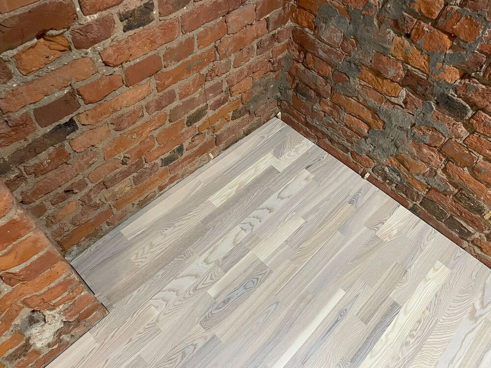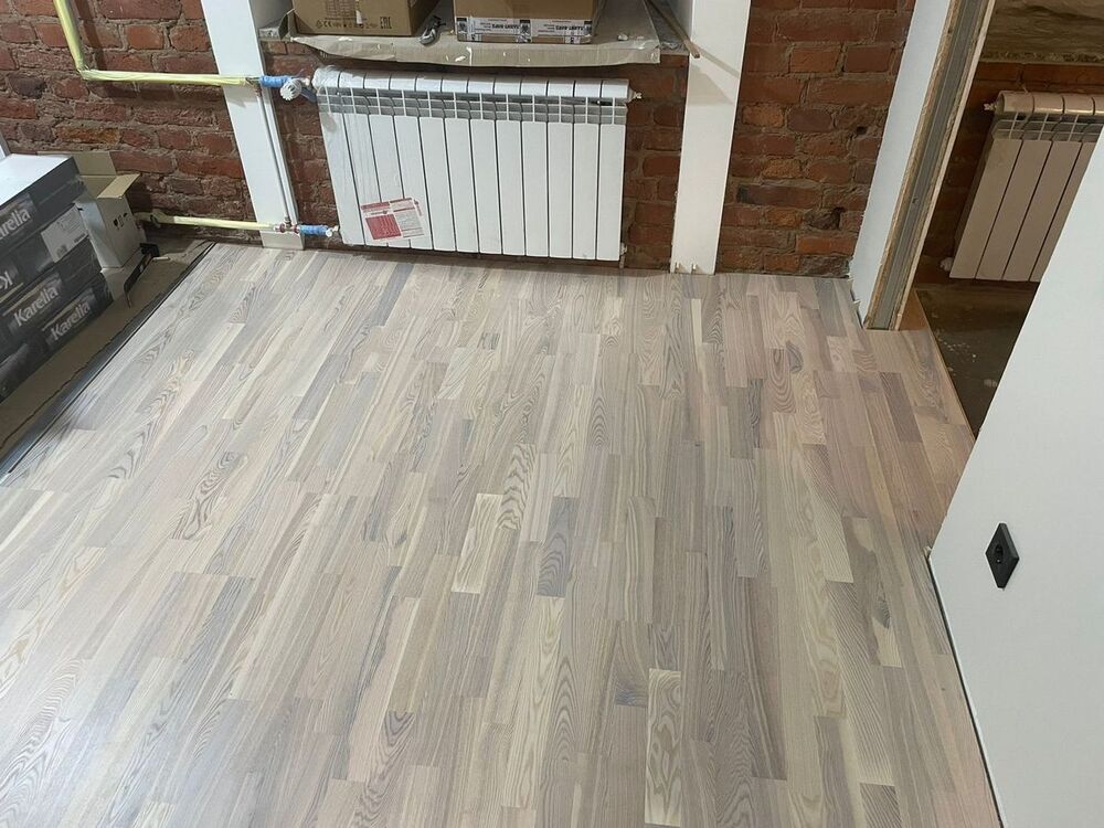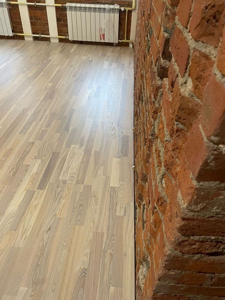 Укладывалась трехполосная паркетная доска Karelia из ясеня – хороший выбор для бюджетных проектов с небольшими метражами и современным стилем. Паркет укладывали в старом фонде в помещениях с кирпичными стенами, приходилось делать много подрезок доски.