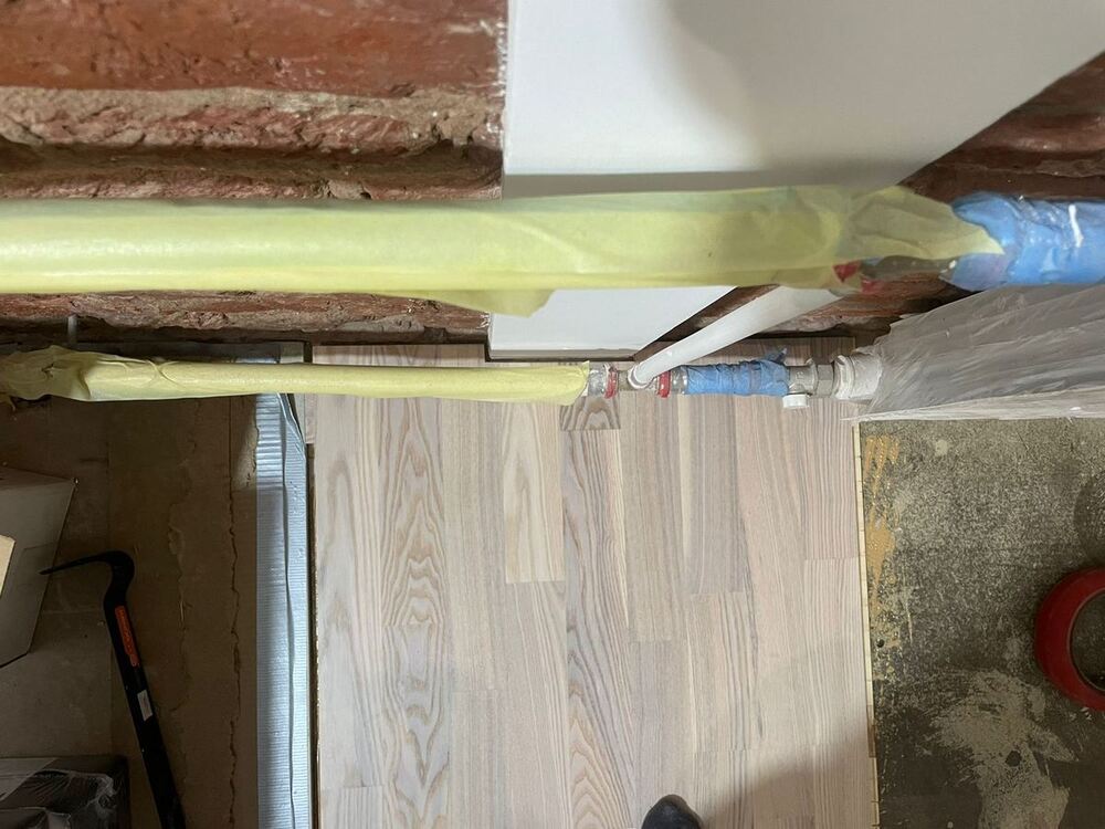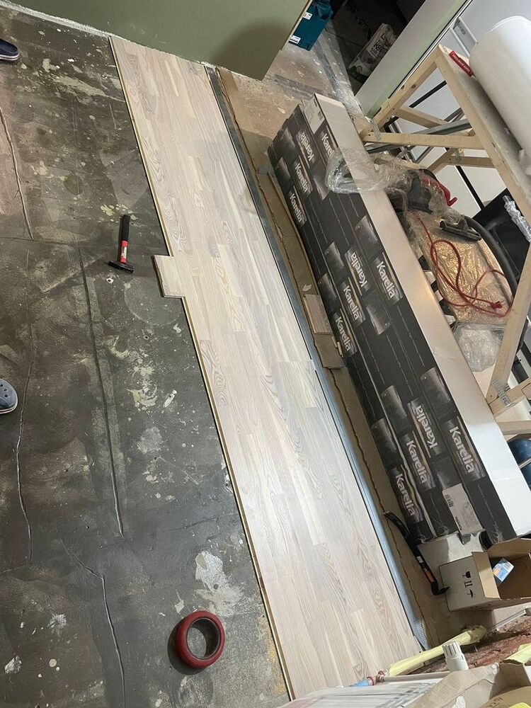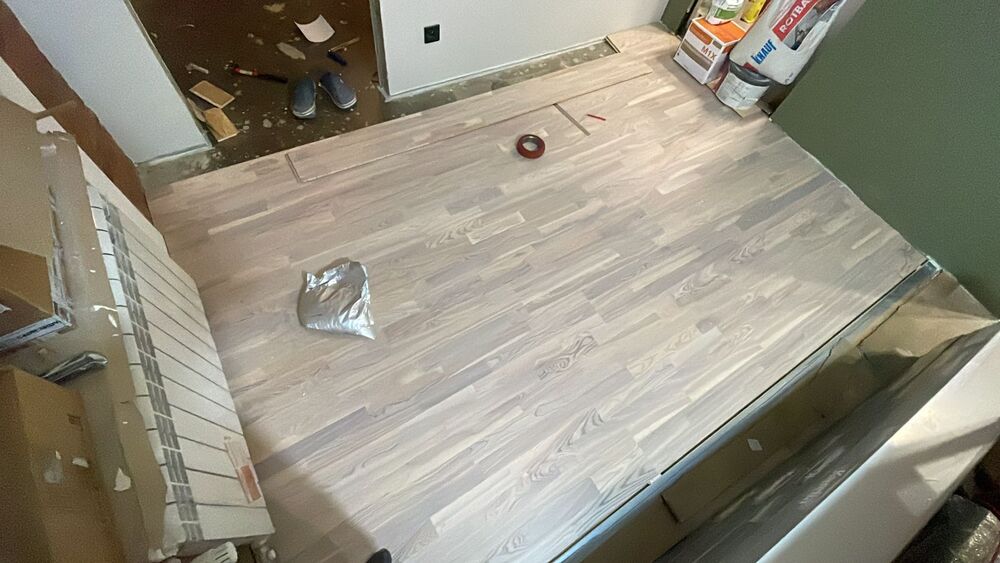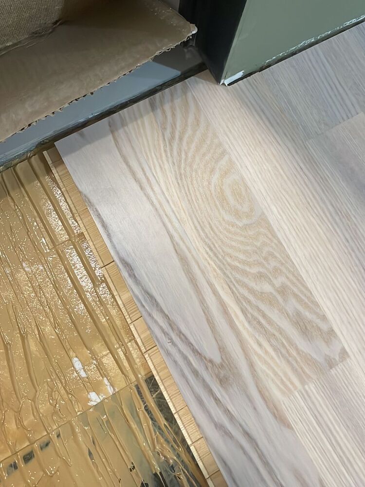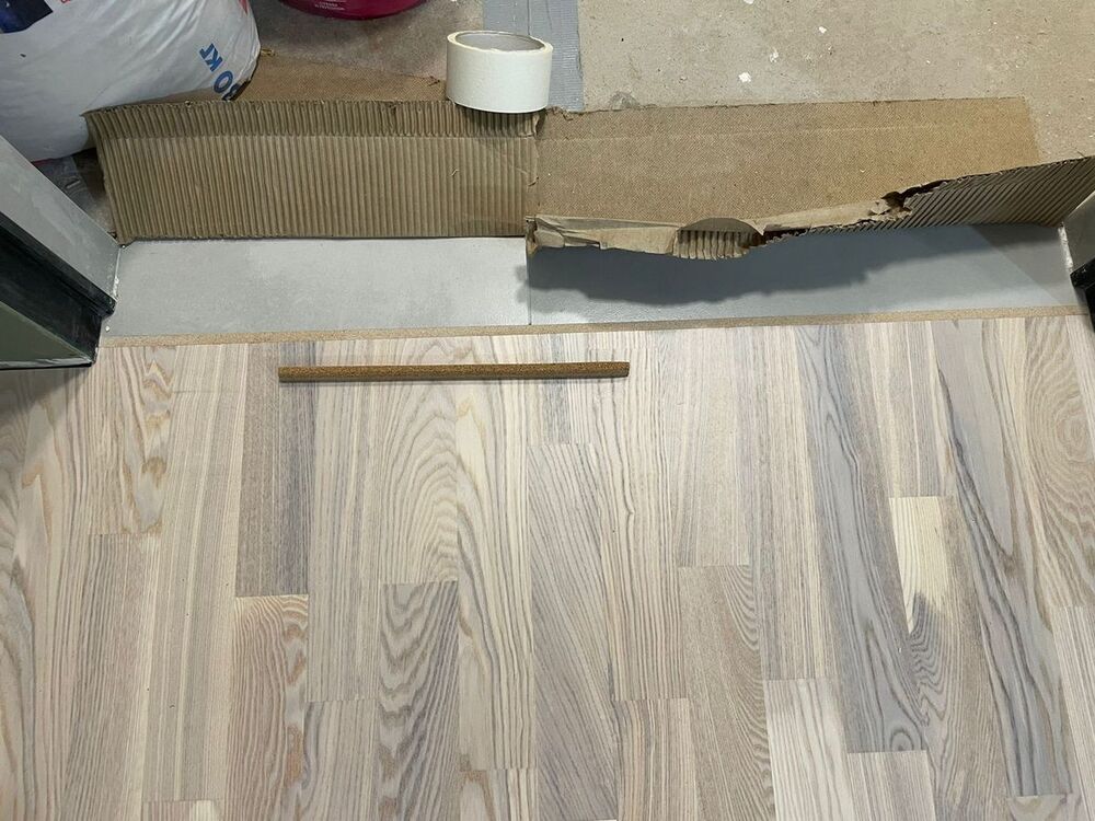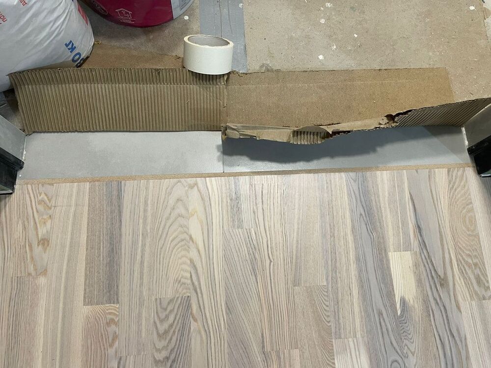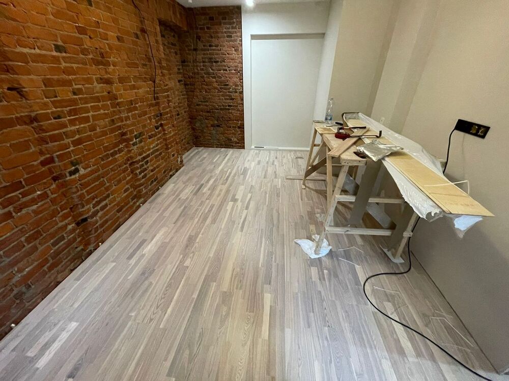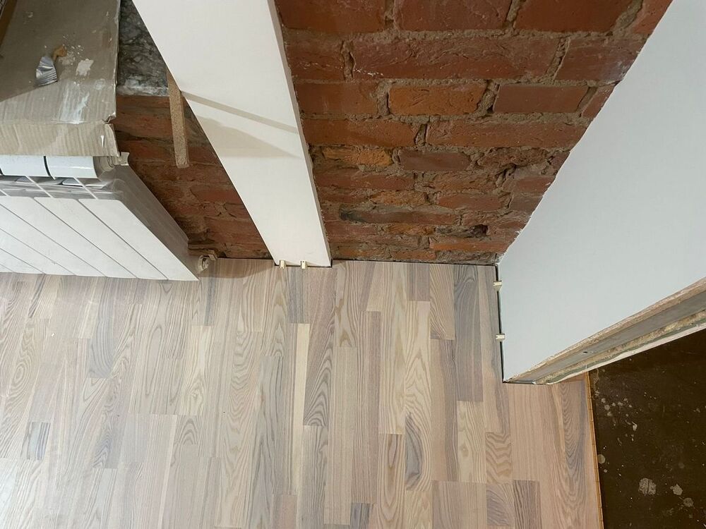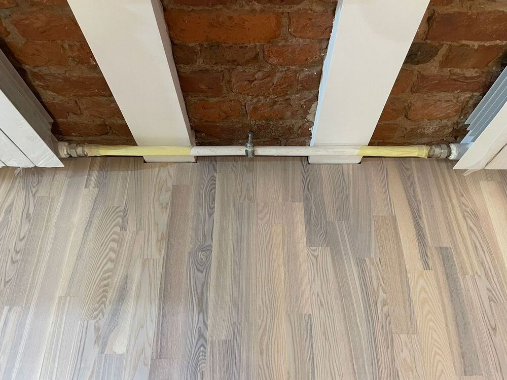 Укладывалась трехполосная паркетная доска Karelia из ясеня – хороший выбор для бюджетных проектов с небольшими метражами и современным стилем. Паркет укладывали в старом фонде в помещениях с кирпичными стенами, приходилось делать много подрезок доски.