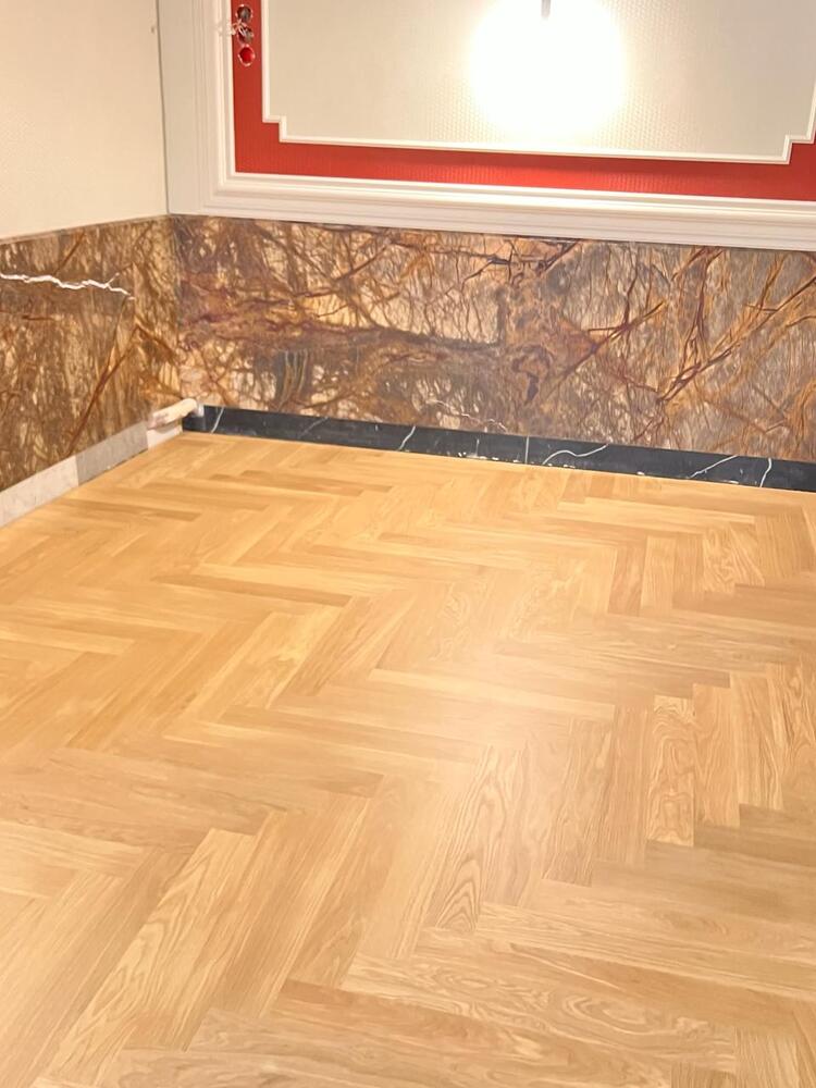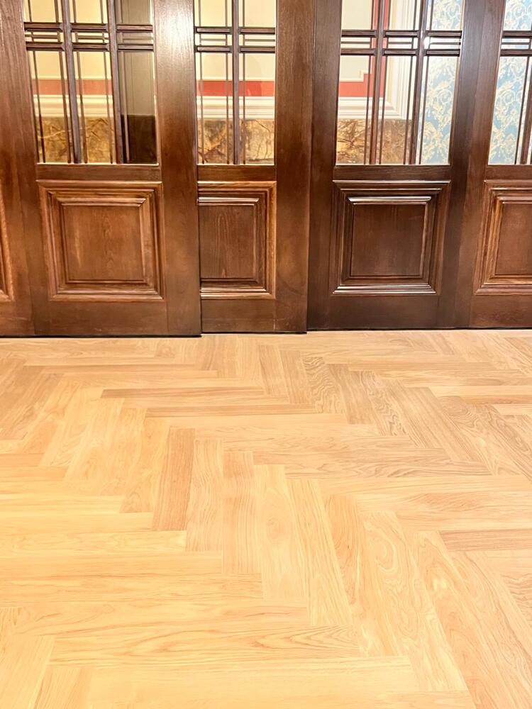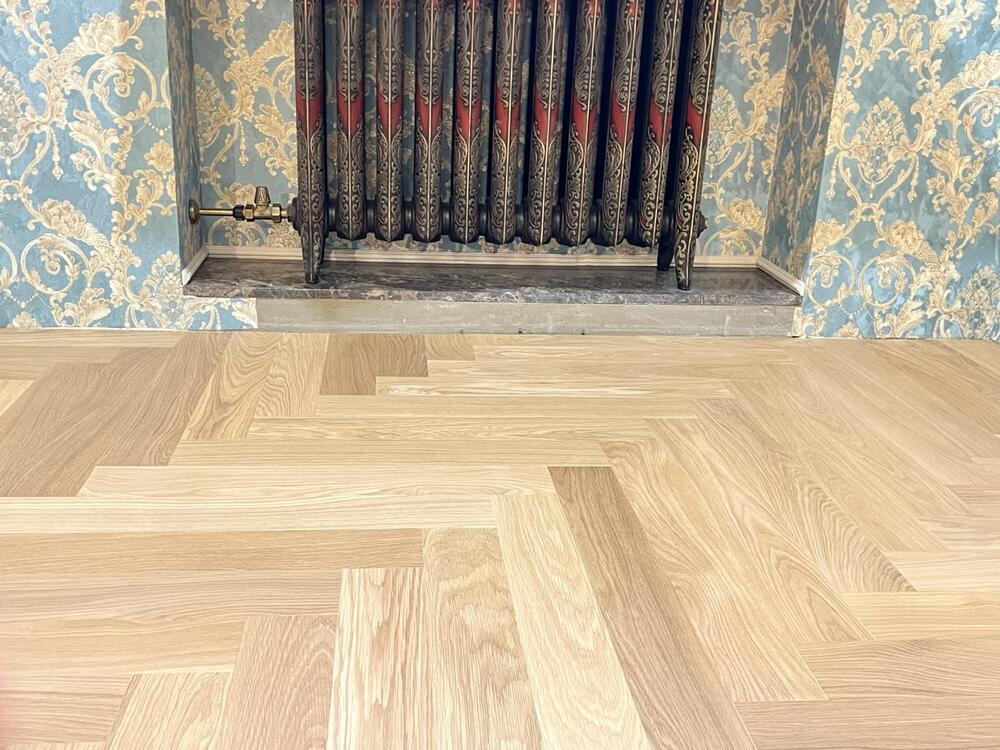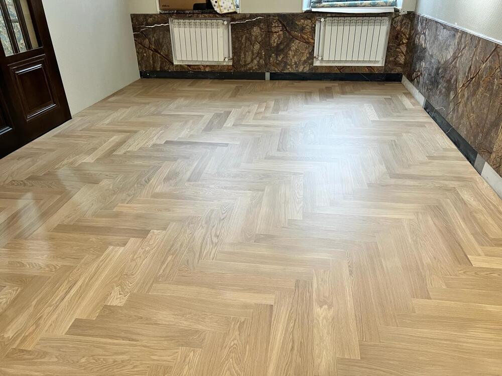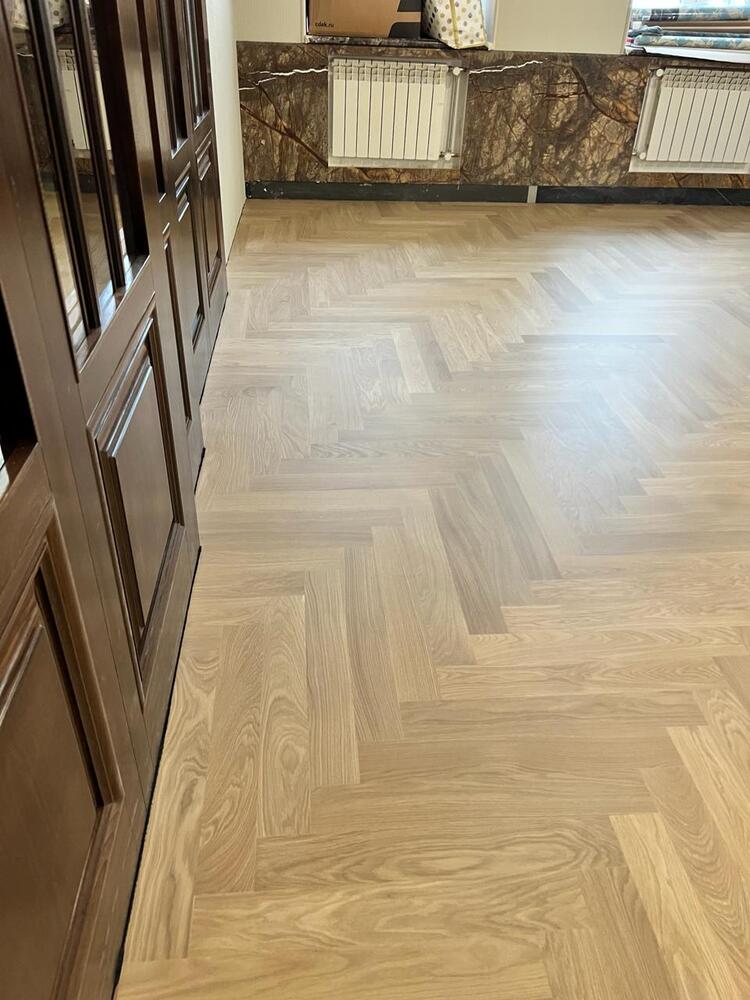 Мастера компании «Вернисаж» выполнили укладку штучного паркета рисунком английская елочка на объекте в Кронштадте в Санкт-Петербурге.