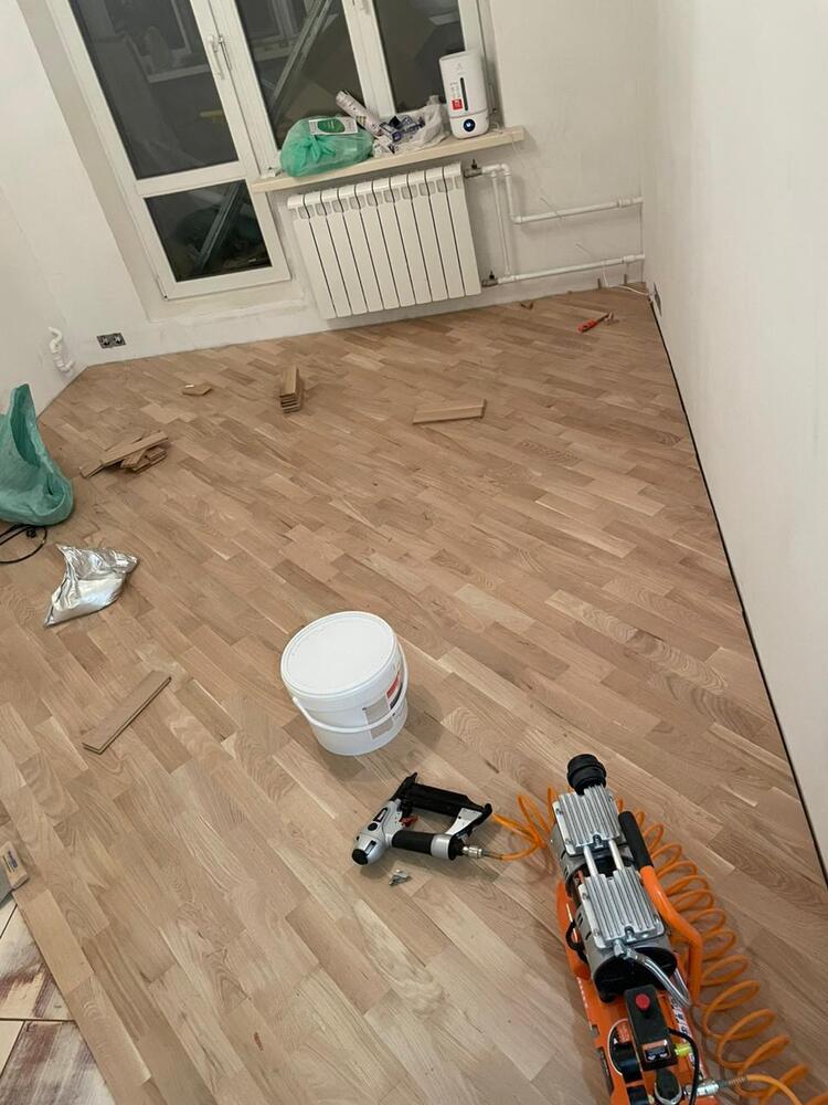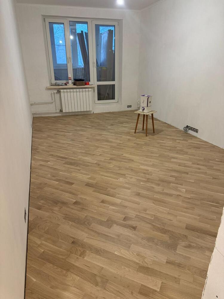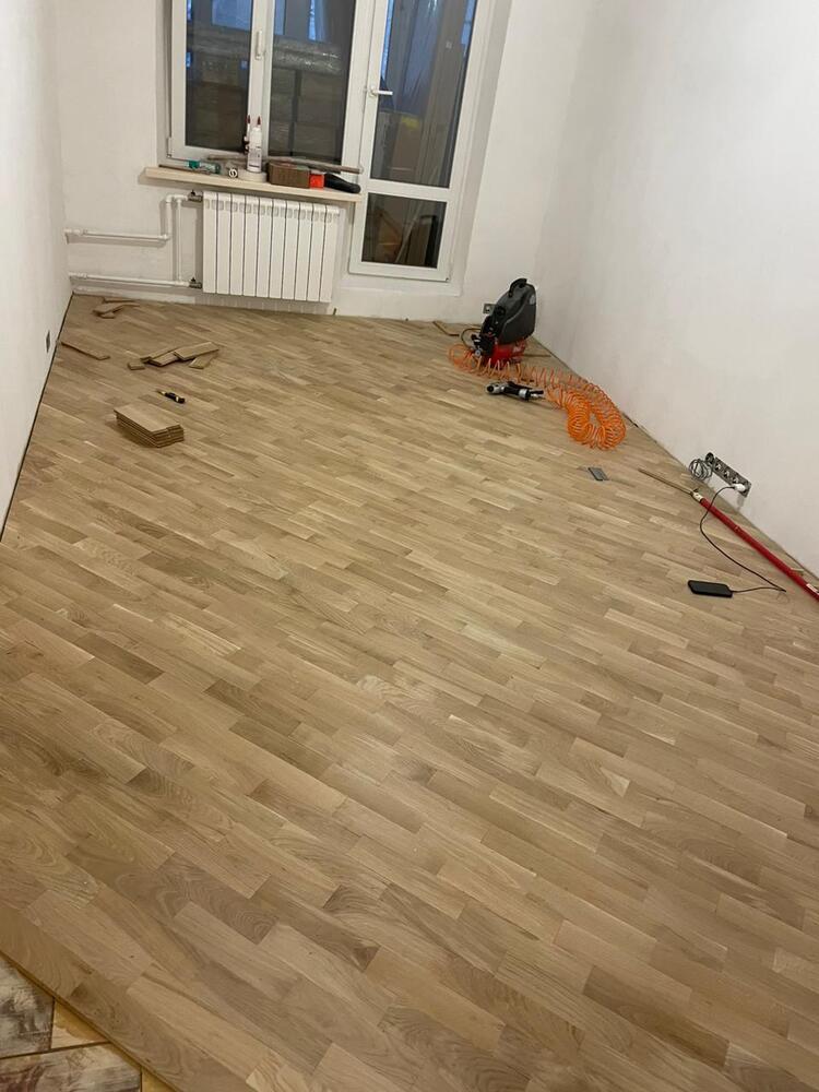 Мастера компании «Вернисаж» выполнили укладку штучного паркета на объекте на ул. Теплый Стан в Москве. Важным условием было защитить паркет от колебаний климата, так как, по словам заказчика, зимой влажность в помещении составляет 20%, а летом 80%. Было принято решение многослойной лакировки и устройства гидрозамка.
