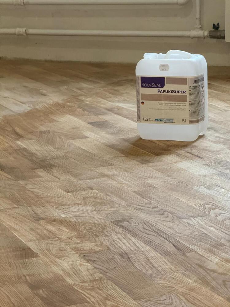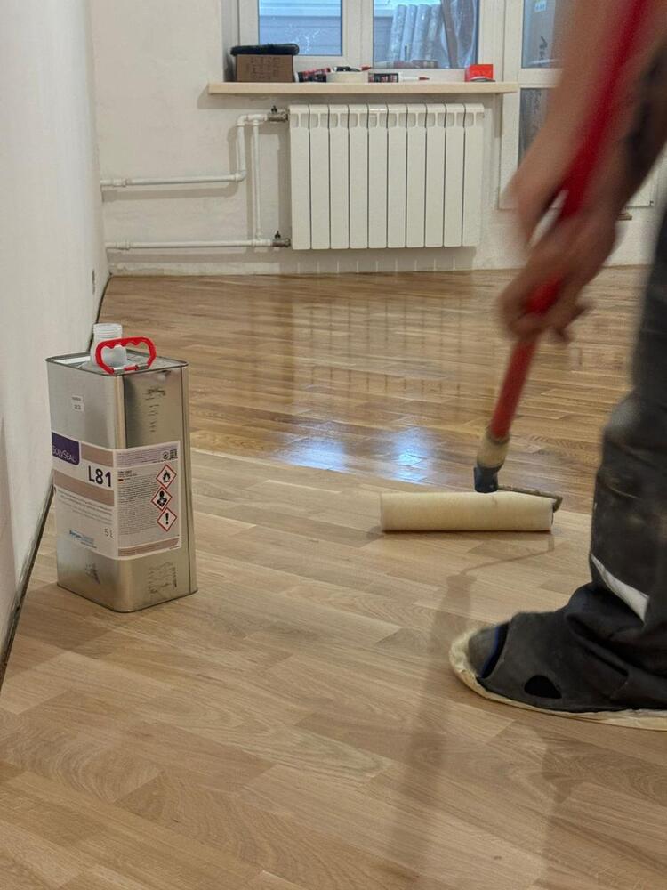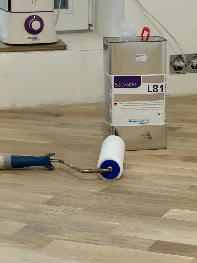 - покрытие паркета однокомпонентным поджигающим полиуретановым грунтовочным лаком Berger L81 в 3 слоя