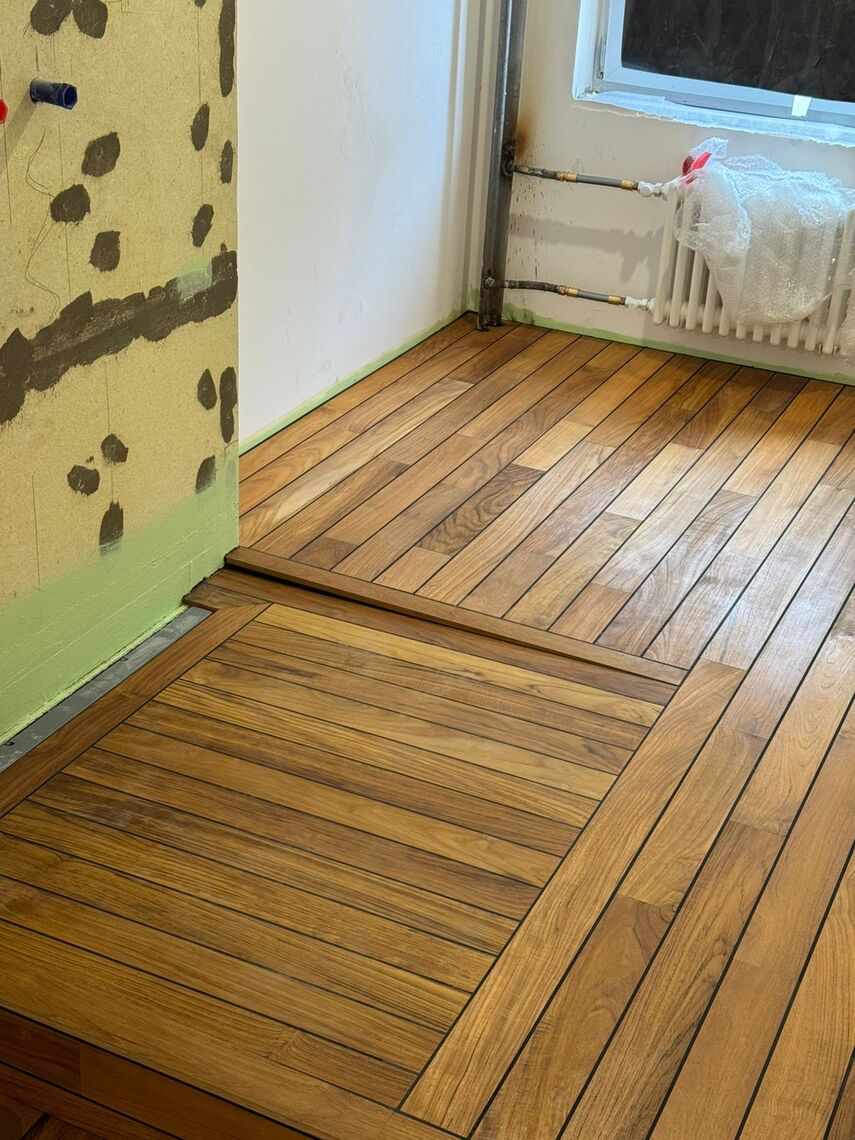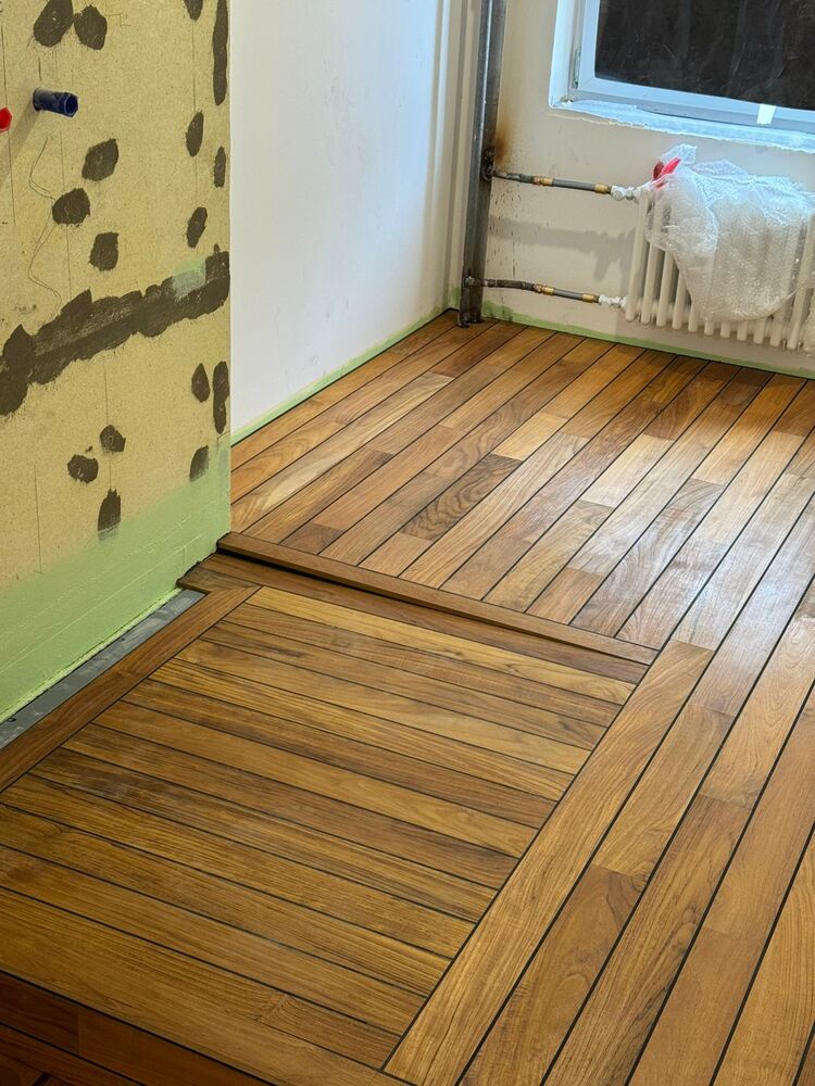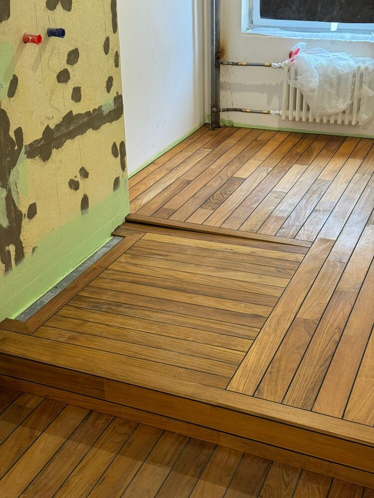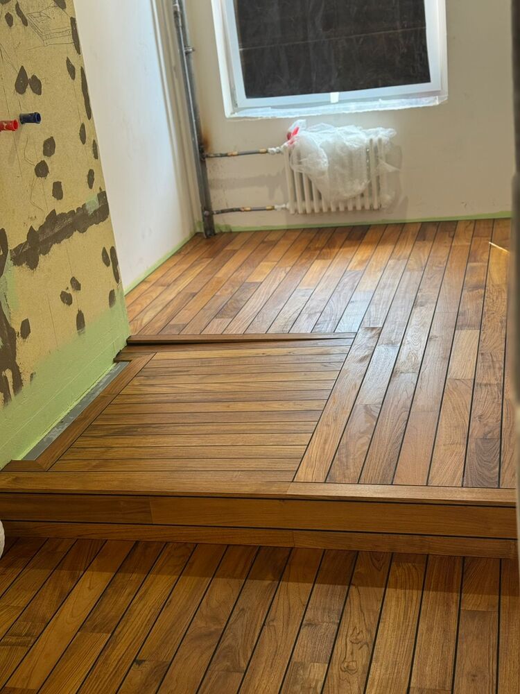 Мастера компании «Вернисаж» выполнили укладку паркета из тика на объекте на ул. Зеленогорской в Санкт-Петербурге.