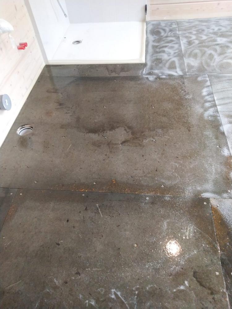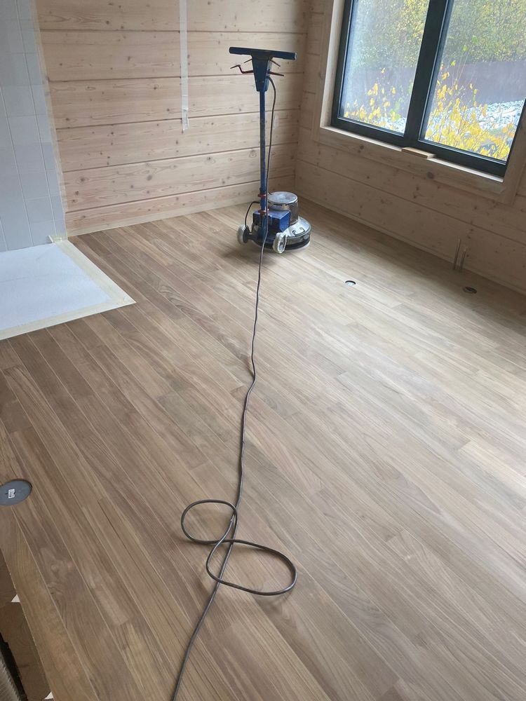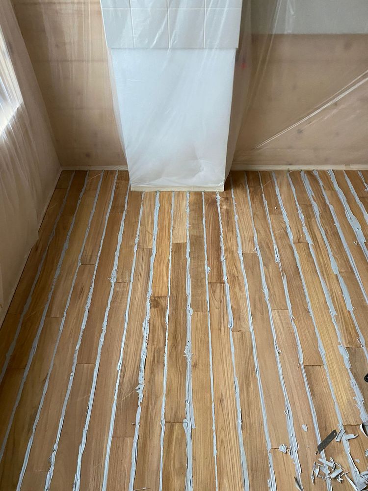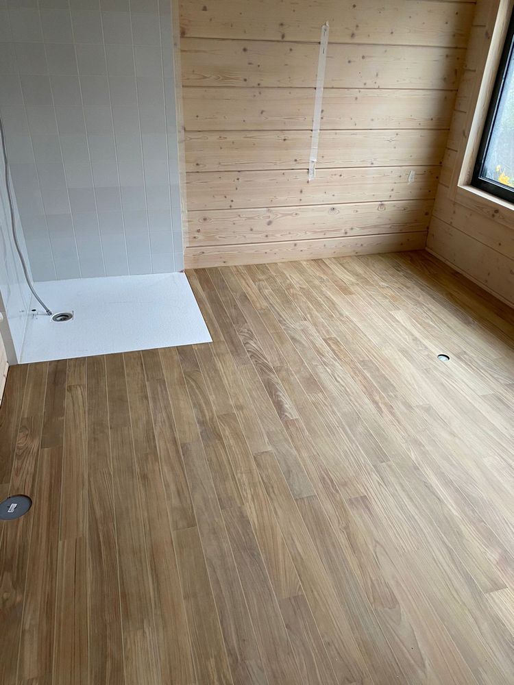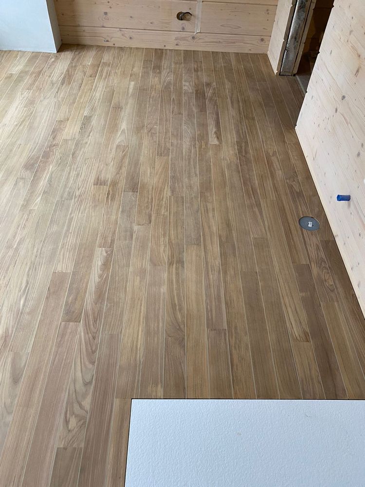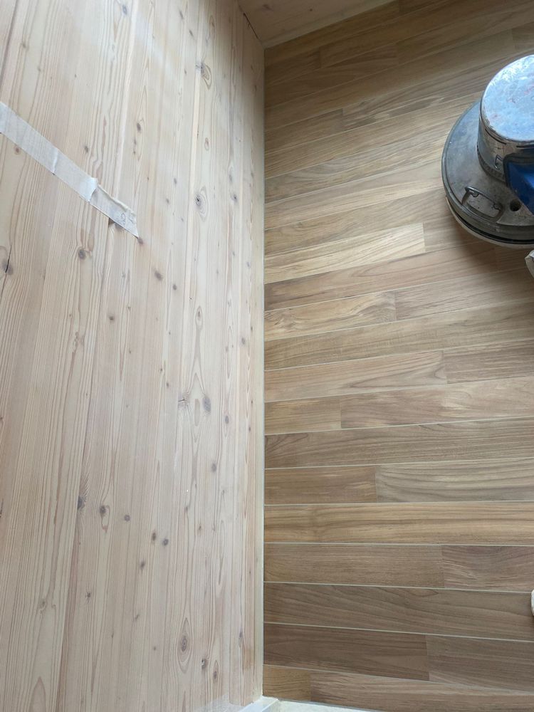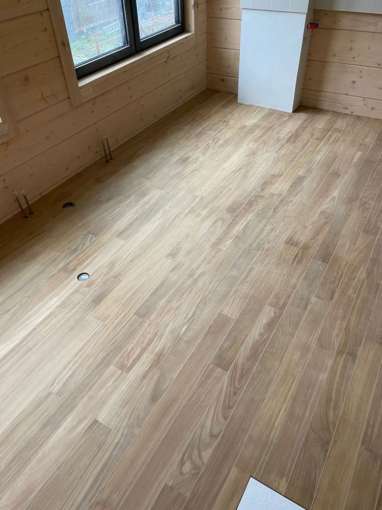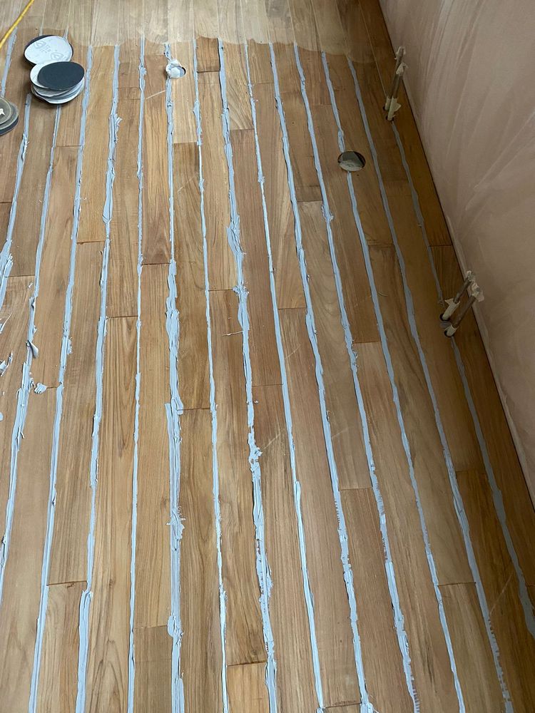 Мастера компании «Вернисаж» выполнили укладку тиковой доски в санузле в деревянном доме в ПСК Волна-Радио в Москве.