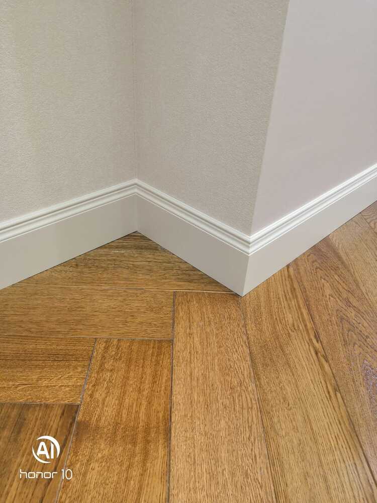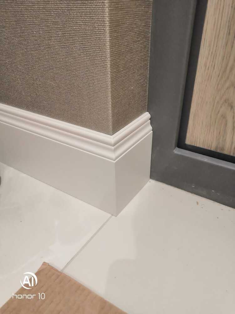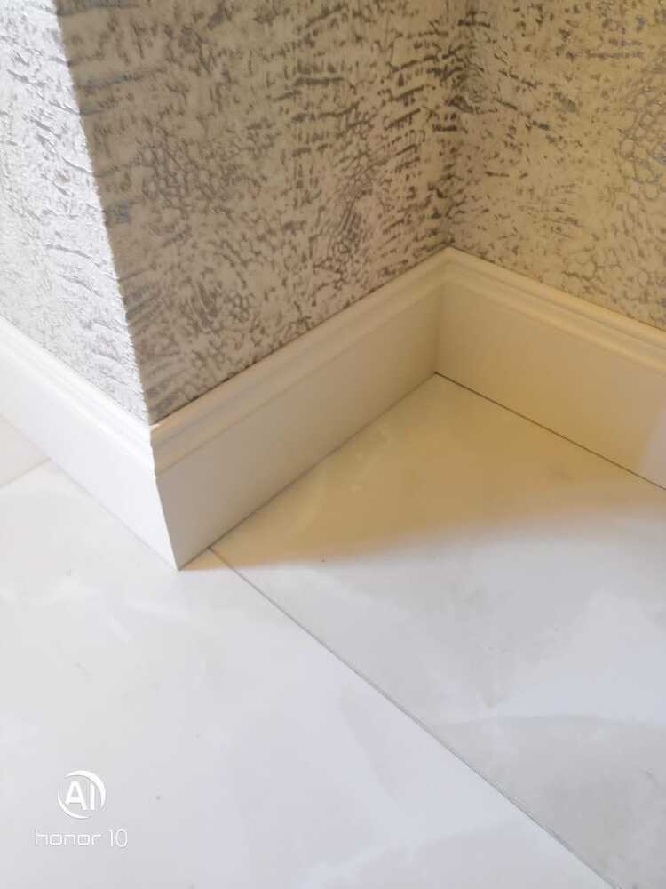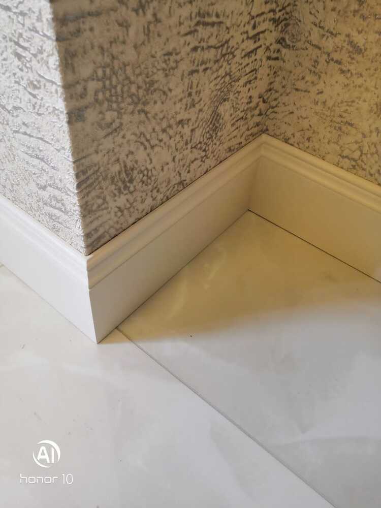 Мастера компании «Вернисаж» под руководством Максима Якушкина выполнили установку плинтусов в квартире в Санкт-Петербурге. Предварительно плинтус был изготовлен из МДФ в нашей мастерской, отшлифован, загрунтован и покрашен. На объекте плинтус напиливали необходимой длины, устанавливали и делали финишную обработку – шлифовку торцов, подкрашивание стыков. Мастера отметили, что стены, отделанные машинной штукатуркой, и полы были достаточно ровными, что значительно облегчило работу с монтажом плинтусов.