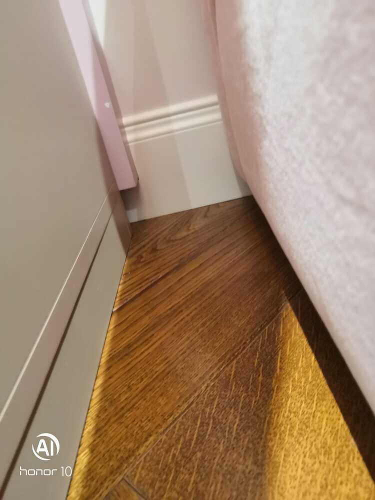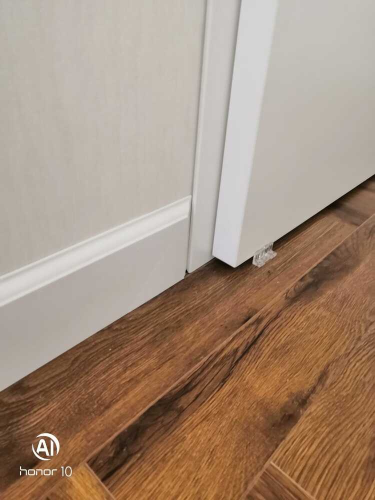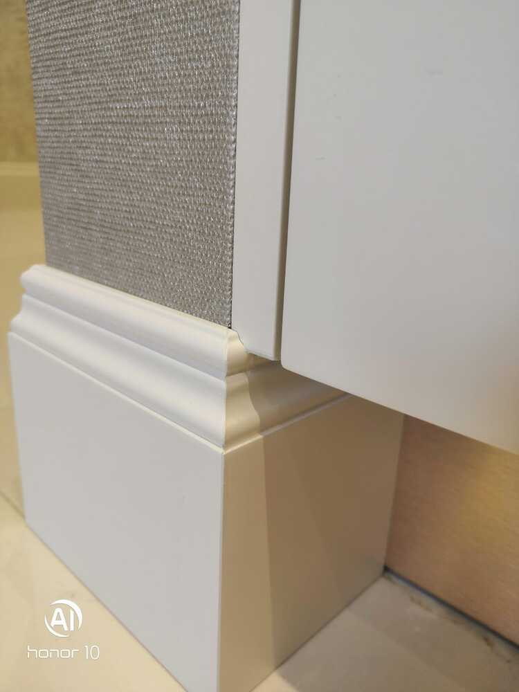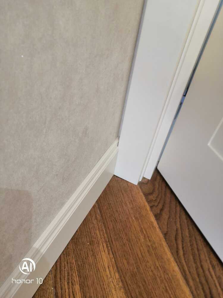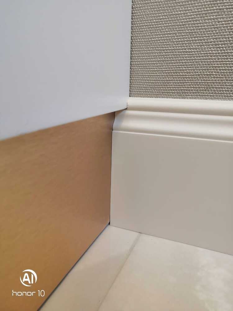 Мастера компании «Вернисаж» под руководством Максима Якушкина выполнили установку плинтусов в квартире в Санкт-Петербурге. Предварительно плинтус был изготовлен из МДФ в нашей мастерской, отшлифован, загрунтован и покрашен. На объекте плинтус напиливали необходимой длины, устанавливали и делали финишную обработку – шлифовку торцов, подкрашивание стыков. Мастера отметили, что стены, отделанные машинной штукатуркой, и полы были достаточно ровными, что значительно облегчило работу с монтажом плинтусов.