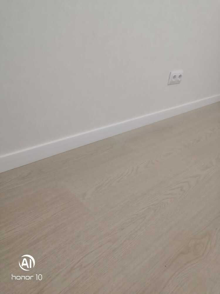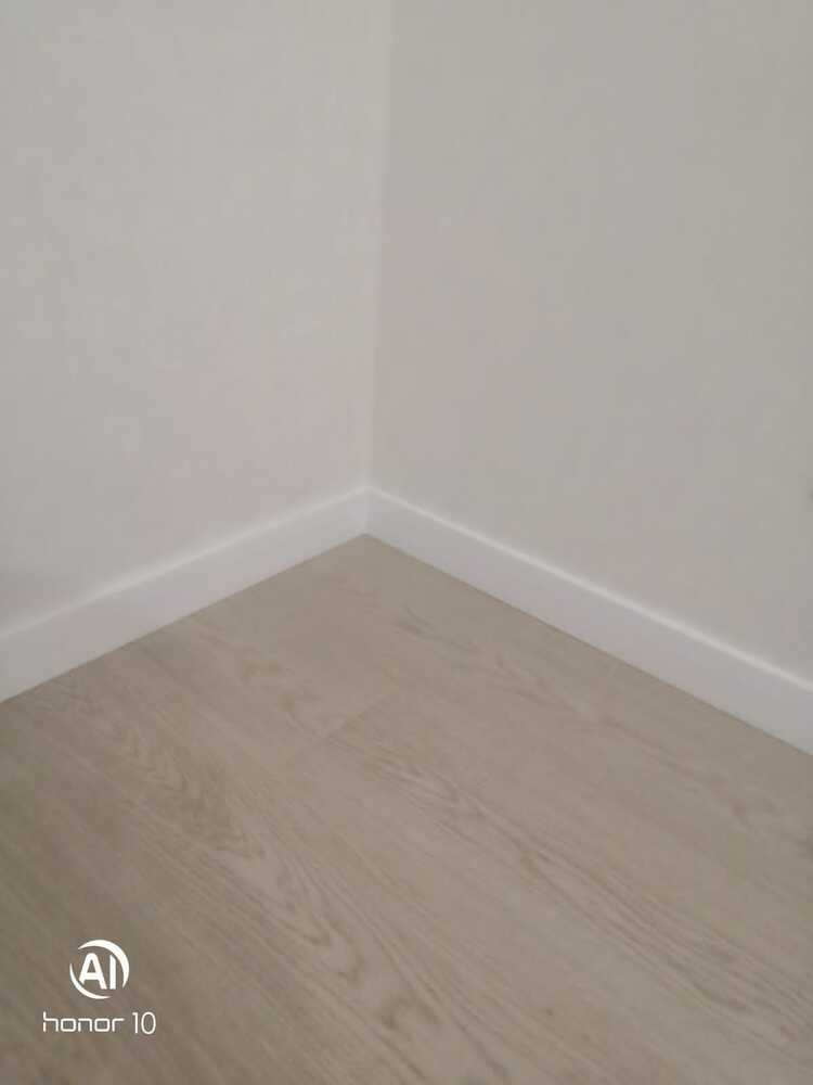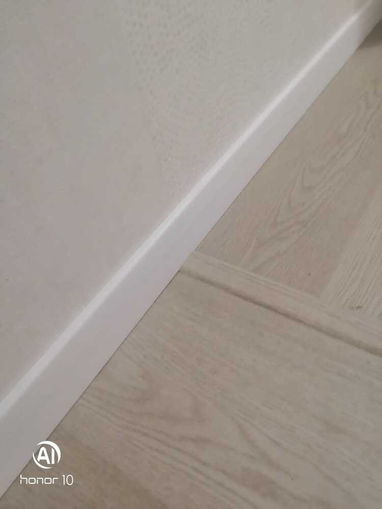 использовался пленочный плинтус из МДФ, на полу плавающим способом уложен ламинат. Столкнулись с тем, что ламинат пришлось прижимать. Также на объекте в момент установки плинтусов отсутствовали дверные наличники. Клиенты дали образец телескопического наличника, по которому мастера смогли вычислить размеры и подпилить плинтуса нужной длины.