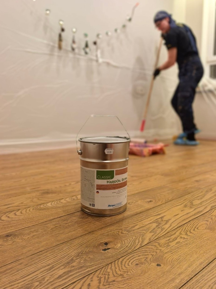 - Нанесение в 2 слоя масла с твердым воском Berger HardOil Extra