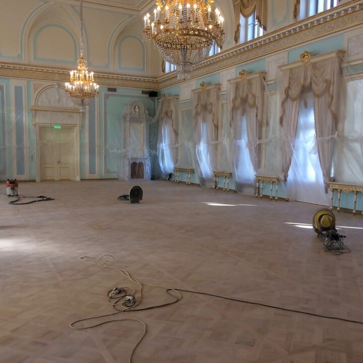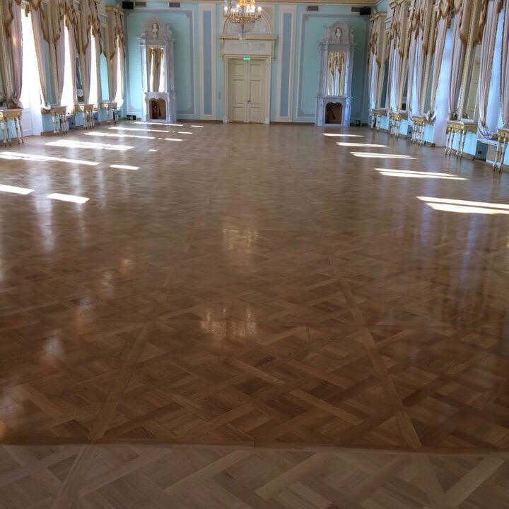 Компания «Вернисаж» выполнила воссоздание паркетных полов в Голубой гостиной, Музее Константиновского Дворца в Стрельне, а также гостевых коттеджах, входящих в дворцовый комплекс.