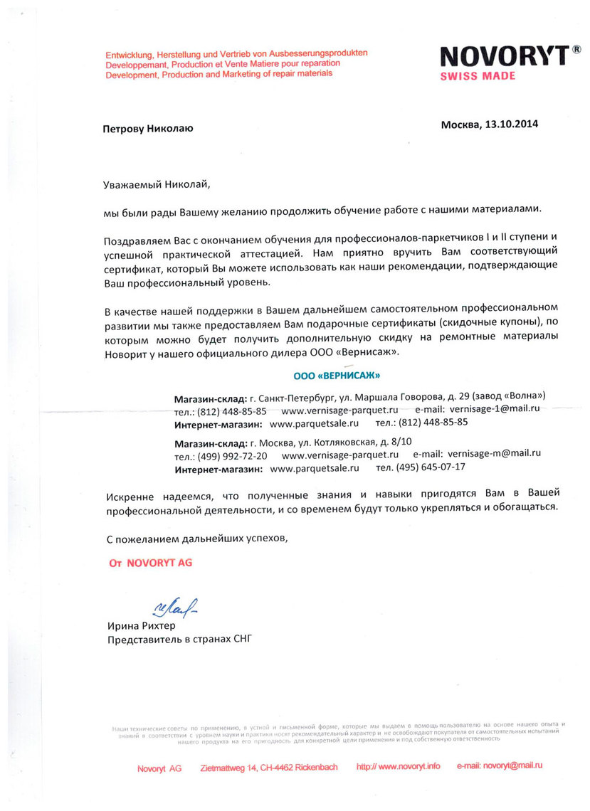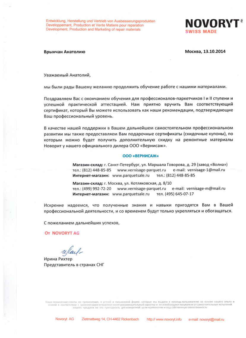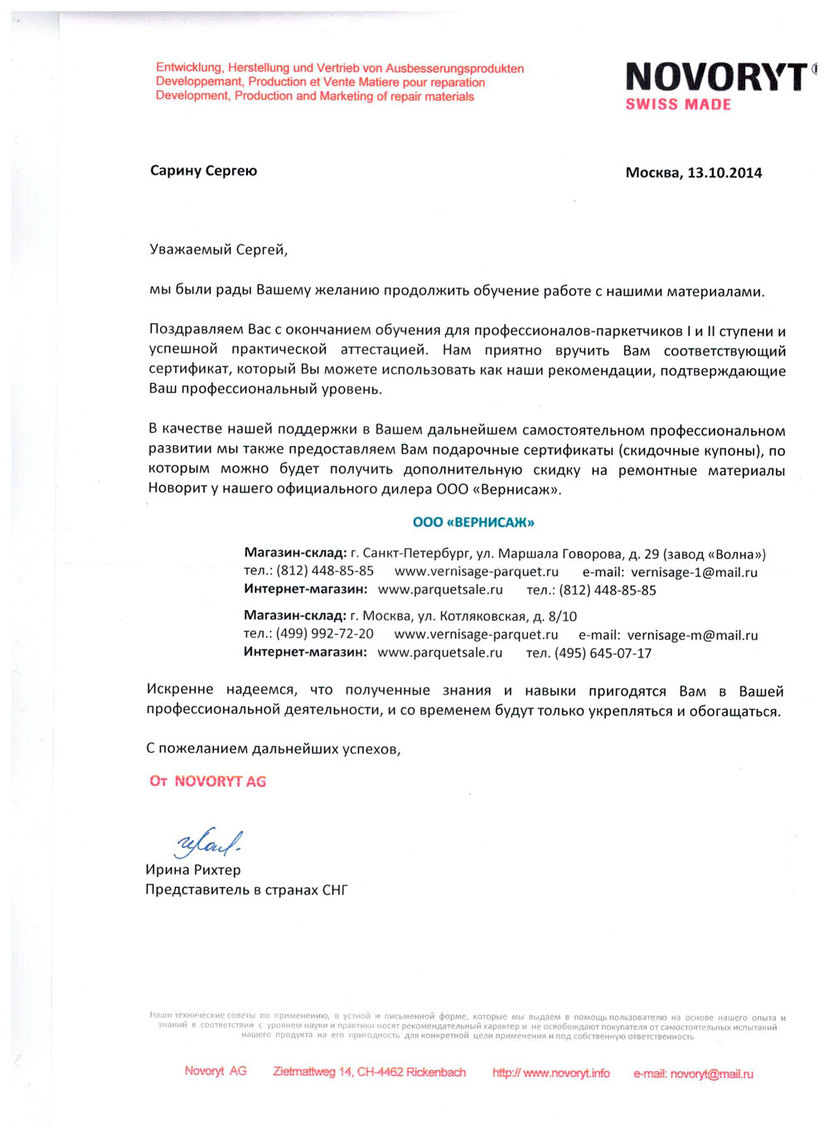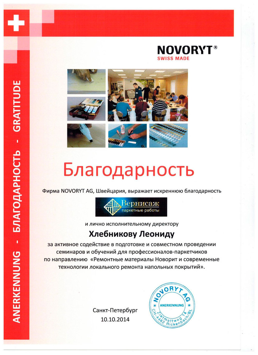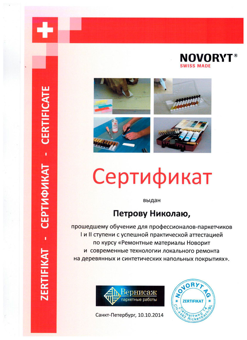 По результатам практикумов, проведенных швейцарским производителем реставрационных материалов NOVORYT на территории своего дилера – компании «Вернисаж» – самым способным и усердным семинаристам были вручены Сертификаты о прохождении обучения для профессионалов-паркетчиков Первой и Второй ступени с успешной аттестацией по курсу «Ремонтные материалы НОВОРИТ и современные технологии локального ремонта на деревянных и синтетических напольных покрытиях».