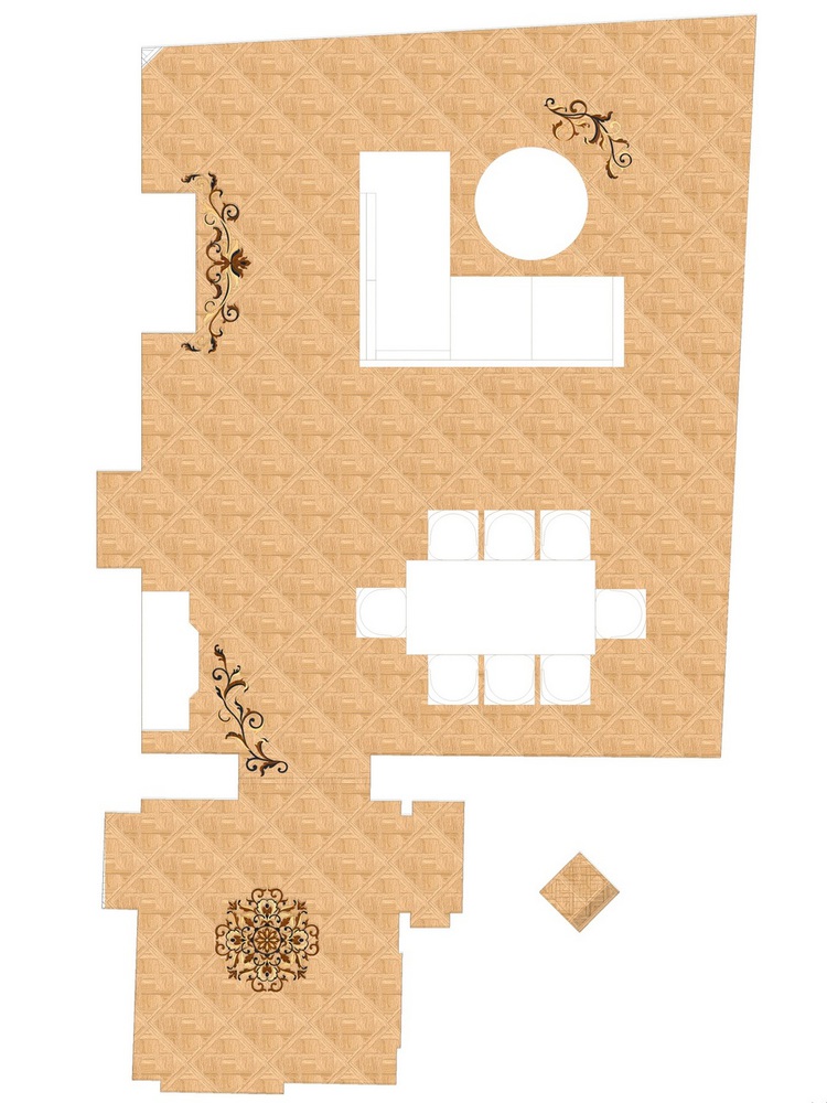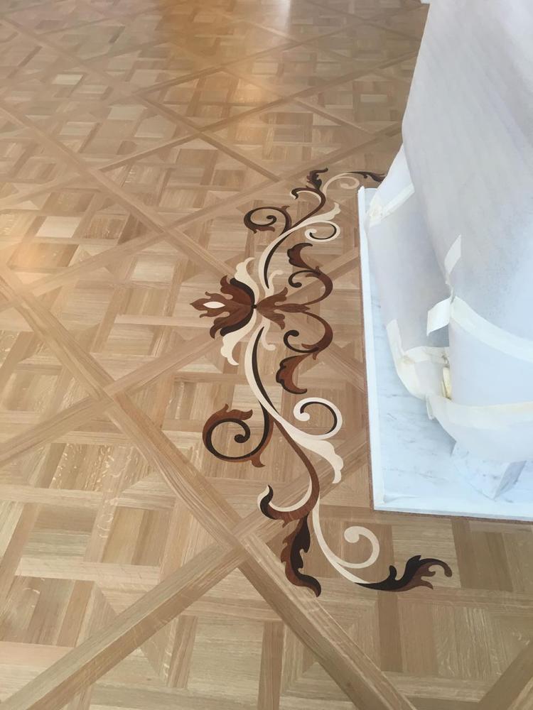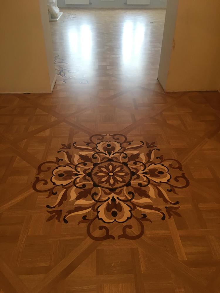 Мы выехали на объект, оценили масштабы проблемы и взялись за работу. Далее разработали новый дизайн-проект, выполнили демонтаж уже непригодного для использования прошлого паркета, зашлифовали фанеру, выполнили укладку нового паркета рисунком «Версаль» с врезкой художественных элементов. Затем провели шлифовку паркета и покрыли его лаком. Результат нашей работы смотрите на фото: