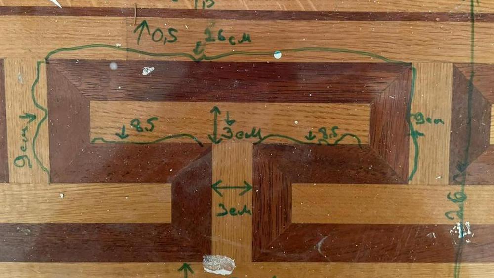 После получения точных замеров плашек мы спроектировали необходимый геометрический рисунок (а именно, «меандр»), сделали карту раскроя и напиловки бордюра. По этим данным сделали расчет необходимого материала и стоимости работ. Клиента условия устроили, мы приступили к работе, и через некоторое время новый фрагмент художественного пола был уложен нашим коллегой на объекте. Задача выполнена – паркет восстановлен, а хозяин доволен!