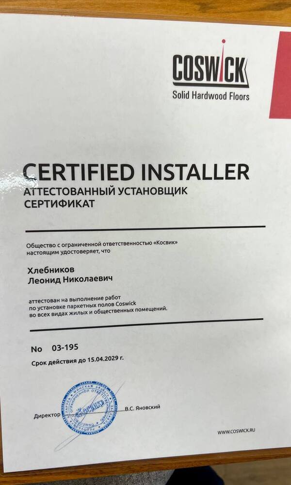 13, 14 и 15 апреля 2026 г. эксперт компании «Вернисаж» Леонид Хлебников провел на белорусском заводе, производящем широкую линейку паркета Coswick. По приглашению завода Леонид прошел обучение, программа которого включала вопросы технологии укладки паркета, обслуживания, реставрации, выбора паркетной химии для монтажа.