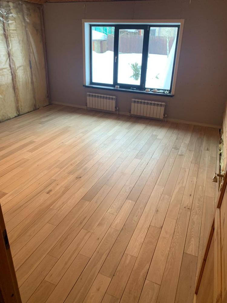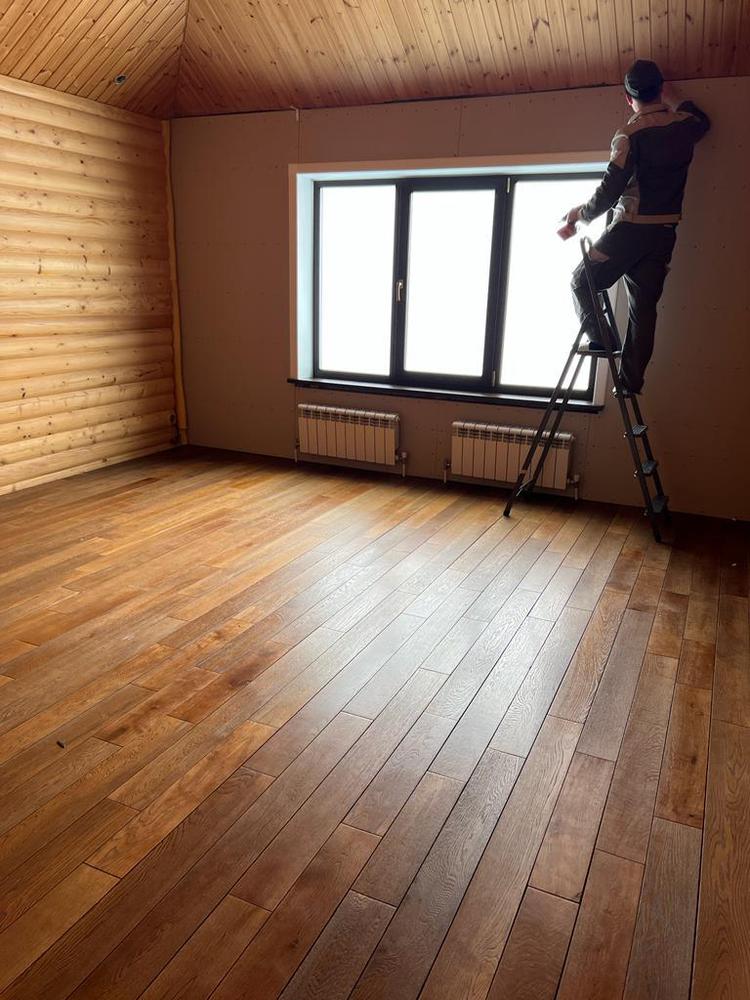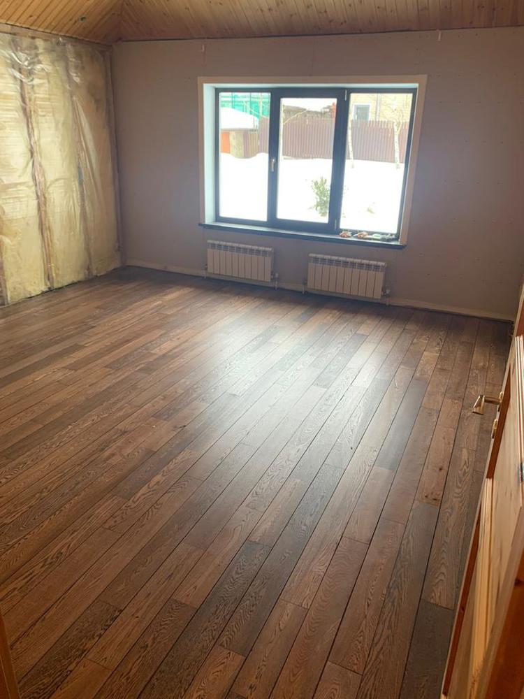 - Сделали пробные выкрасы для подбора цвета паркета – по замыслу дизайнера решили обновить не только поверхность, но и цвет древесины,