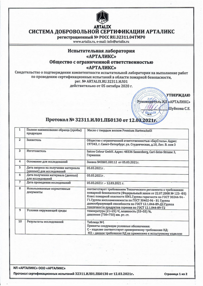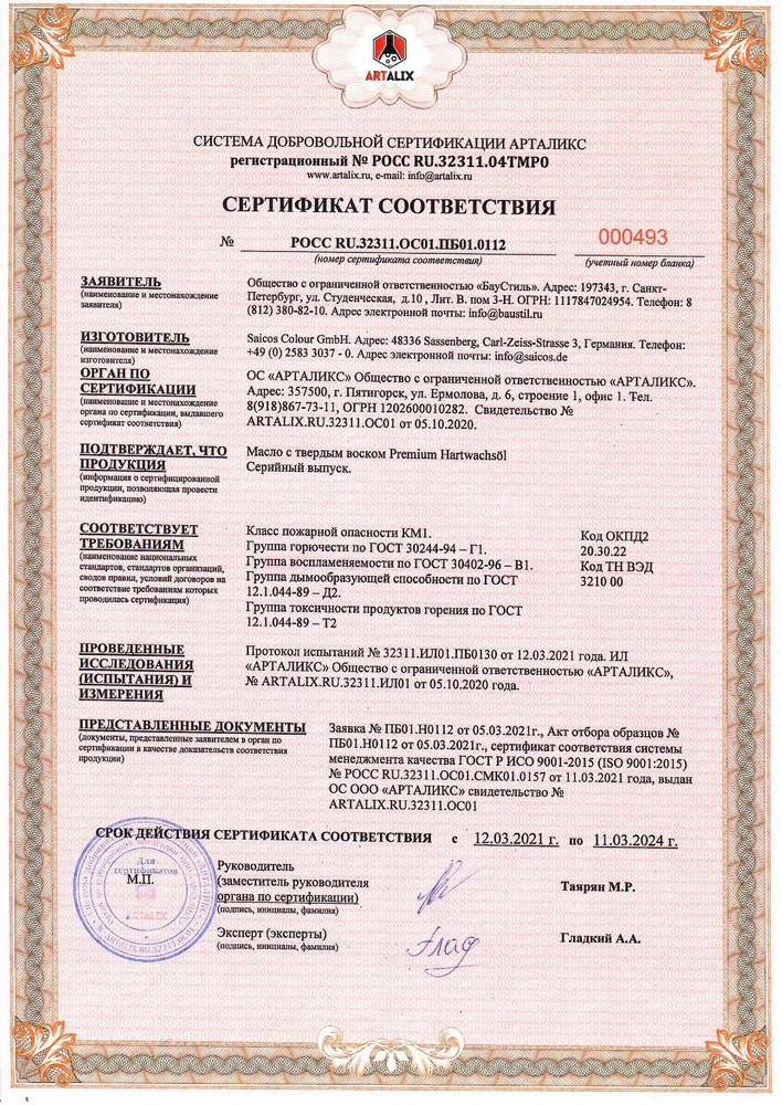 Уважаемые клиенты и партнеры! Рады сообщить вам, что масло с твердым воском Saicos Premium Hartwachsöl, которое мы активно применяем для покрытия паркета и других деревянных полов, теперь имеет сертификат пожароопасности класса КМ 1. Такой сертификат получают покрытия, которые соответствуют ряду требований, регламентирующих применение в помещениях с большой проходимостью (больницы, школы, детские дошкольные учреждения и т.п.).